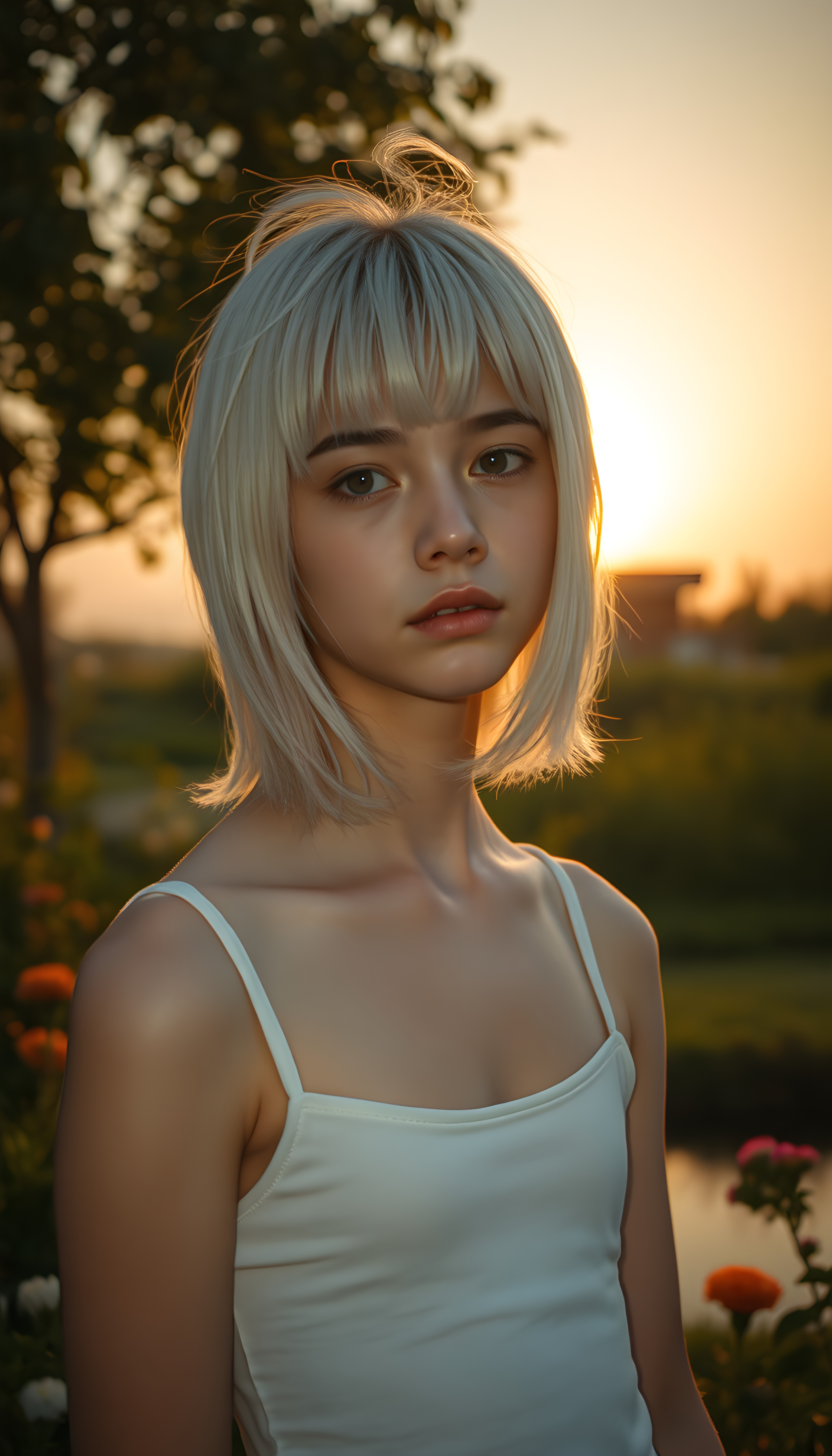 A cinematic scene featuring a young girl with a side-perspective hairstyle adorned with bangs and flowing white hair. She has an angelically perfect facial structure and wears a super short, plain fine tank top. The backdrop is a softly glowing, side-perspective sunset, casting a warm, golden hue over the landscape. The scene is set in a tranquil garden with lush greenery, flowers, and a serene pond reflecting the sunset. The overall atmosphere is peaceful and dreamy, with soft lighting and a harmonious color palette.