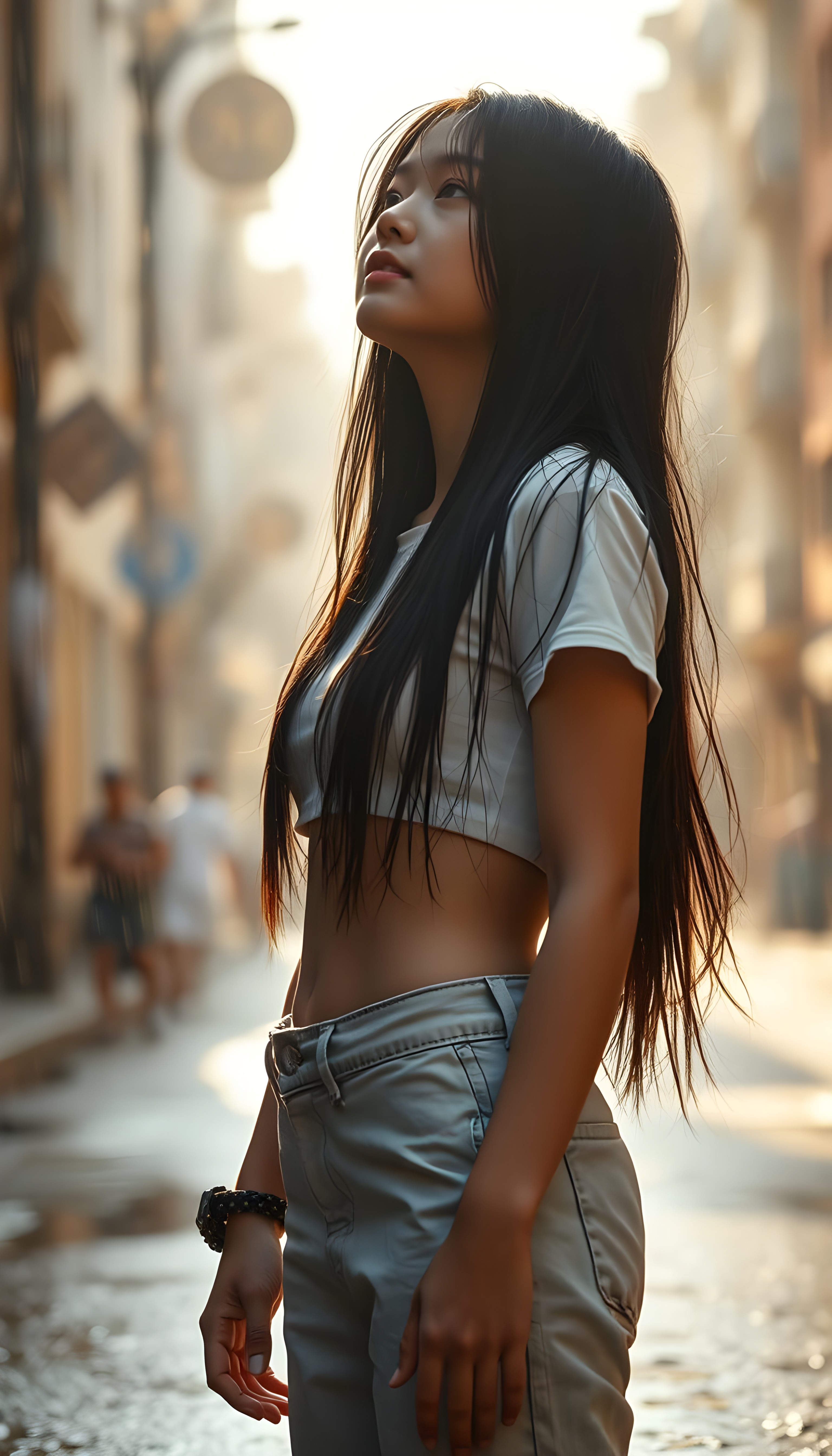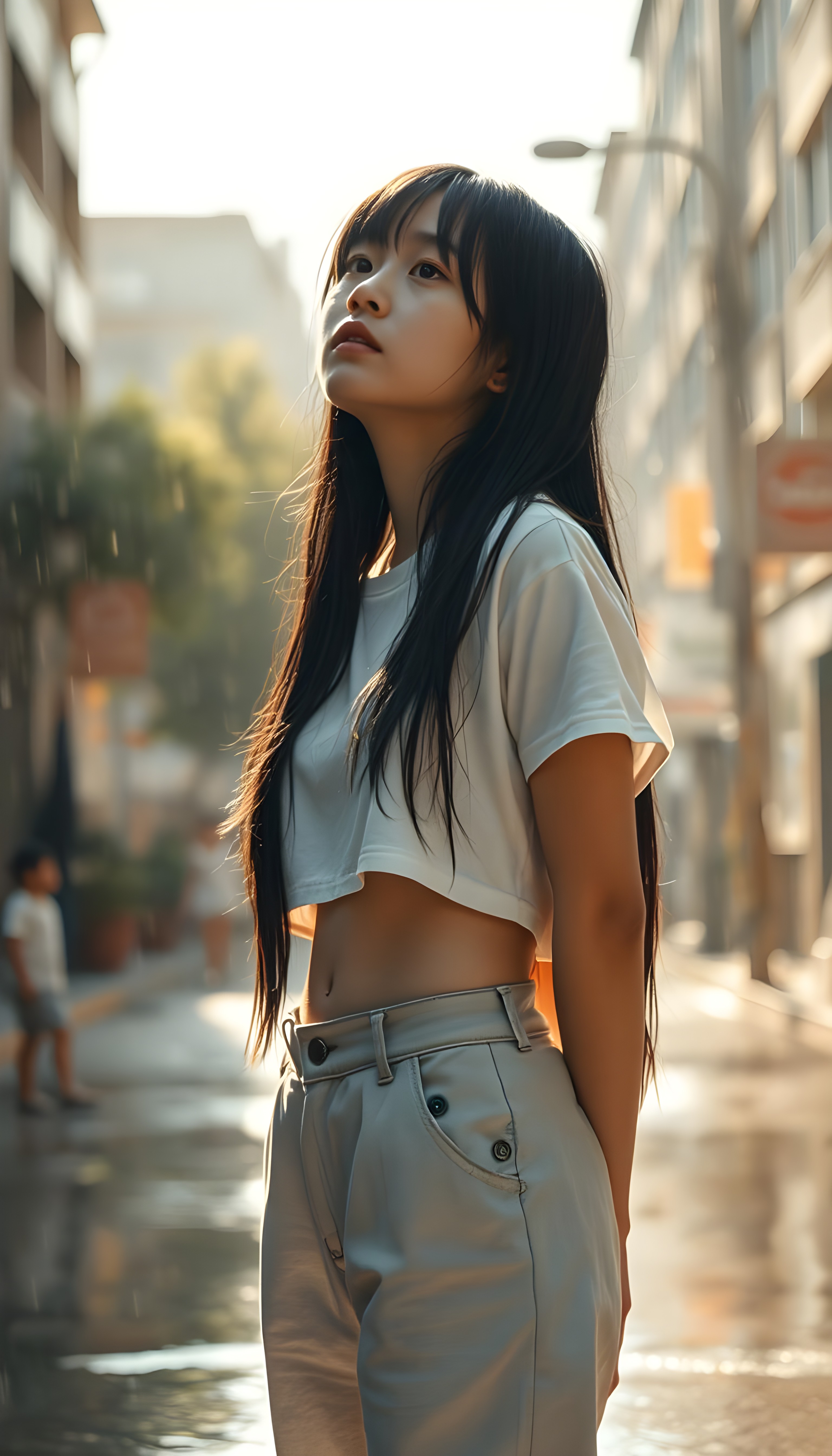 A young girl stands alone on a sun-drenched summer street, her light grey pants and white wet cropped t-shirt clinging to her skin as heavy rain soaks her. Her long, straight black hair cascades down her back, contrasting with her pale skin and the dark, wet strands framing her face. She looks up at the sky, her expression a mix of introspection and vulnerability. The background is a blur of warm, golden light, with raindrops catching the sun and sparkling like diamonds. The scene is serene yet melancholic, with the girl’s solitude emphasized by the quiet, rainy atmosphere. Front view.