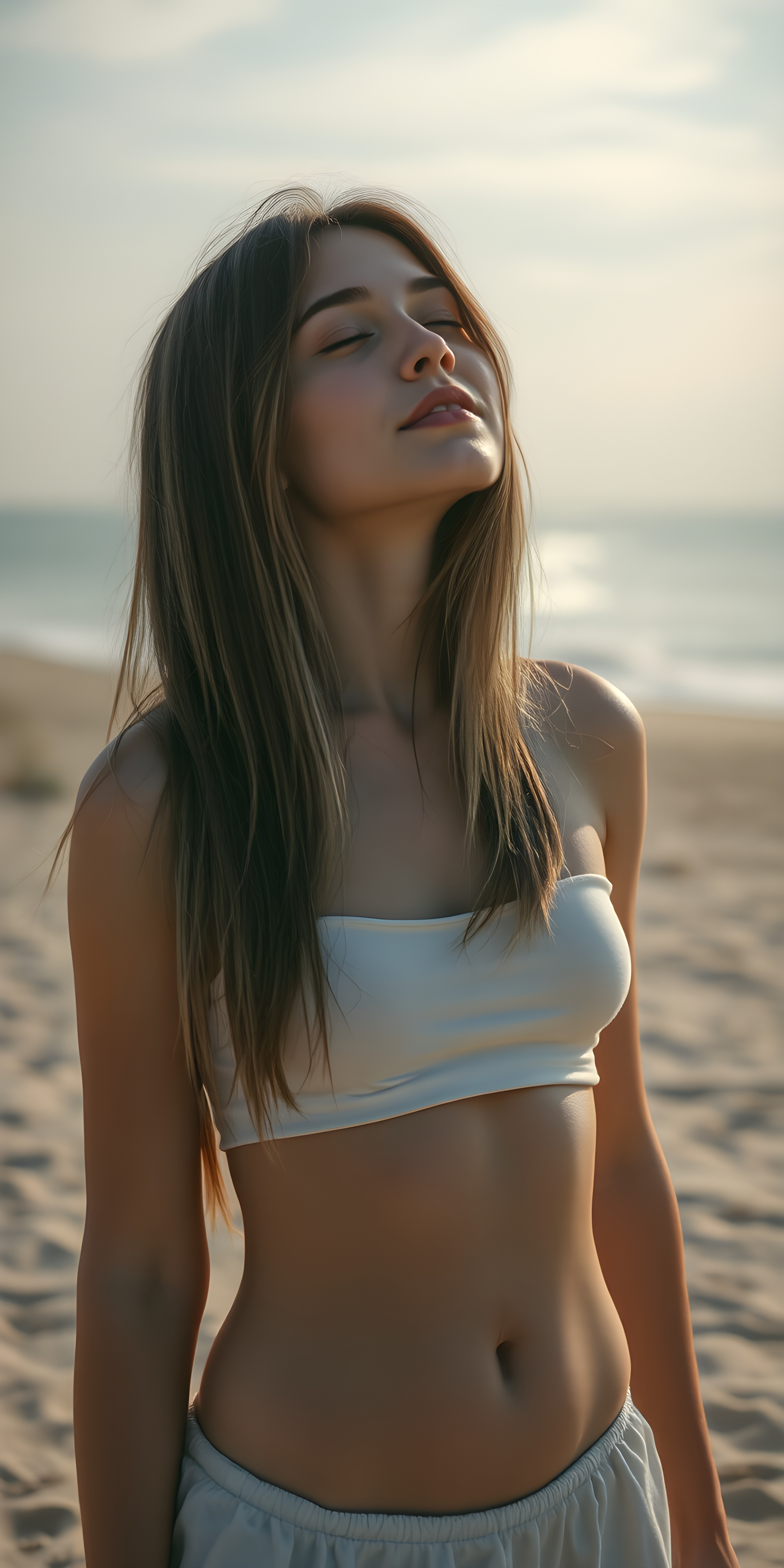 a fantastic pretty sun kissed girl standing on a lonely beach. She is wearing a short round mini skirt and a cropped tank top, closed eyes, looks up, long straight open and soft dark hair with blond highlights falls down same length, cute round belly button