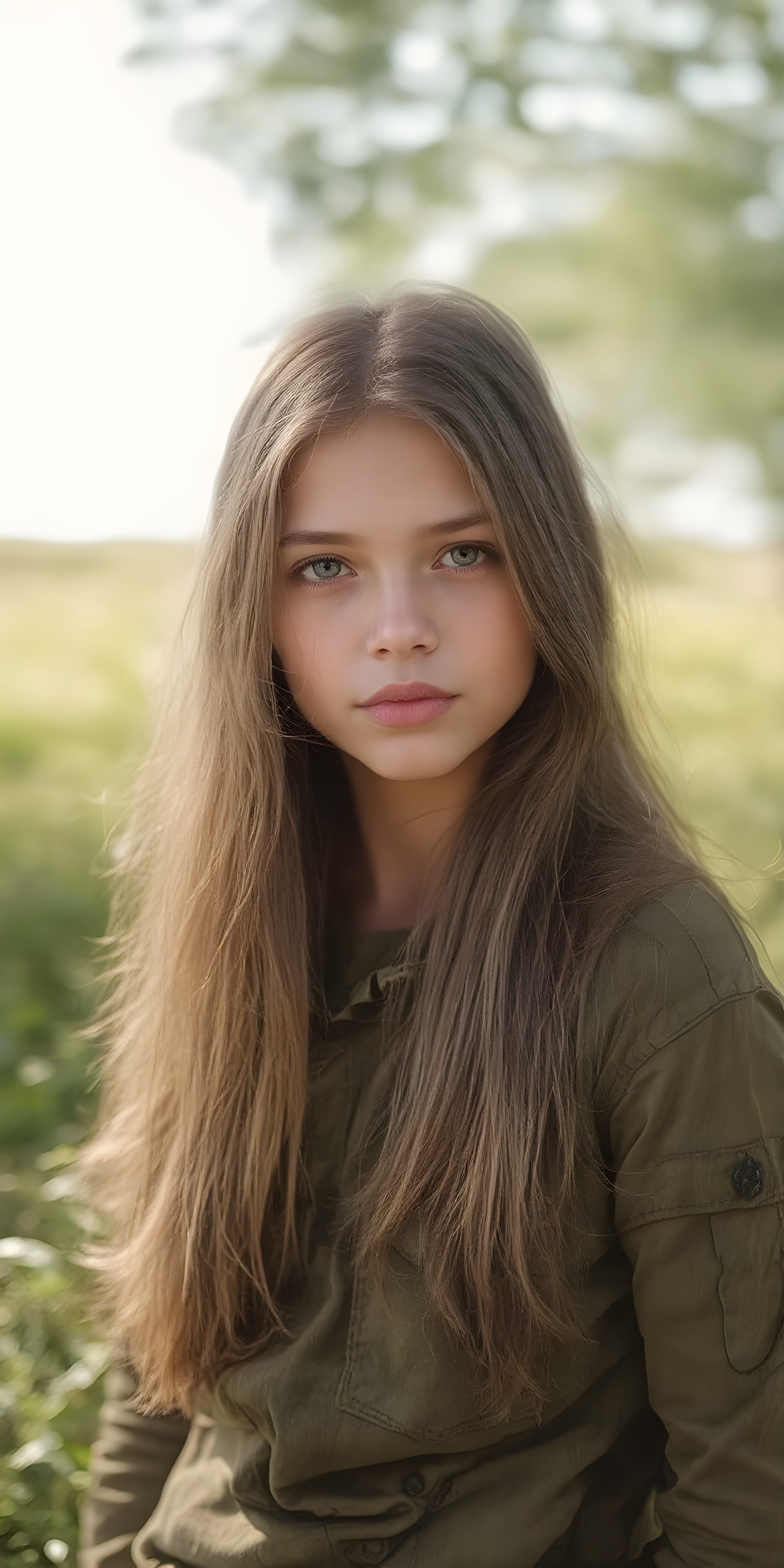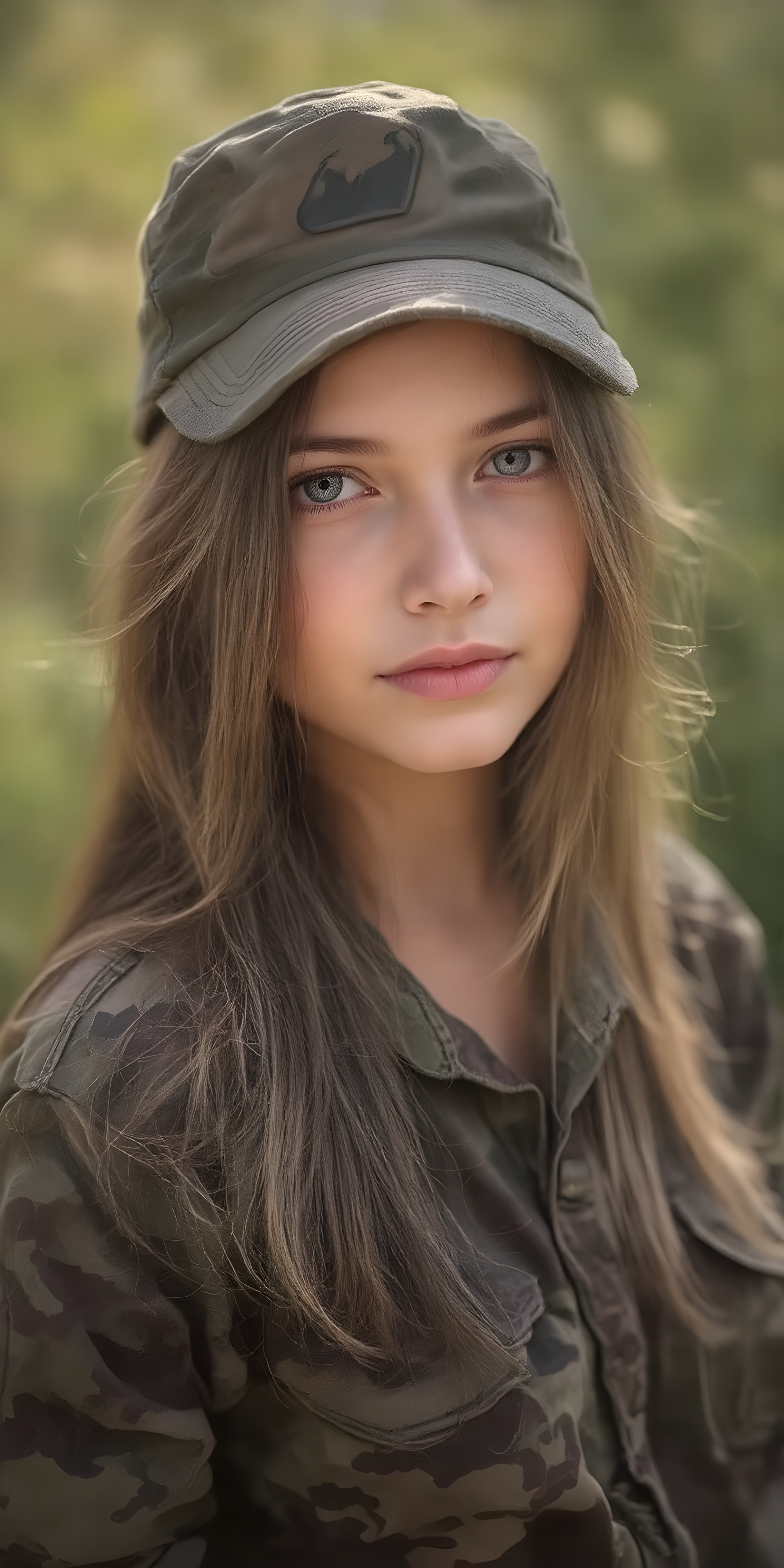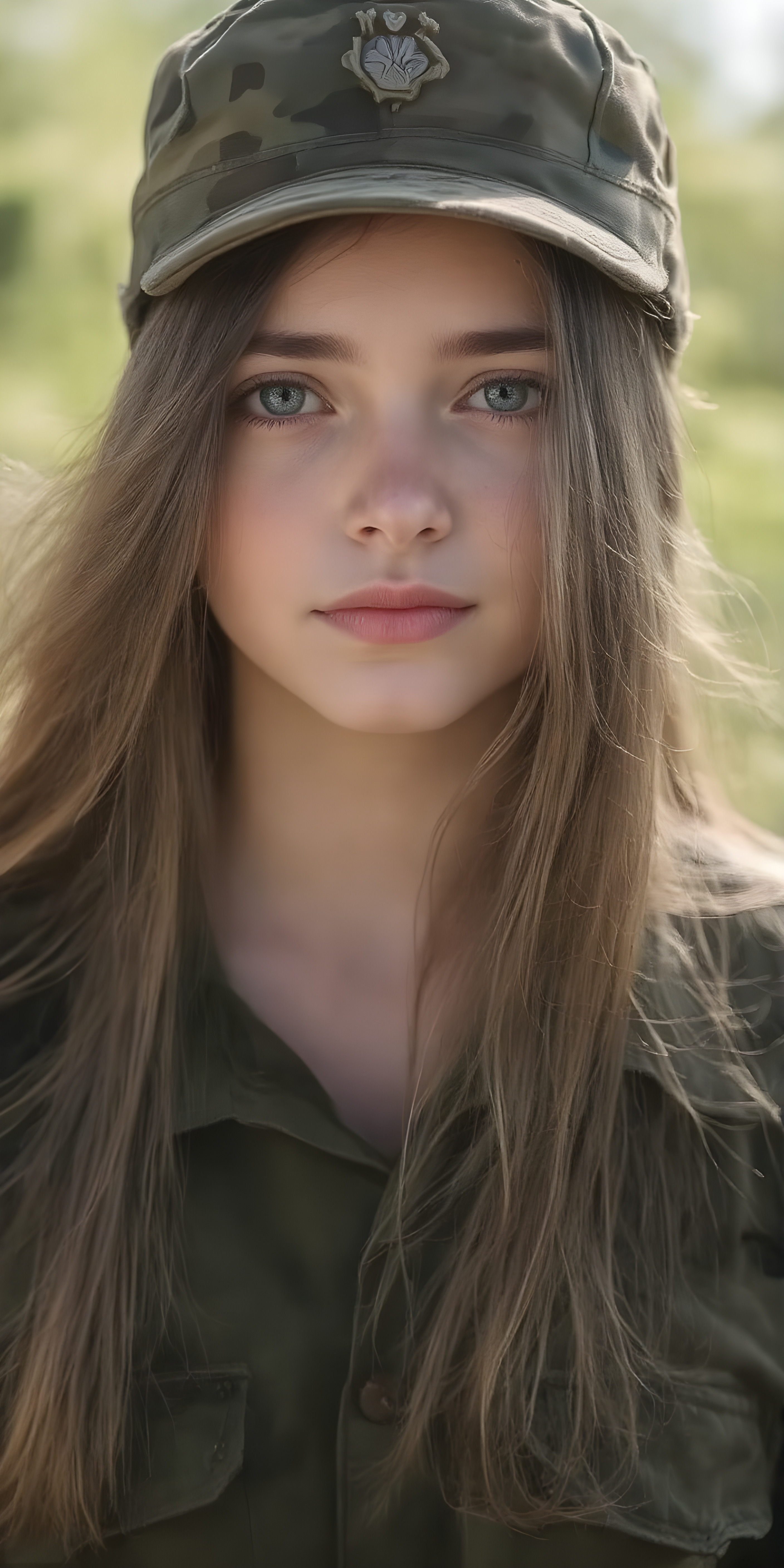 a breathtakingly beautiful (((portrait))), showcasing a young army girl in camouflage, long straight hair, exudes an air of playful imagination and creativity, perfectly capturing the essence of a dreamlike beauty. Full body view all against a sunny green backdrop in nature