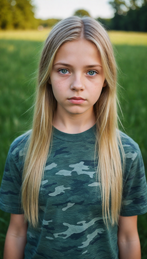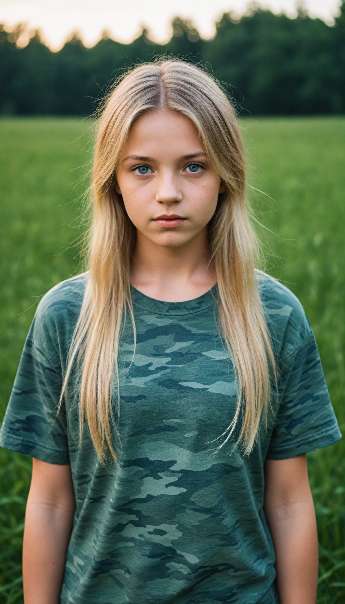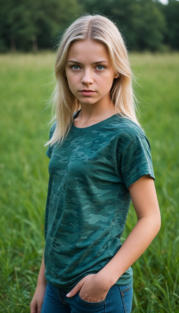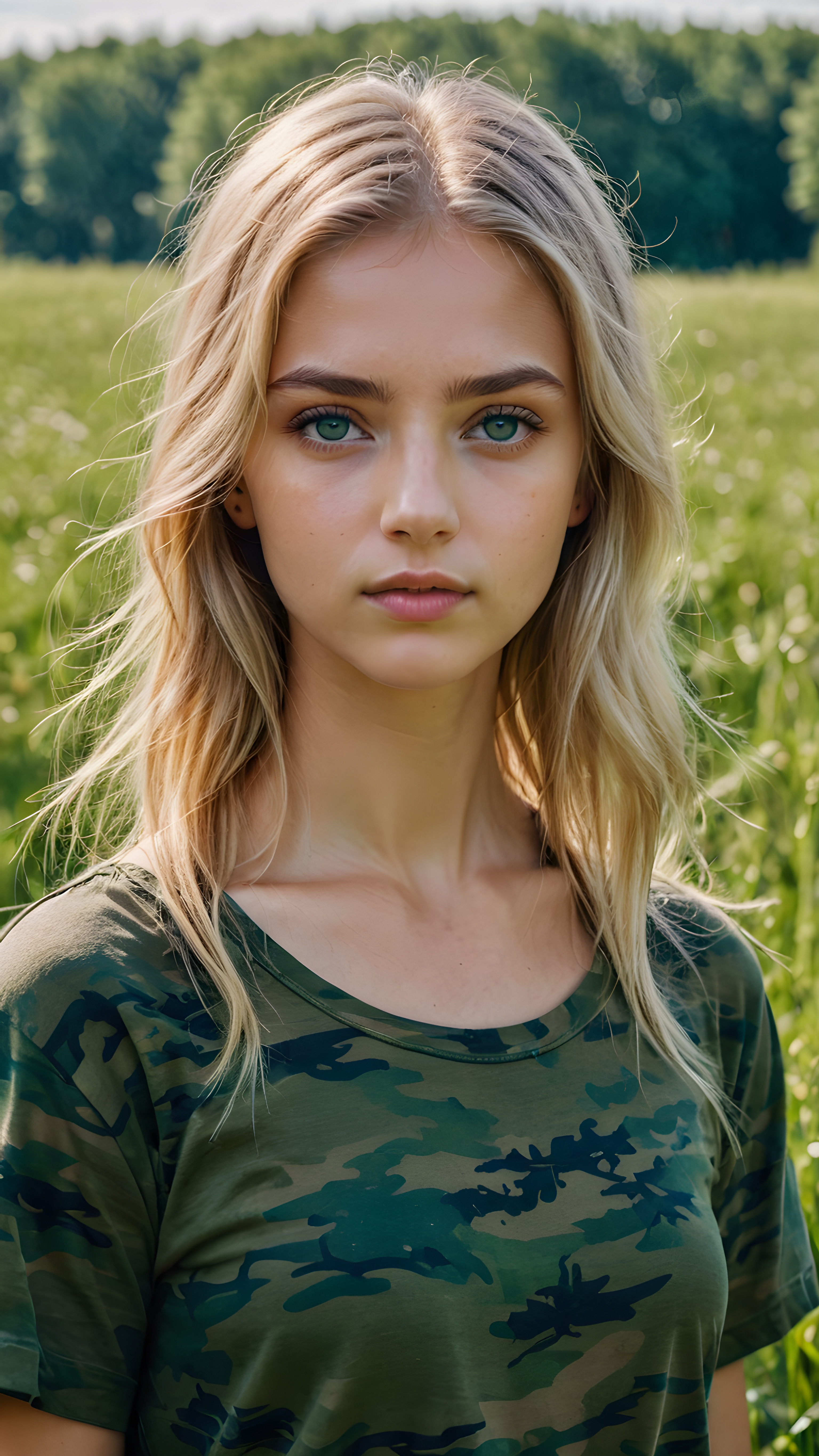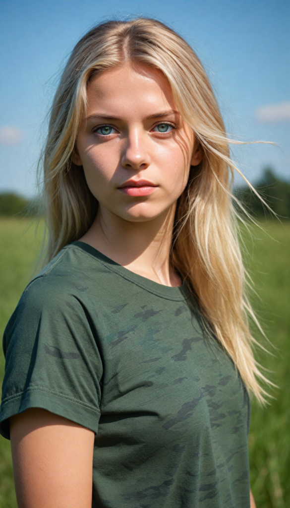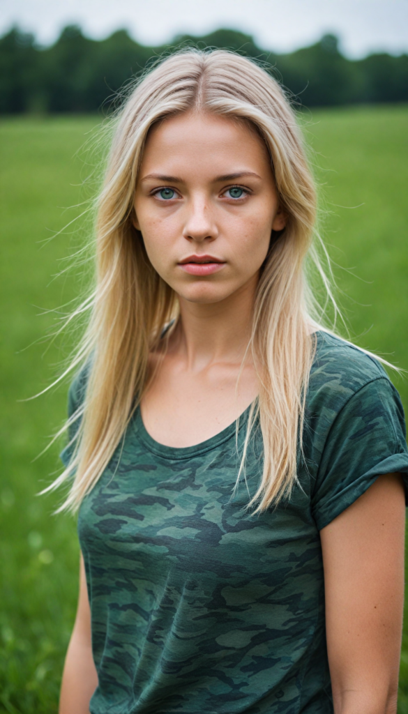 a young Ukrainian girl, plain t-shirt in camouflage, straight flowing light blonde soft hair, blue eyes, looks sadly at the viewer, ((perfect detailed photo)), she stand in a green meadow