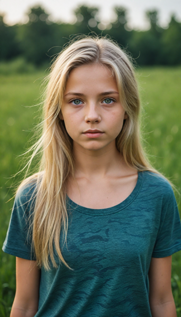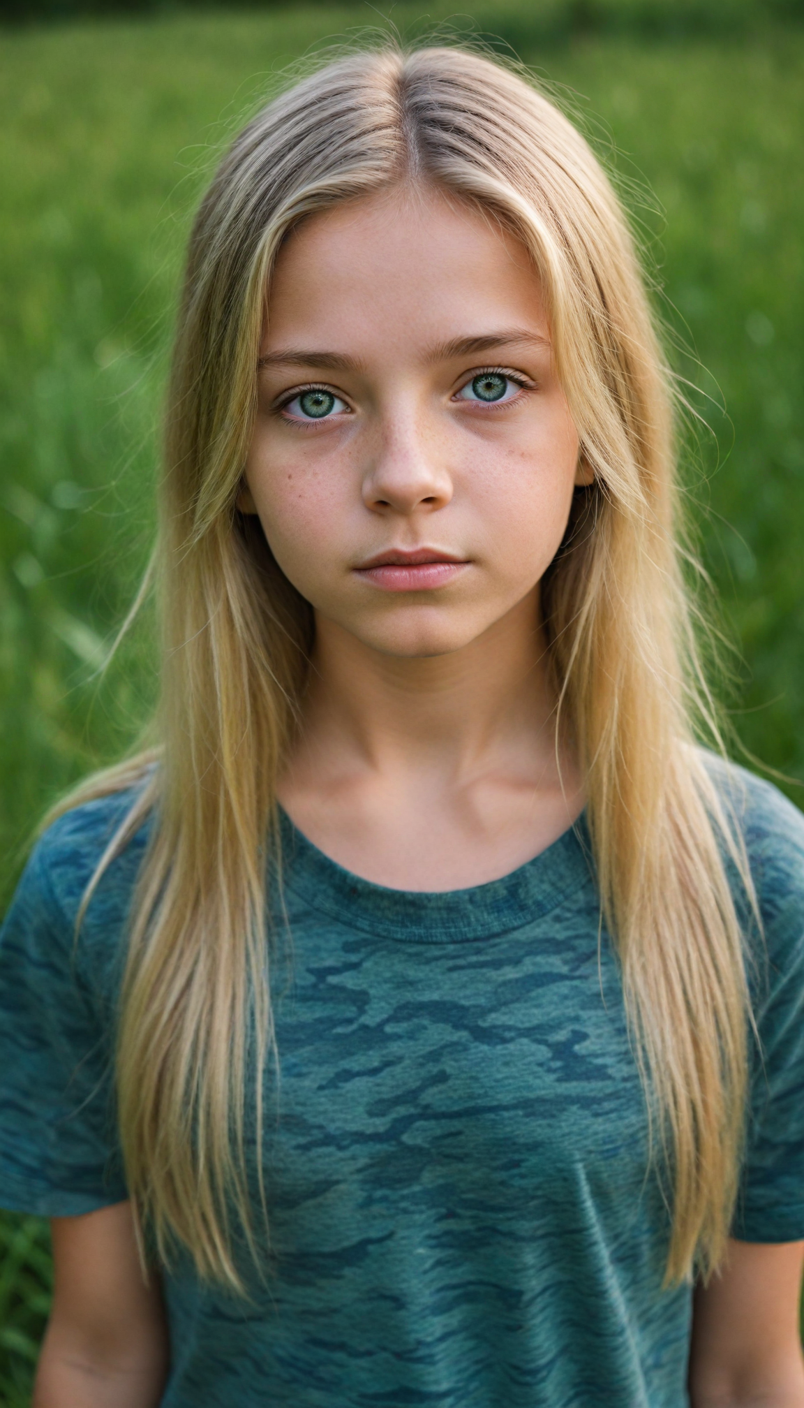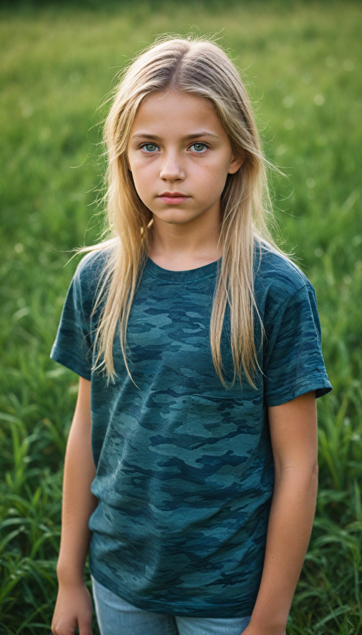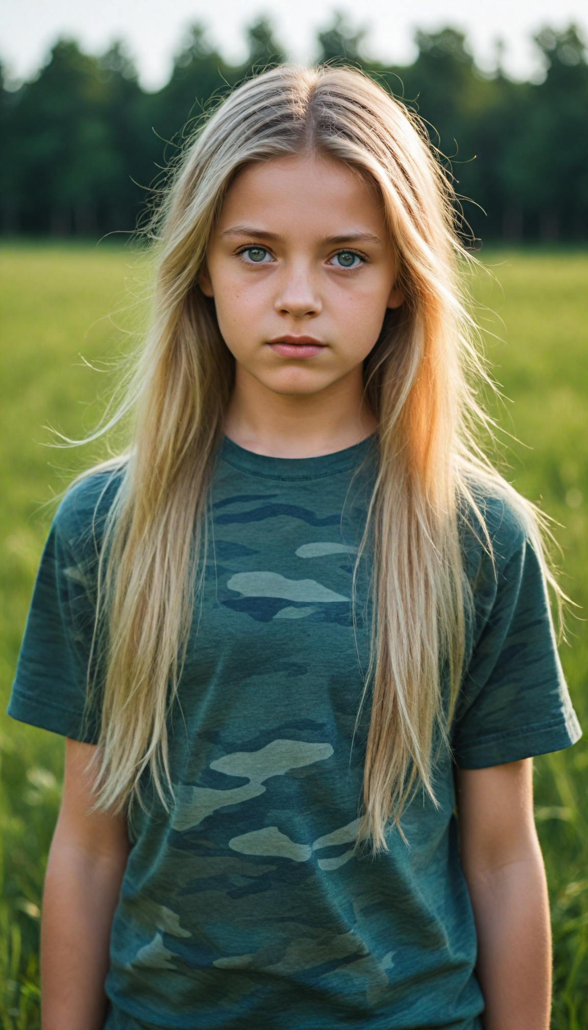a young Ukrainian girl, plain t-shirt in camouflage, straight flowing light blonde soft hair, blue eyes, looks sadly at the viewer, ((perfect detailed photo)), she stand in a green meadow