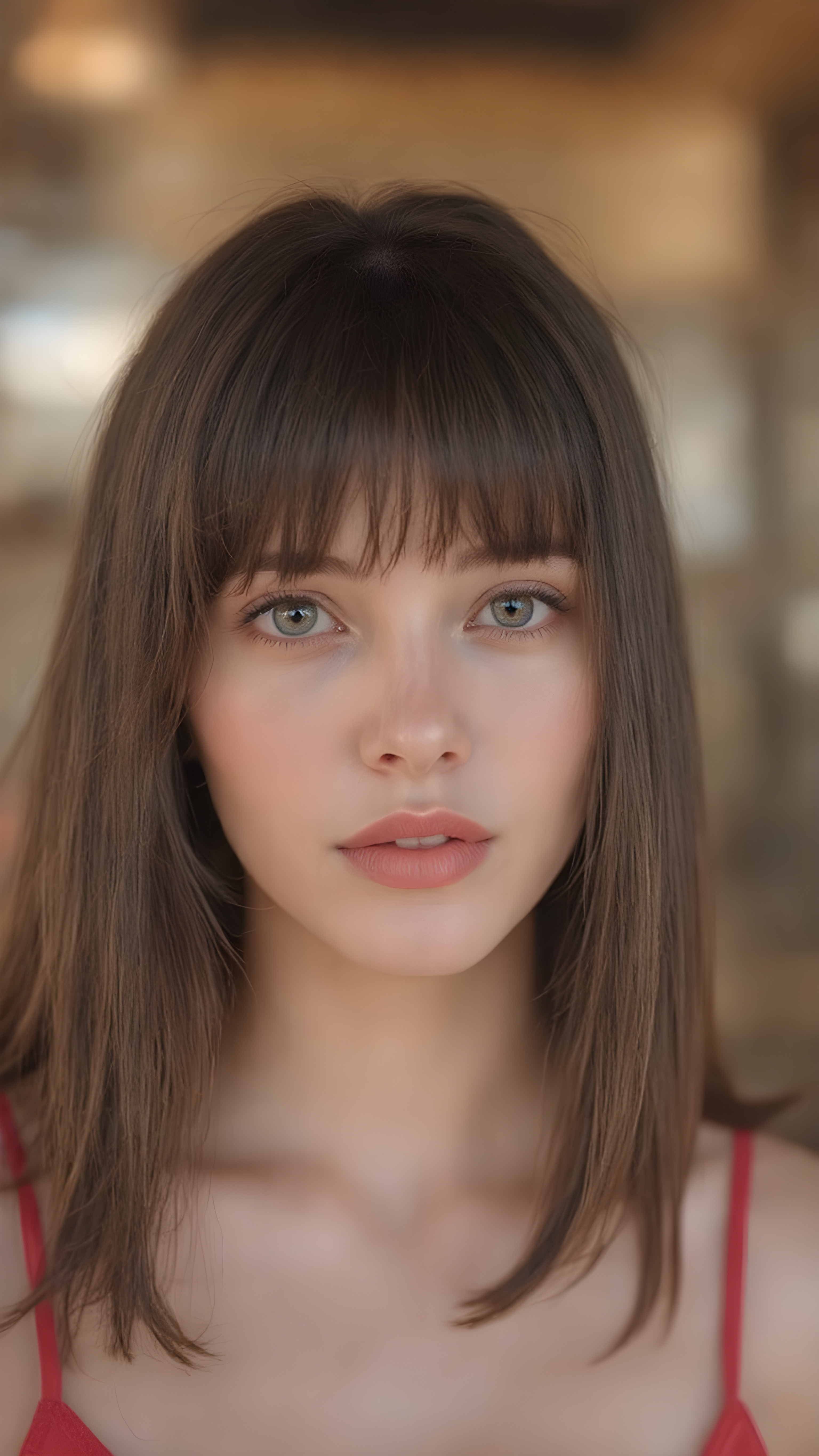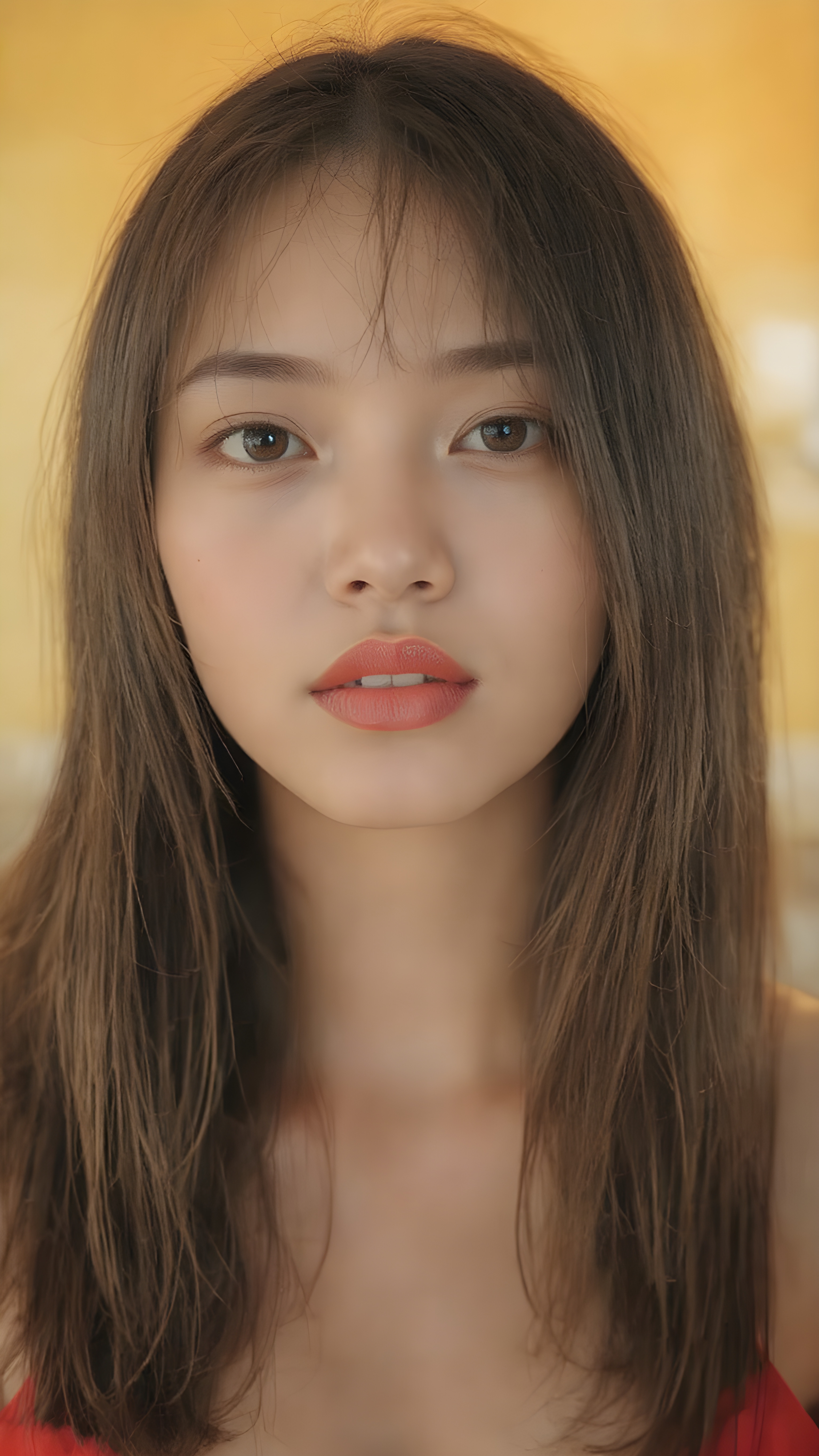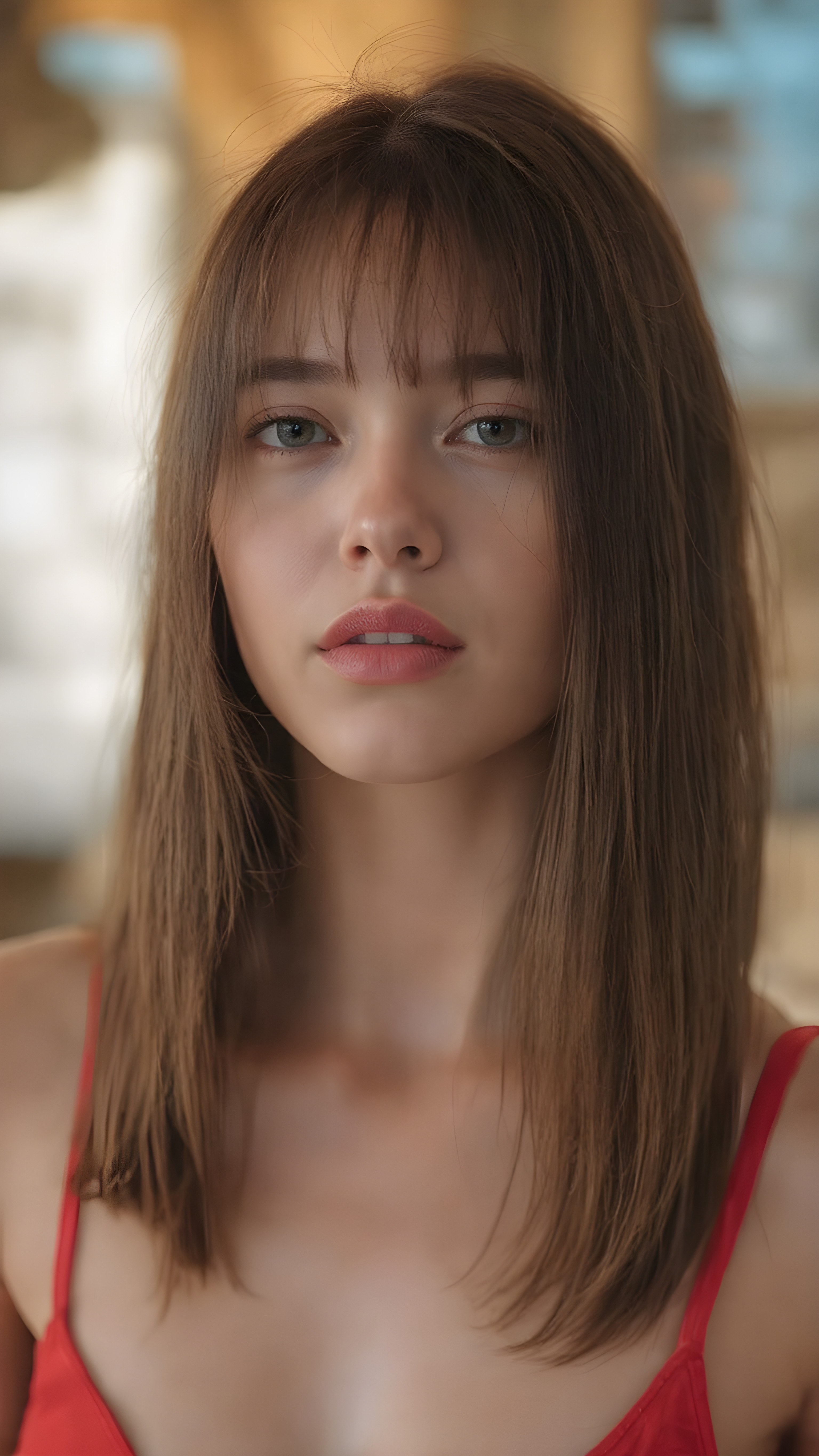 a hyper realistic version of myself, with straight, thick, slightly black red hair that reaches just above the shoulders, and glossy, plump, big red lips that are slightly parted. She wears a super realistic, flared and slightly transparent sleeveless thin strap crop top in copper red color that goes down to her thighs. The hair is straight with a slightly wavy pattern, while the lips are a light red color and are slightly parted. The face is flawless, with clear skin and a healthy glow, and the cheeks are slightly rosy. The overall look is natural and tasteful, with emphasis on the lips and skin texture. The focus is on the entire face, with a front view that captures the natural beauty of the skin and hair. The background is slightly blurred, with a golden hue that gives the image a warm and inviting feel. She poses slightly looking into the camera, with a natural expression that is in line with the overall aesthetic of the image.