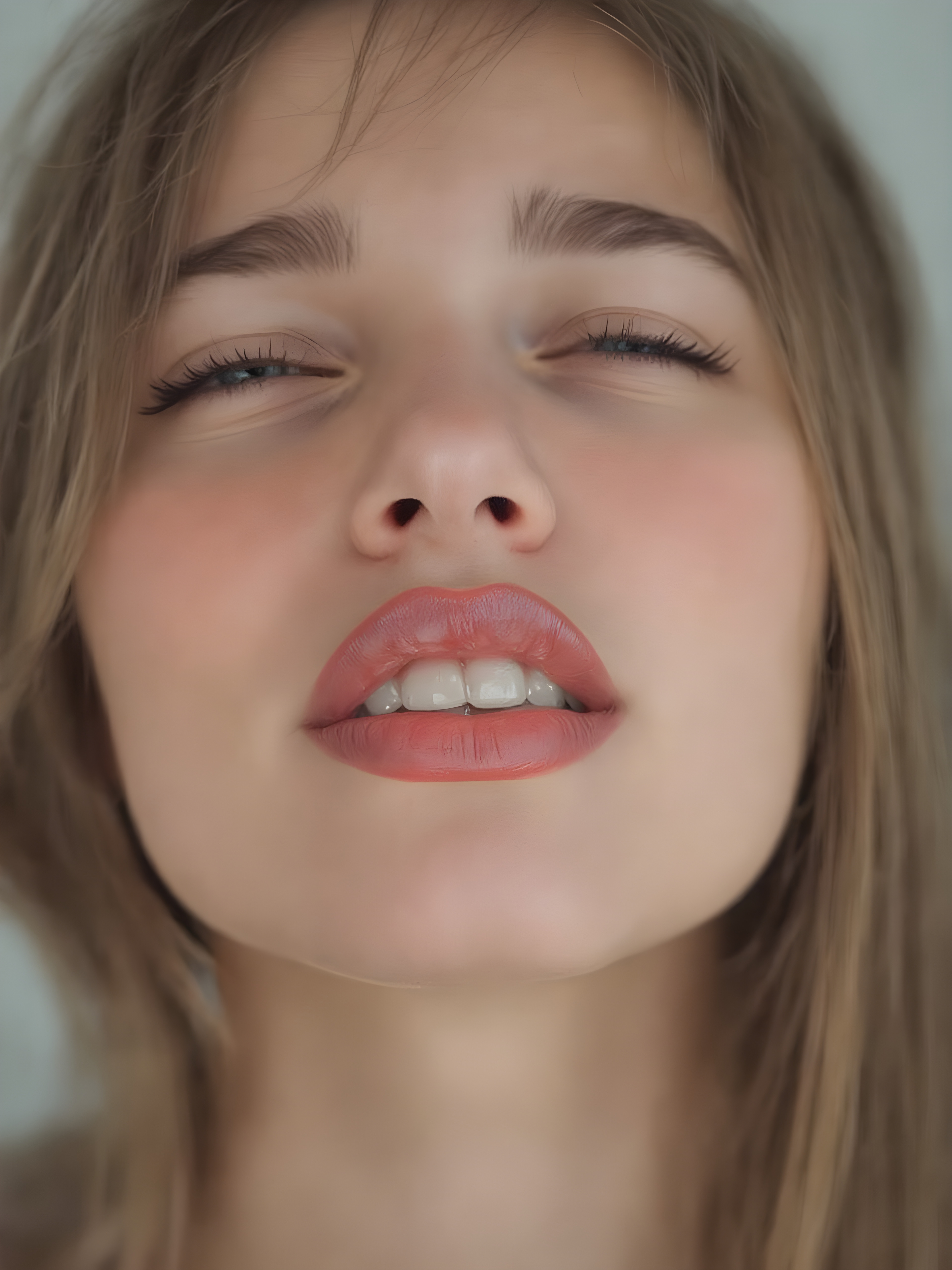((centered portrait)) a beautiful young woman with plump, full kissable red lips, a gentle face and fine, straight brown hair. Her eyes are closed, flawless skin, wonderful make-up. She has white teeth and a small nose. Her face is round, with big eyes. The picture has something magical about it. Her mouth is wide open and the girl radiates pure desire, she looks up