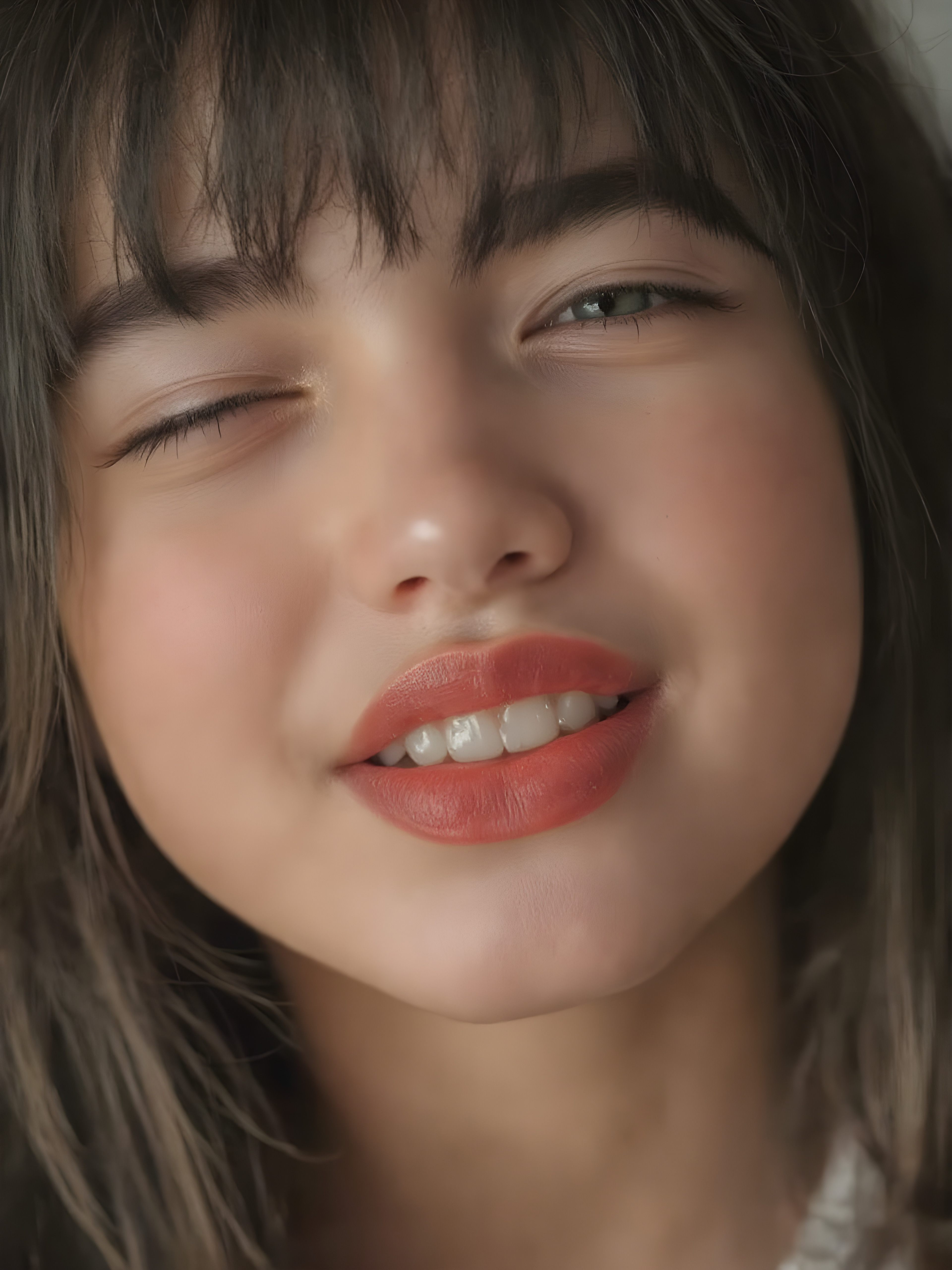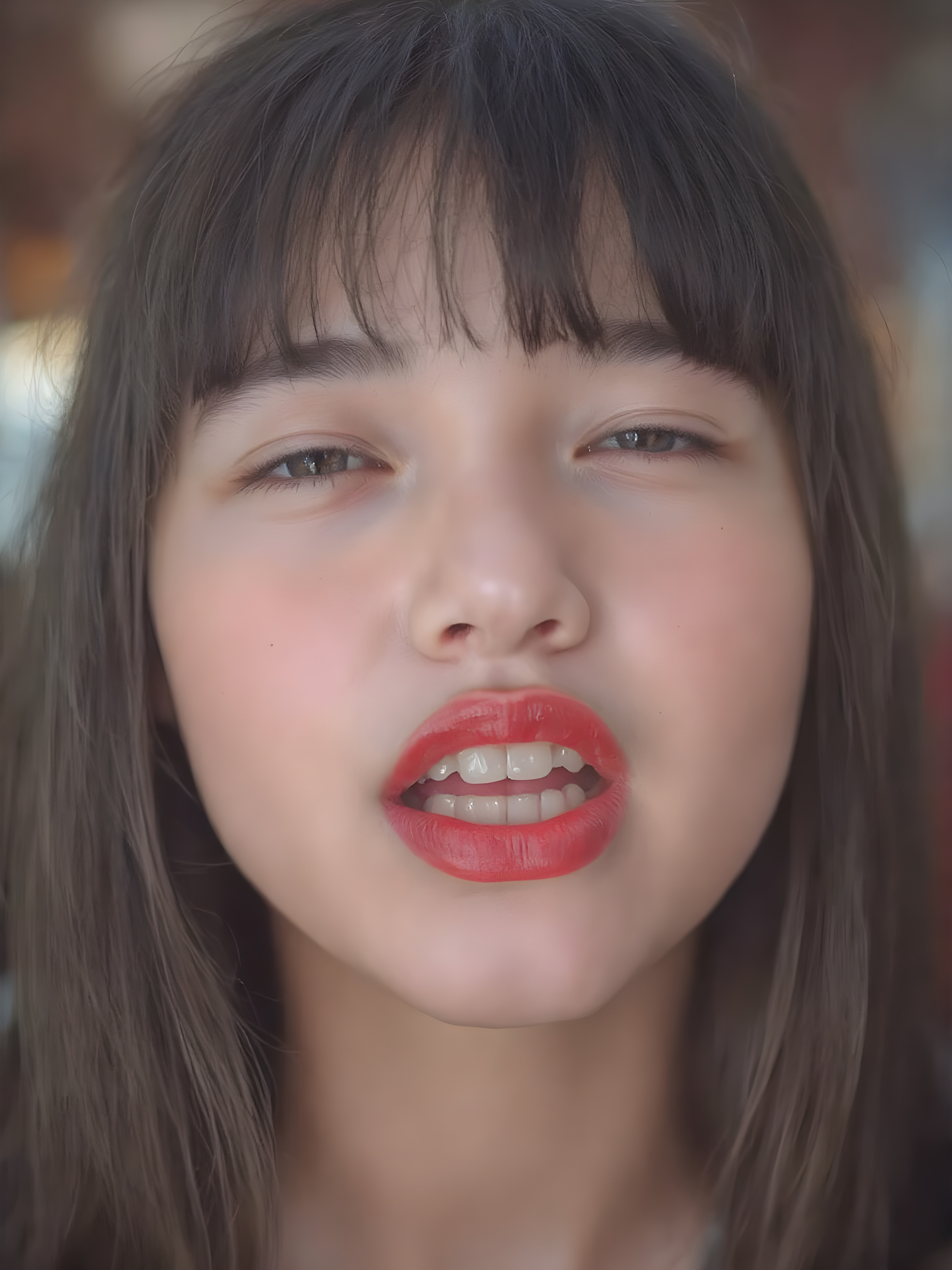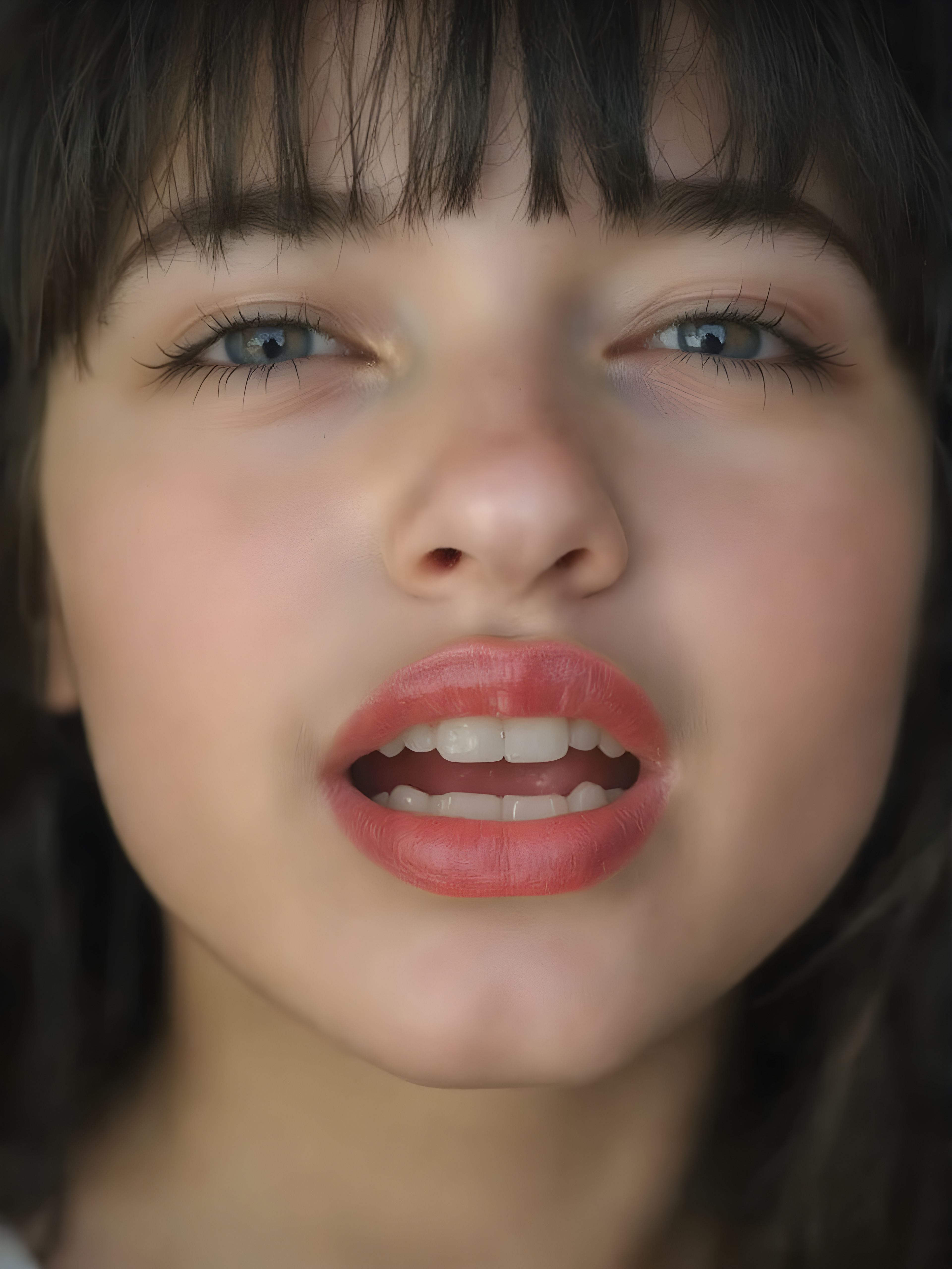 ((centered portrait)) a beautiful young cute teen girl with plump, full kissable red lips, a gentle face and fine, straight black hair, bangs. Her eyes are closed, flawless skin, wonderful make-up. She has white teeth and a small nose. Her face is round. The picture has something magical about it. Her mouth is wide open and the girl radiates pure desire, she looks up