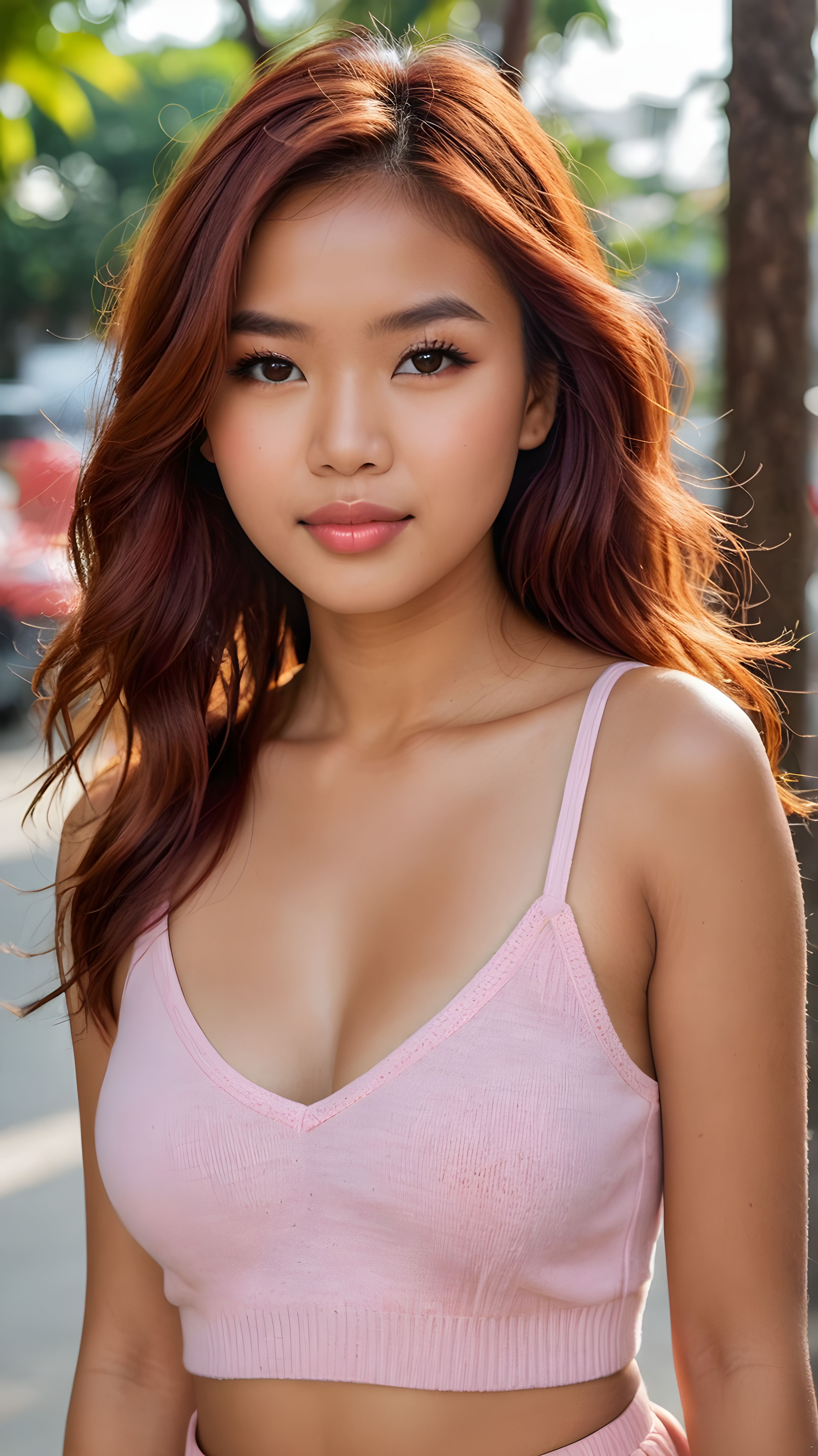 a (((very beautiful Pinay teenage girl))), 13 years old, with long, flowing, voluminous (((detailed soft red amber hair))), styled in a sleek, shiny, straight haircut with sharp, defined (((full lips))), emitting an ethereal glow that complements her otherwise natural features, dressed in a (((pink short thin plain and cropped tank top made of fine wool, deep v-neck))), perfect curved fit body, she radiates pure joy, smile, perfect white teeth, round realistic face, round shiny amber eyes, full kissable lips, Philippines