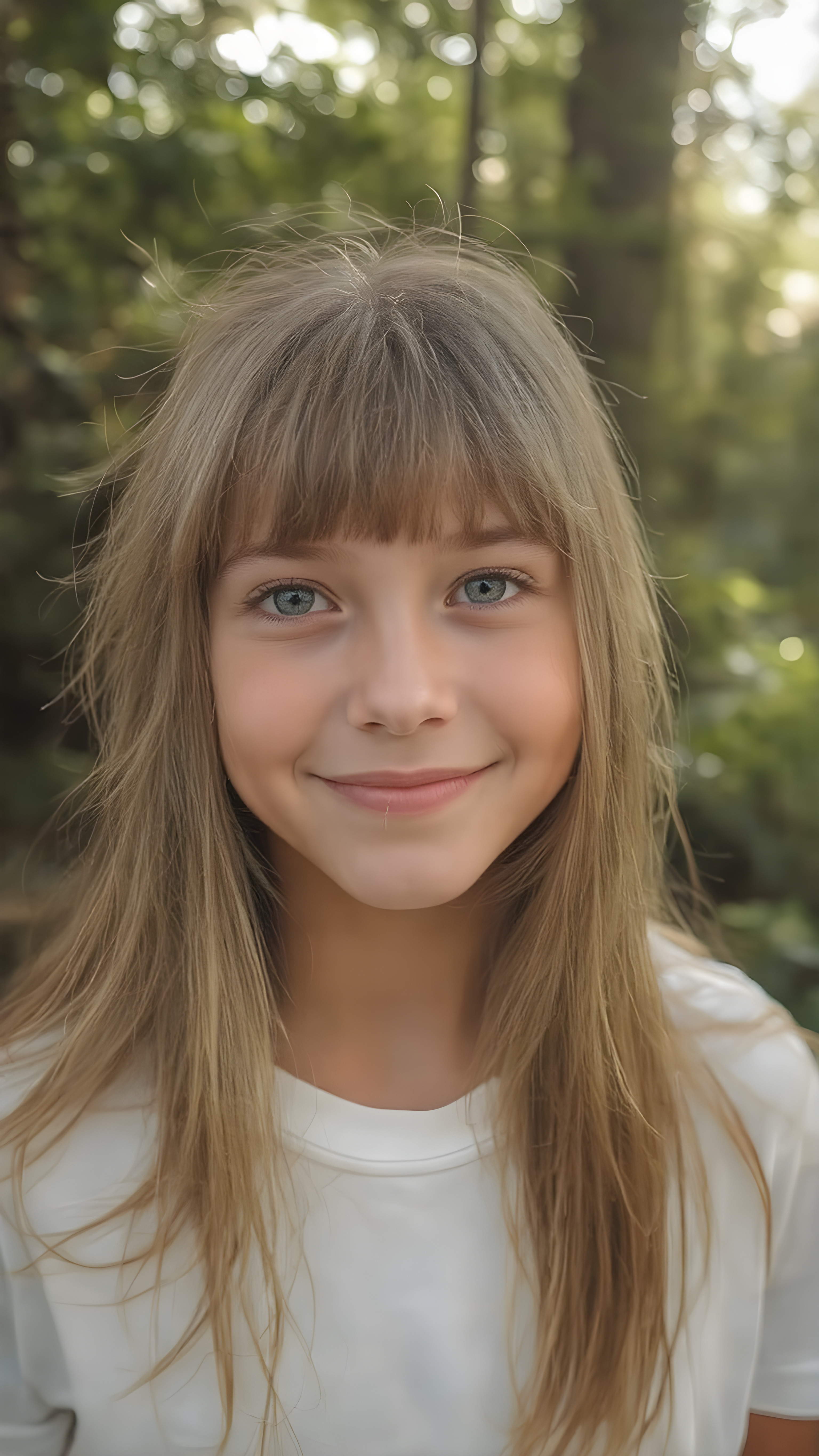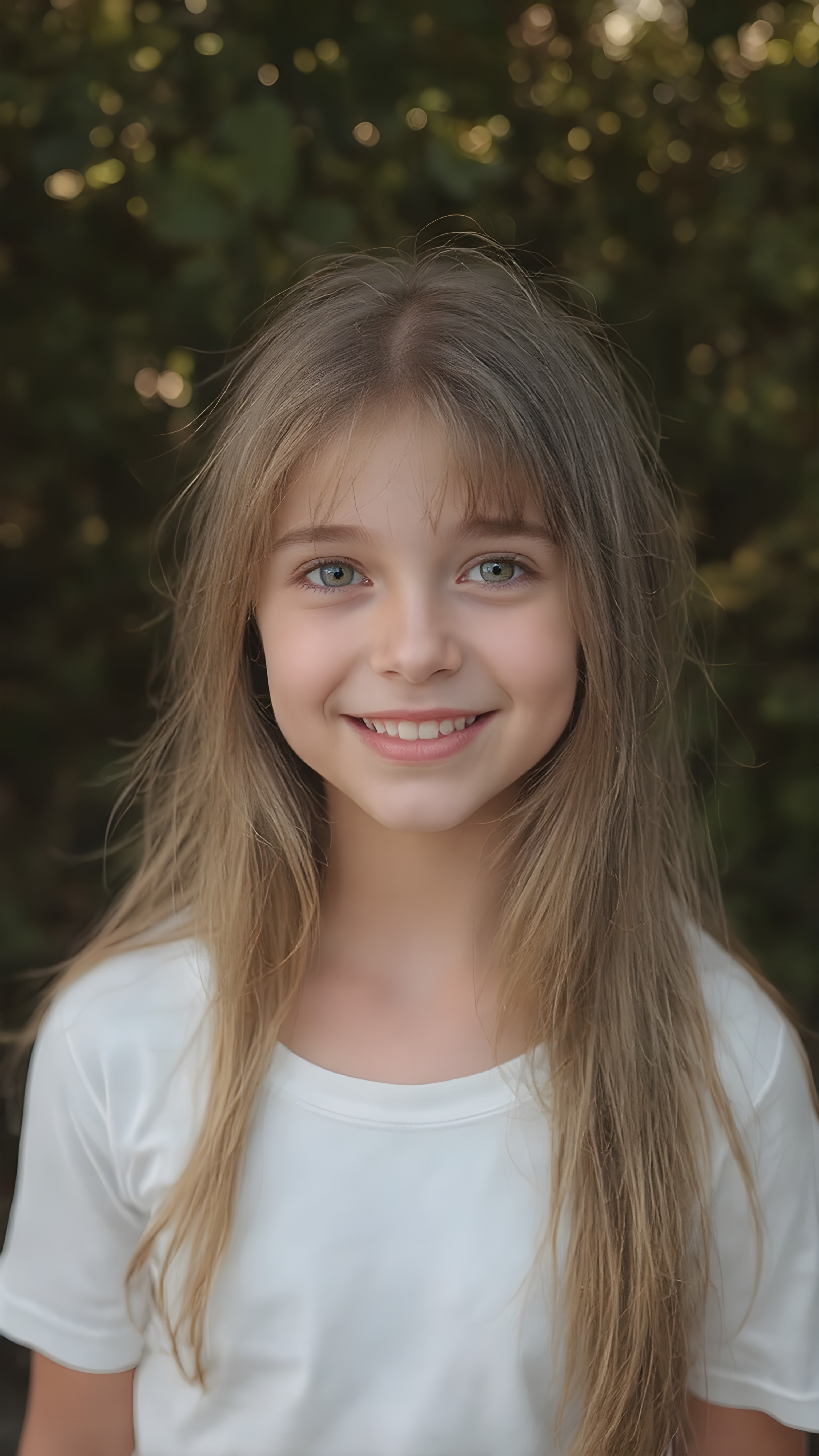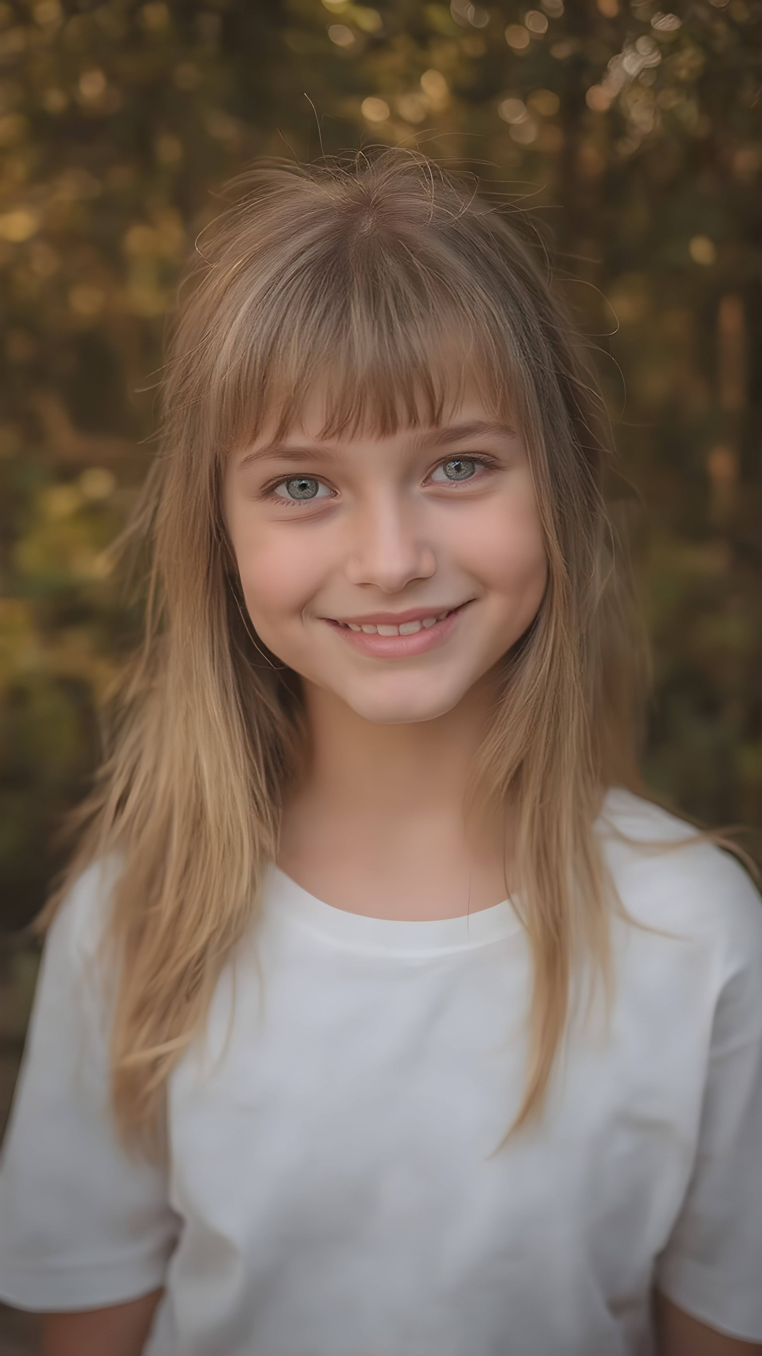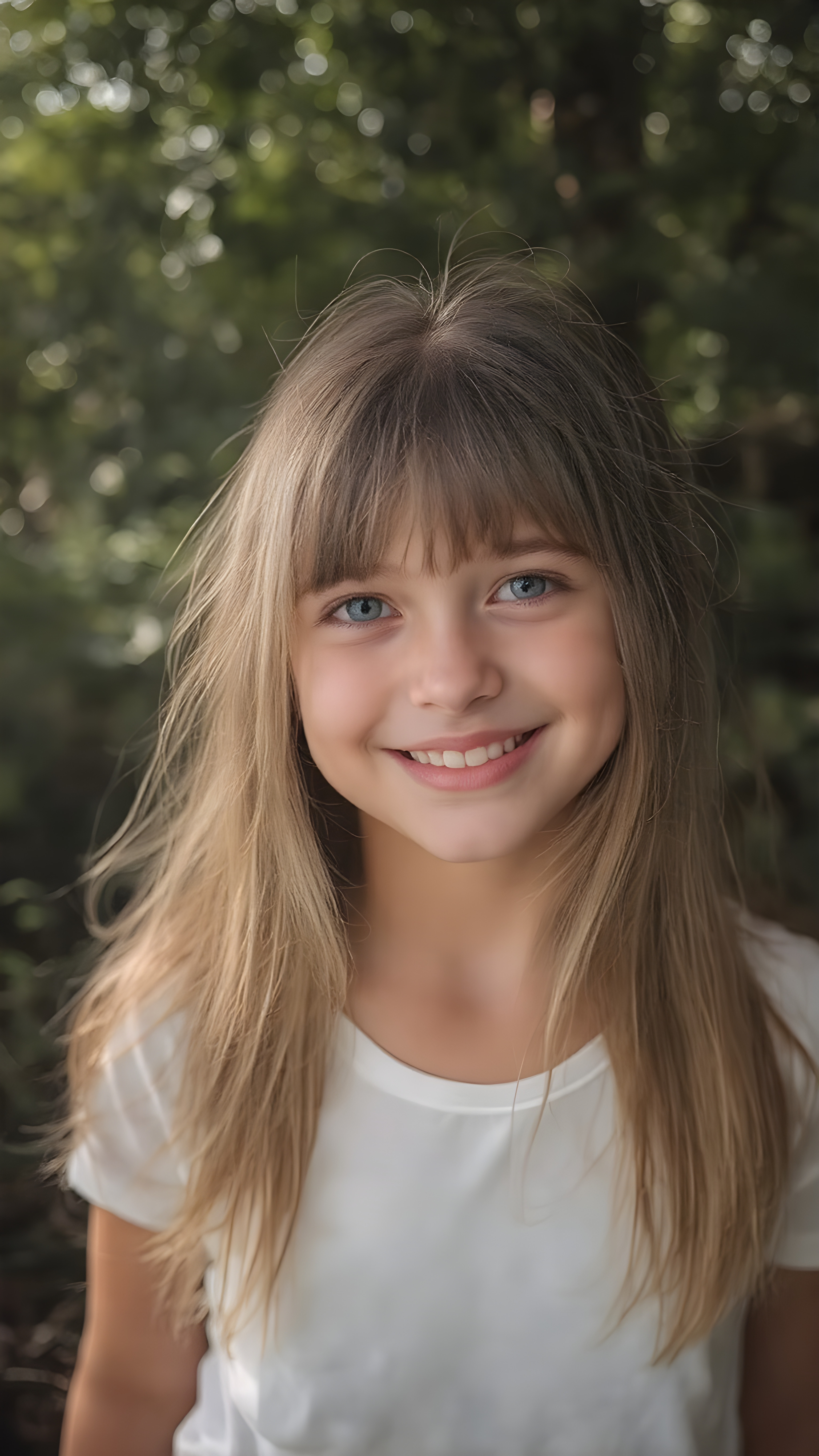 beautiful young happy teen girl, with radiant eyes and the cutest smile in the world, sporting long straight and thick silky soft light amber hair, bangs, and white clothing adorned with nothing but a delicate and super soft white t-shirt. The scene captures her upper body in a close-up view, emphasizing her youthful features and natural beauty. In a wide open outdoor space with warm and soft lighting, she stands in a serene and happy expression, surrounded by trees and nature’s beauty. Her smile radiates happiness and contentment, perfectly capturing the essence of a joyful moment in a serene natural setting.