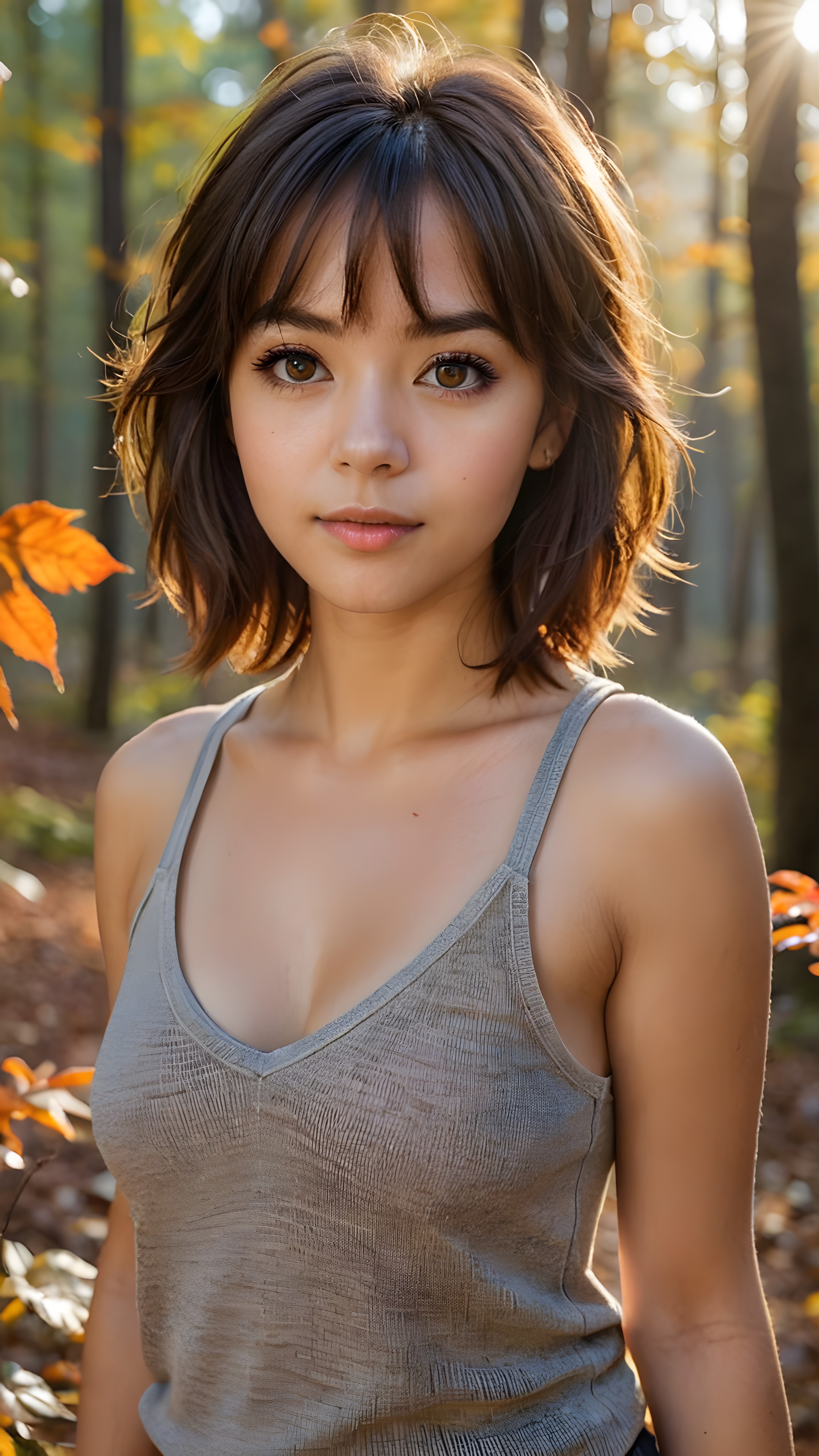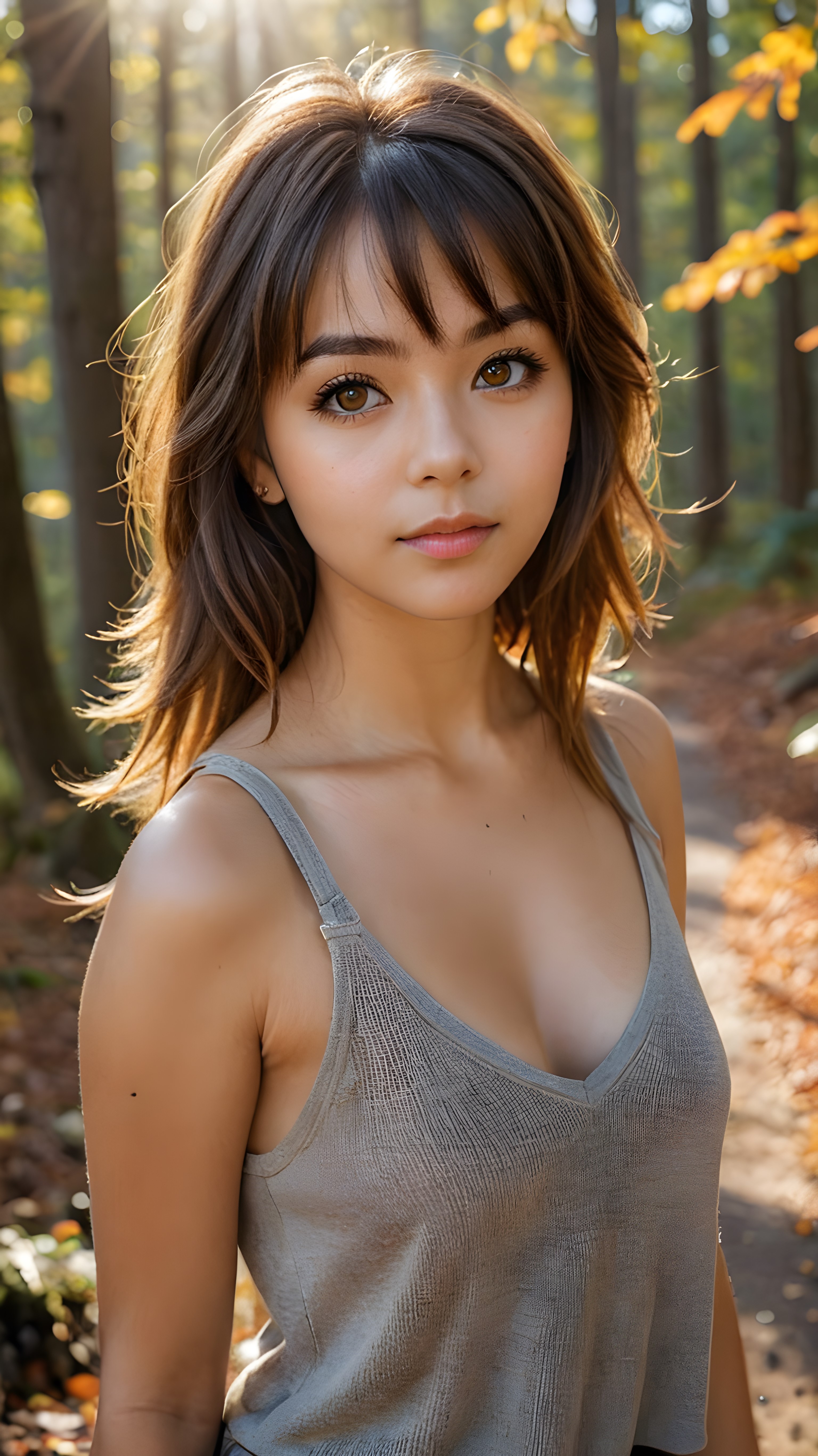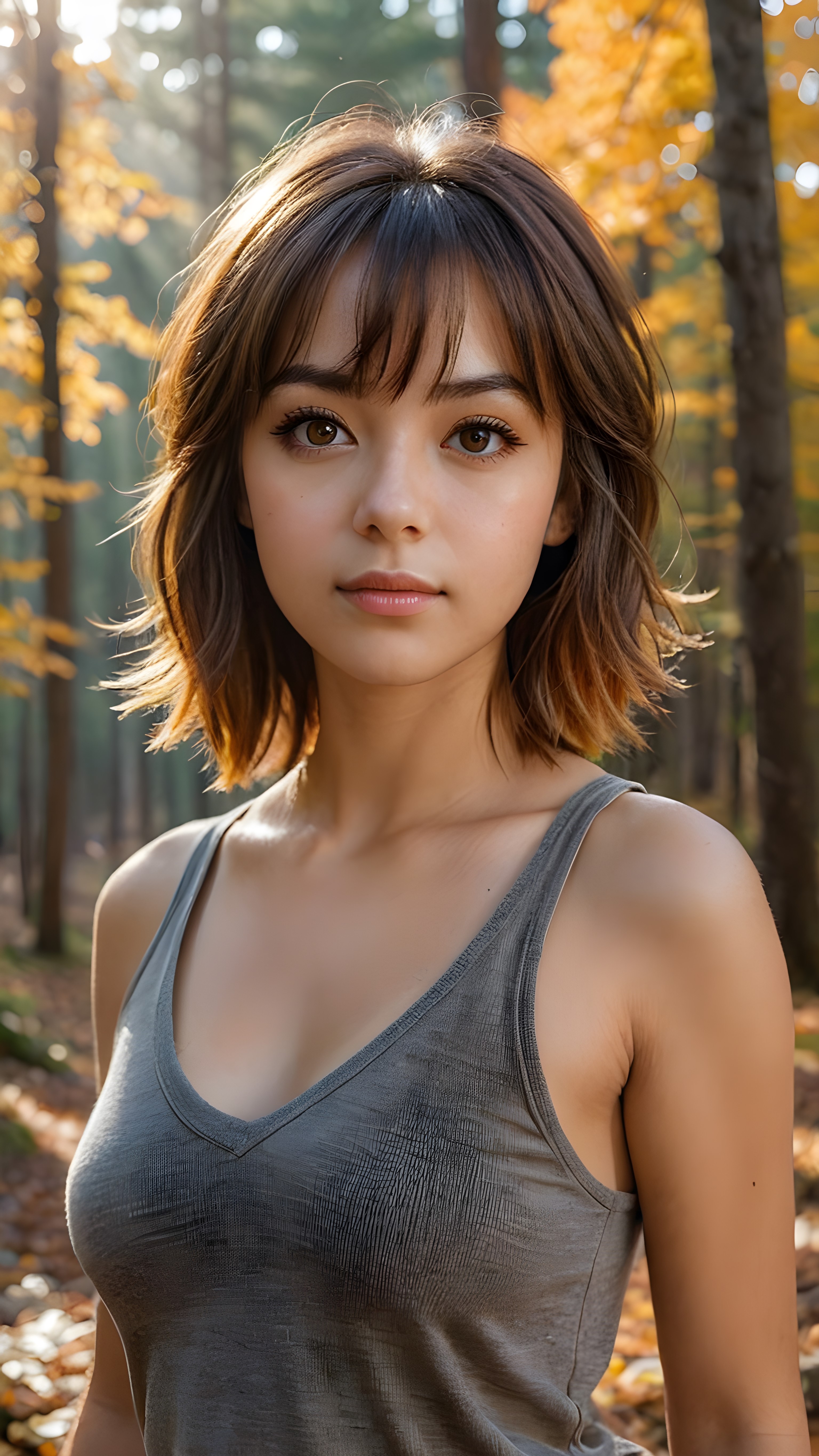 very cute girl, bangs cut, realistic detailed hair, realistic amber eyes, looks at the camera, detailed face, portrait shot 1:3, (she wears a short light brown plain tank top that support her perfect body, deep v-neck), ((in the background a colorful forest in autumn, the sun shines through the faint fog))