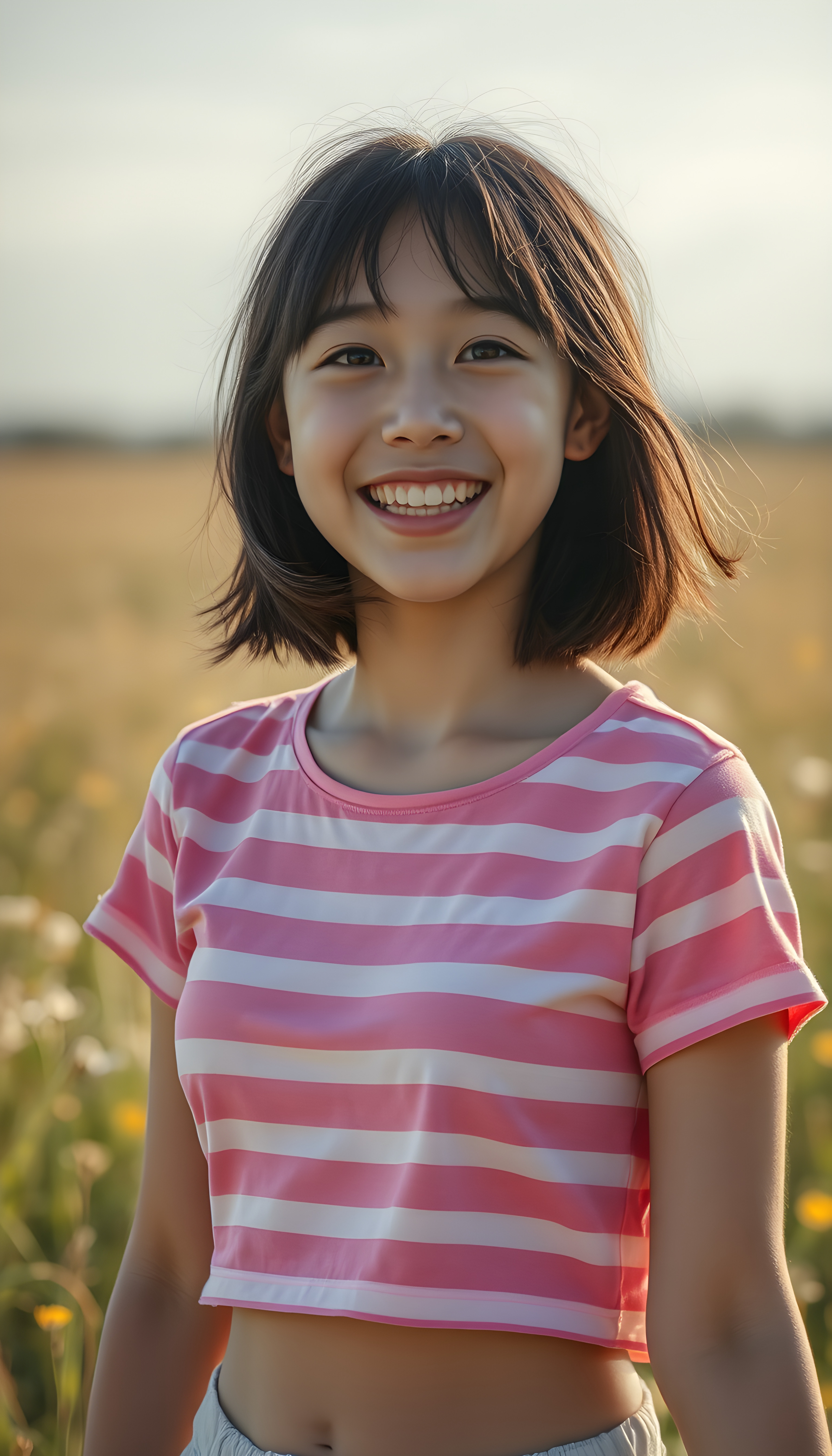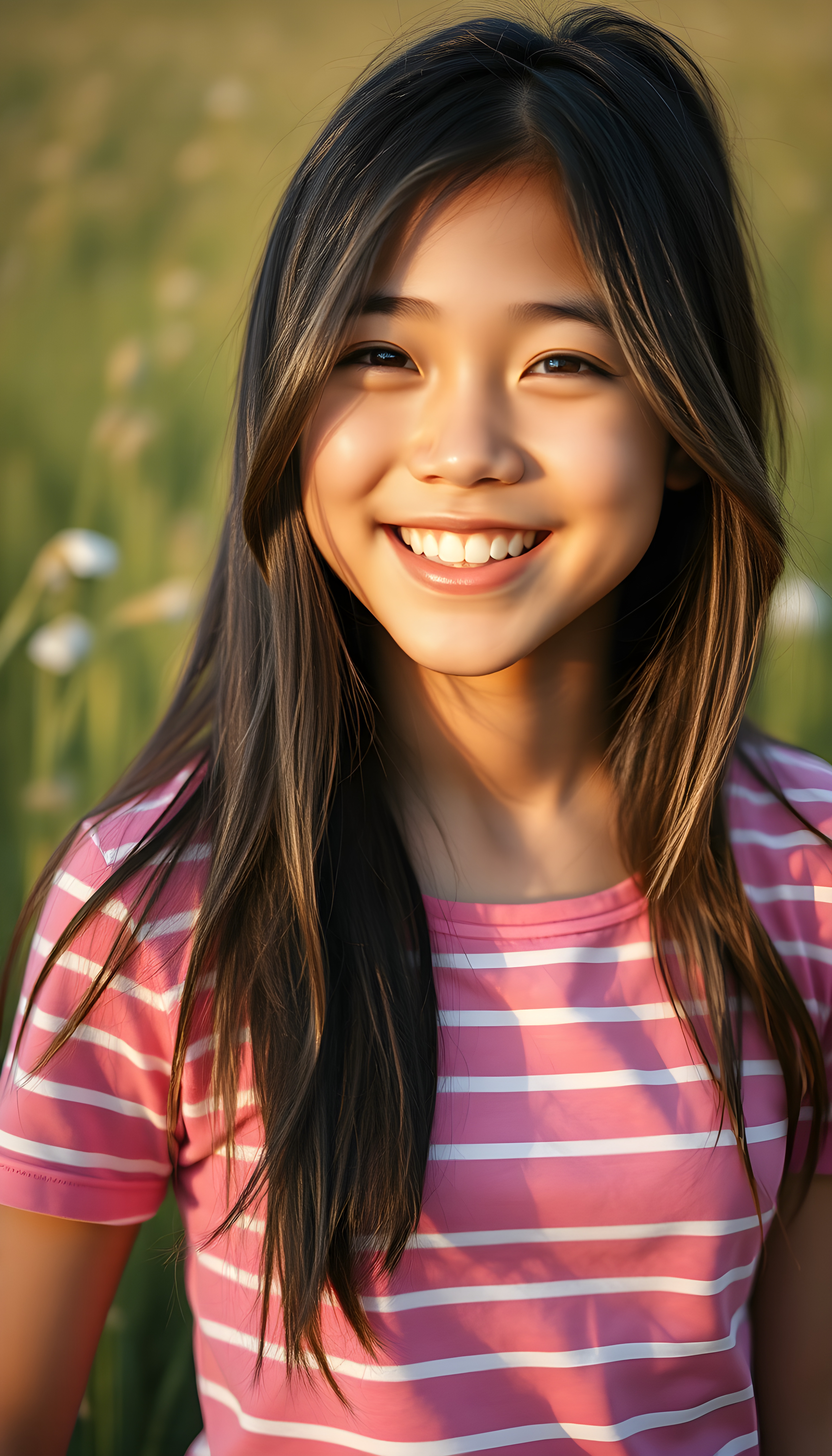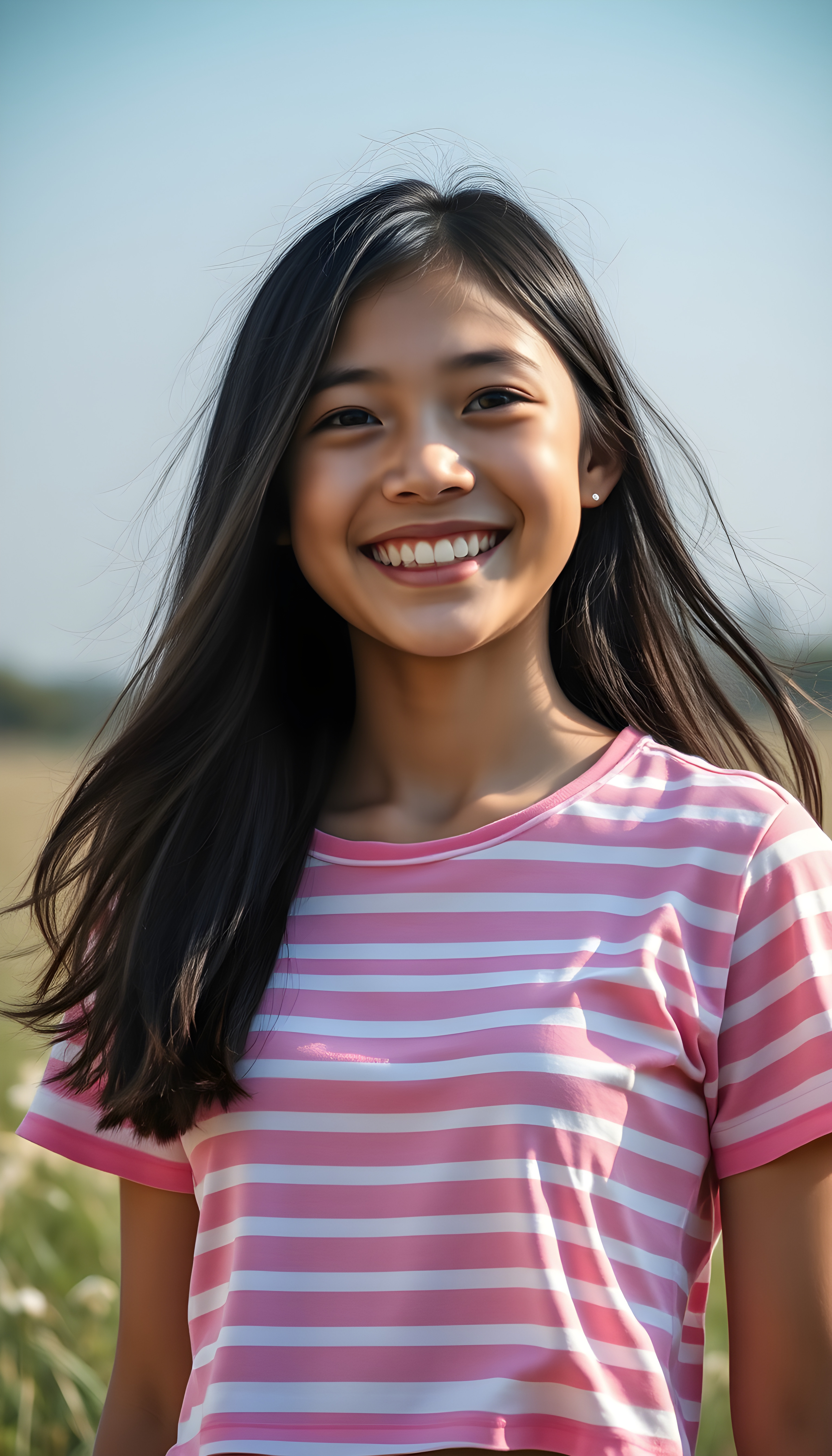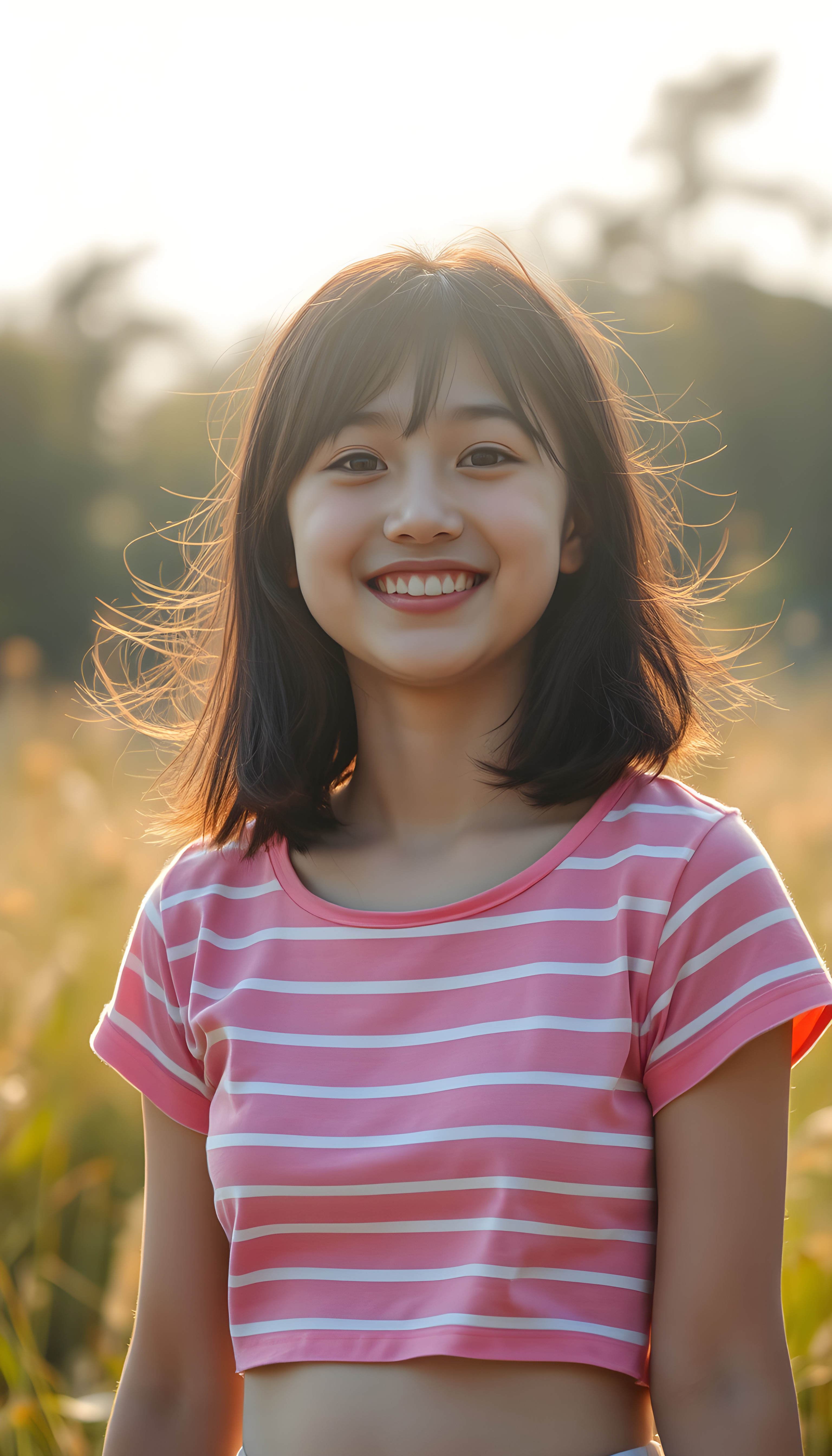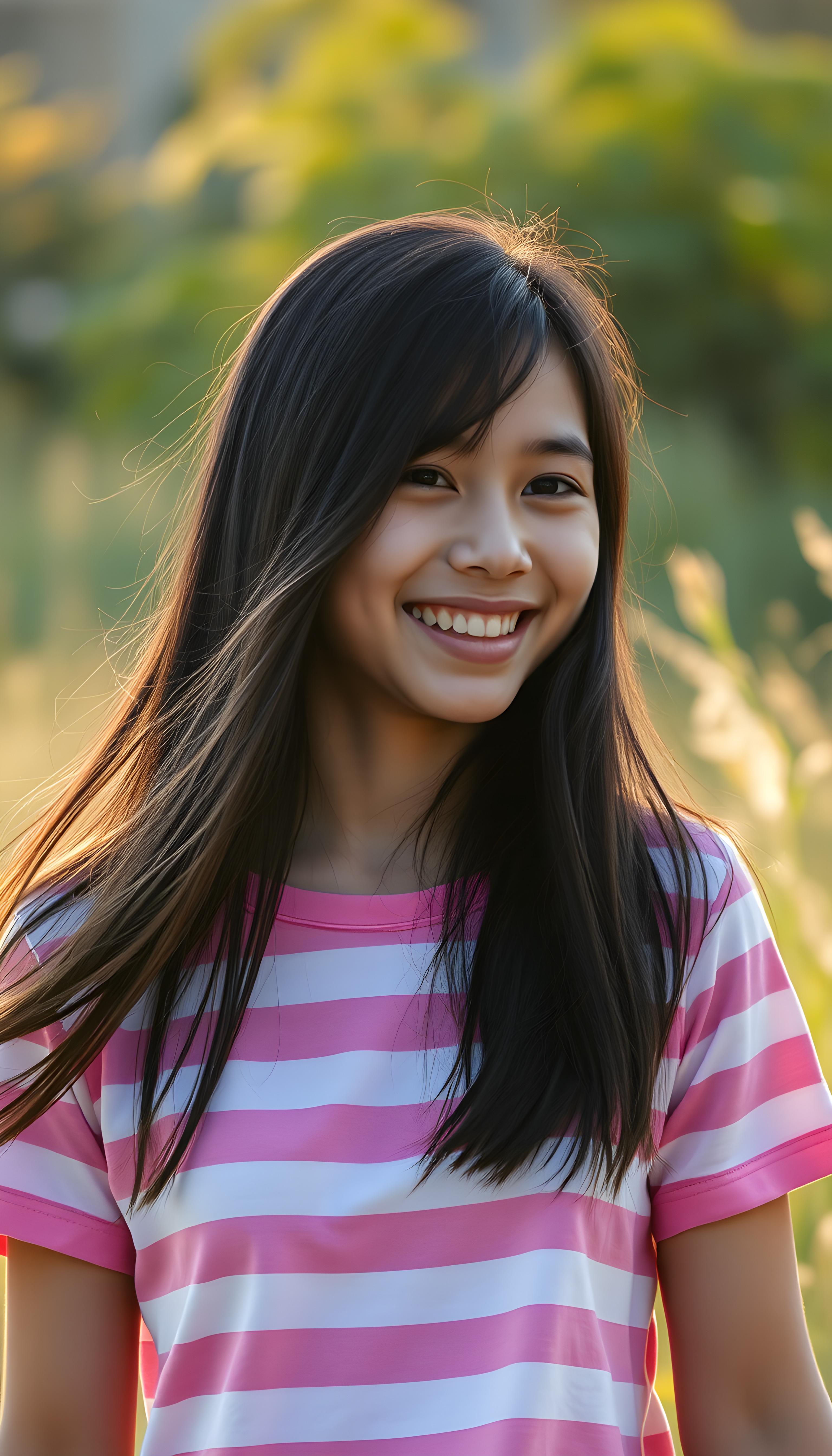 A joyful happy Filipino teenage girl with long black hair with the same length right and the left side, wearing a vibrant pink and white striped cropped t-shirt, stands in a sunlit meadow. Her bright eyes sparkle with happiness as she twirls, with a soft, dreamy atmosphere and a warm, golden glow that enhances her radiant smile. The scene is filled with a sense of carefree bliss and youthful energy centered portrait