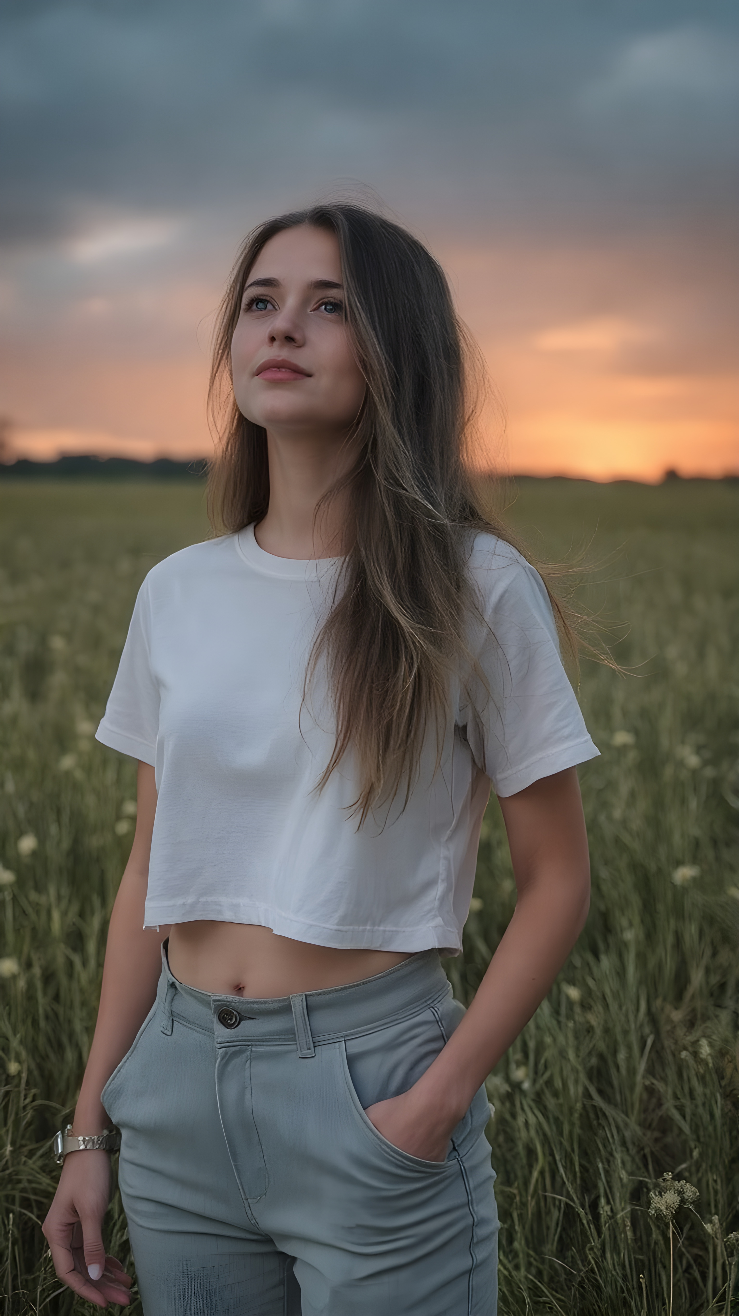 ((Full body photo)) of a stunning, ((beautiful)), ((slender)), ((fit body)), young woman with long ((soft straight hair)) that gently ((blows in the wind)) and ((dark blue eyes)), ((rounded red lips)), that are ((perfectly painted)) onto her face, suggesting a serene moment of happiness. She wears a ((white cropped t-shirt)) and a ((short denim pants)), ((comfortable loose trousers)), and ((sandals)) while ((standing)) in a ((natural grassy meadow)), ((looking up at the ((darkly stormy sky))) and ((the warm (softly glowing) sunset rays)) that mimic the gentle light of a sunset, perfectly capturing the essence of a (happy, natural moment).