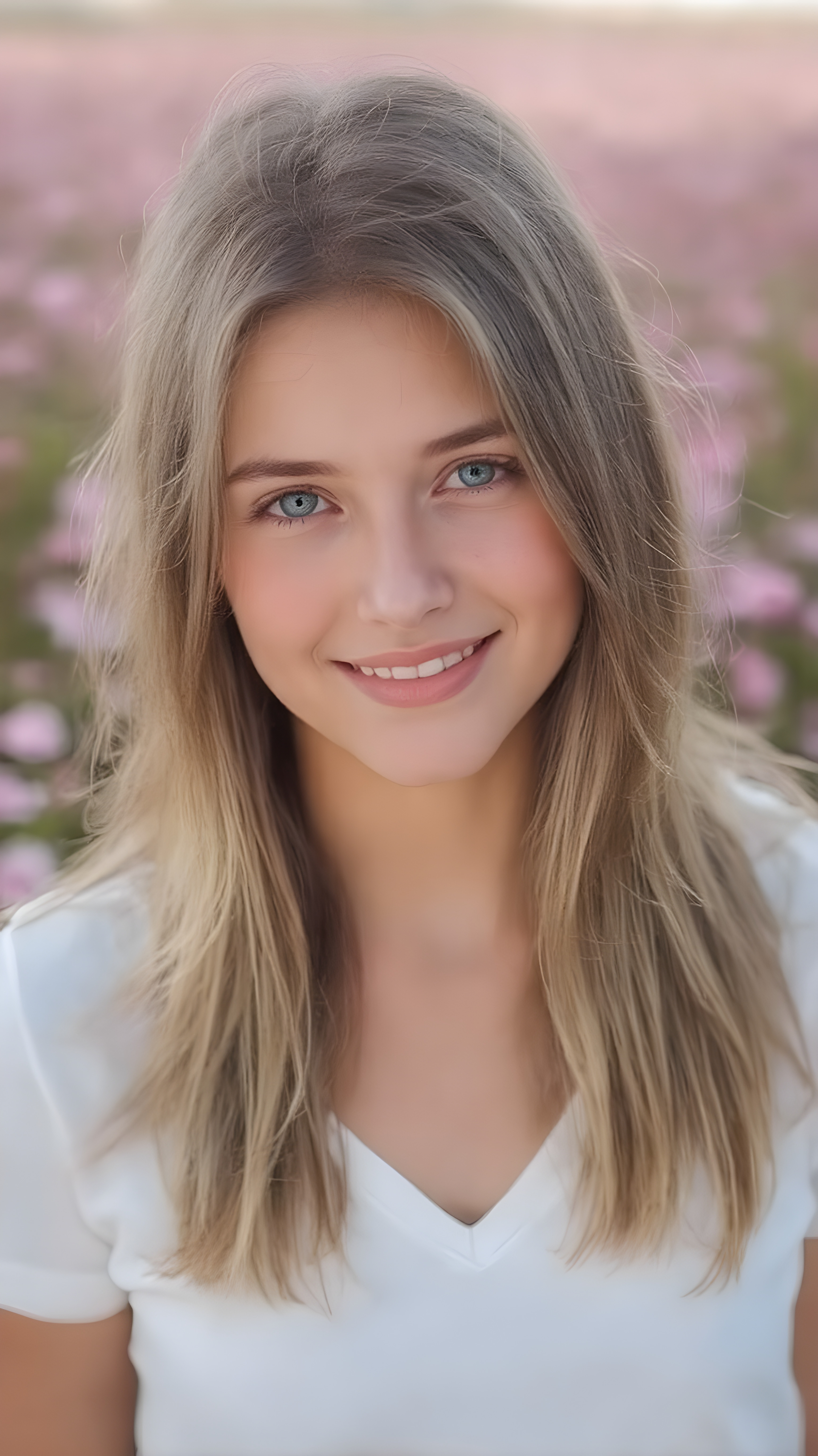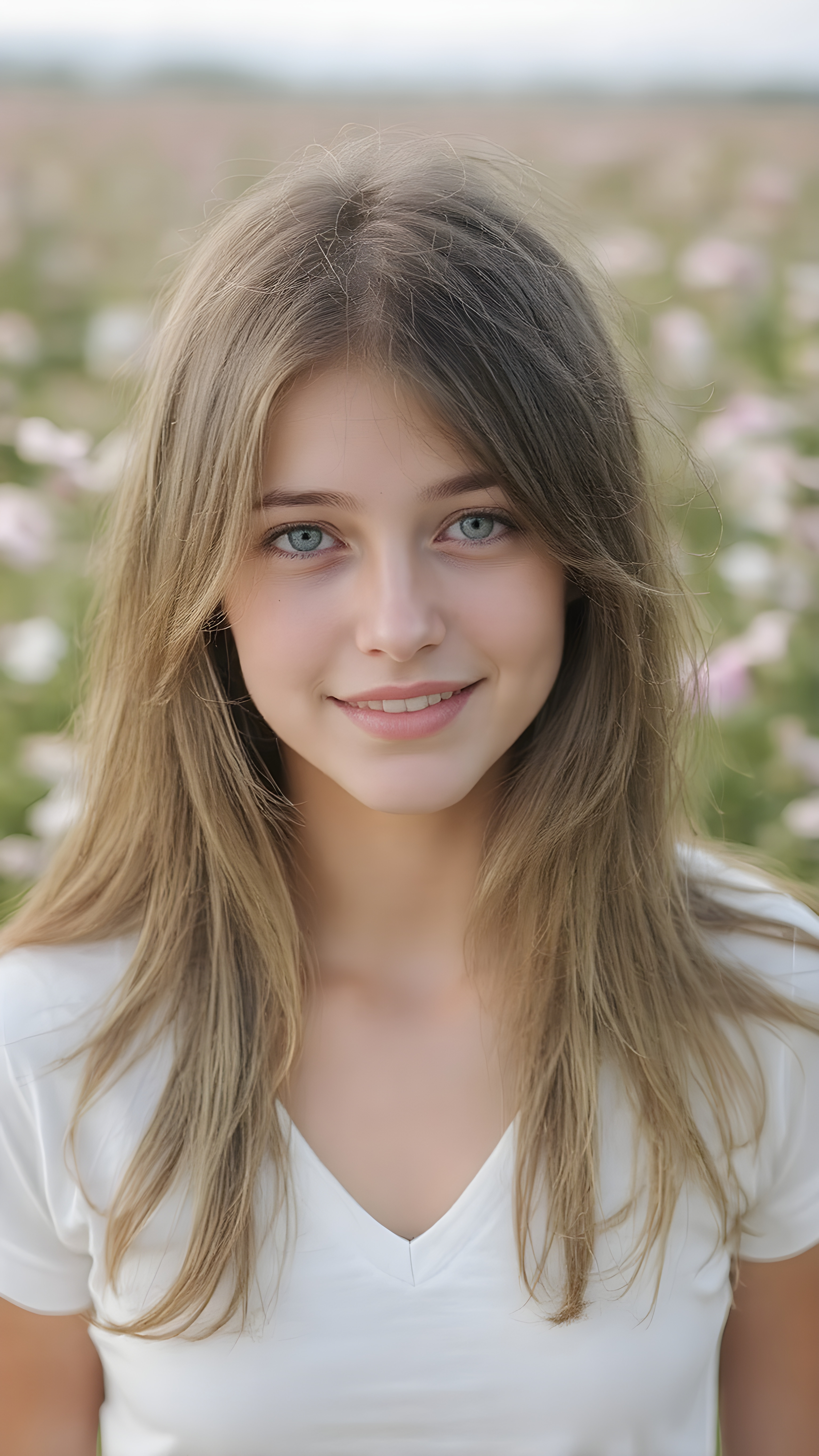 (an ultra-realistic portrait) of a smiling natural teenage girl, half long, straight brown and blond soft and super realistic hair falls elegantly and gently over her upper body, perfect cut of equal right and left length, green eyes, light freckles, wearing a white lifted sport t-shirt and deep v-neck, standing in a blooming flower field, soft natural sunlight, 4k, shallow depth of field