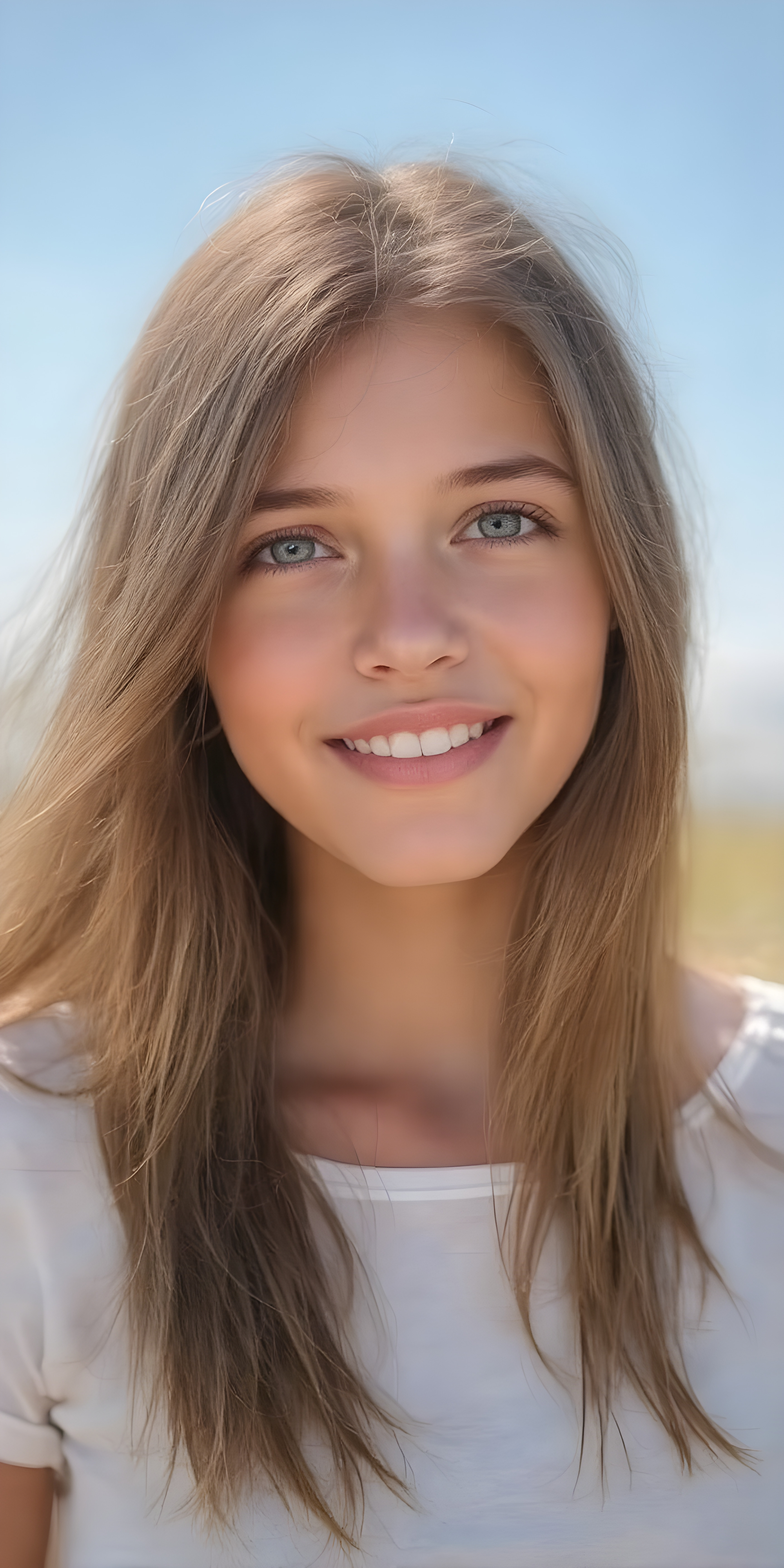 a (((breathtakingly realistic upper-body photo))) capturing a (((teenage girl))) wearing a (((light blue short t-shirt))), with long, soft, copper-blond hair and a (serene meadow as the backdrop) ((view from the side))