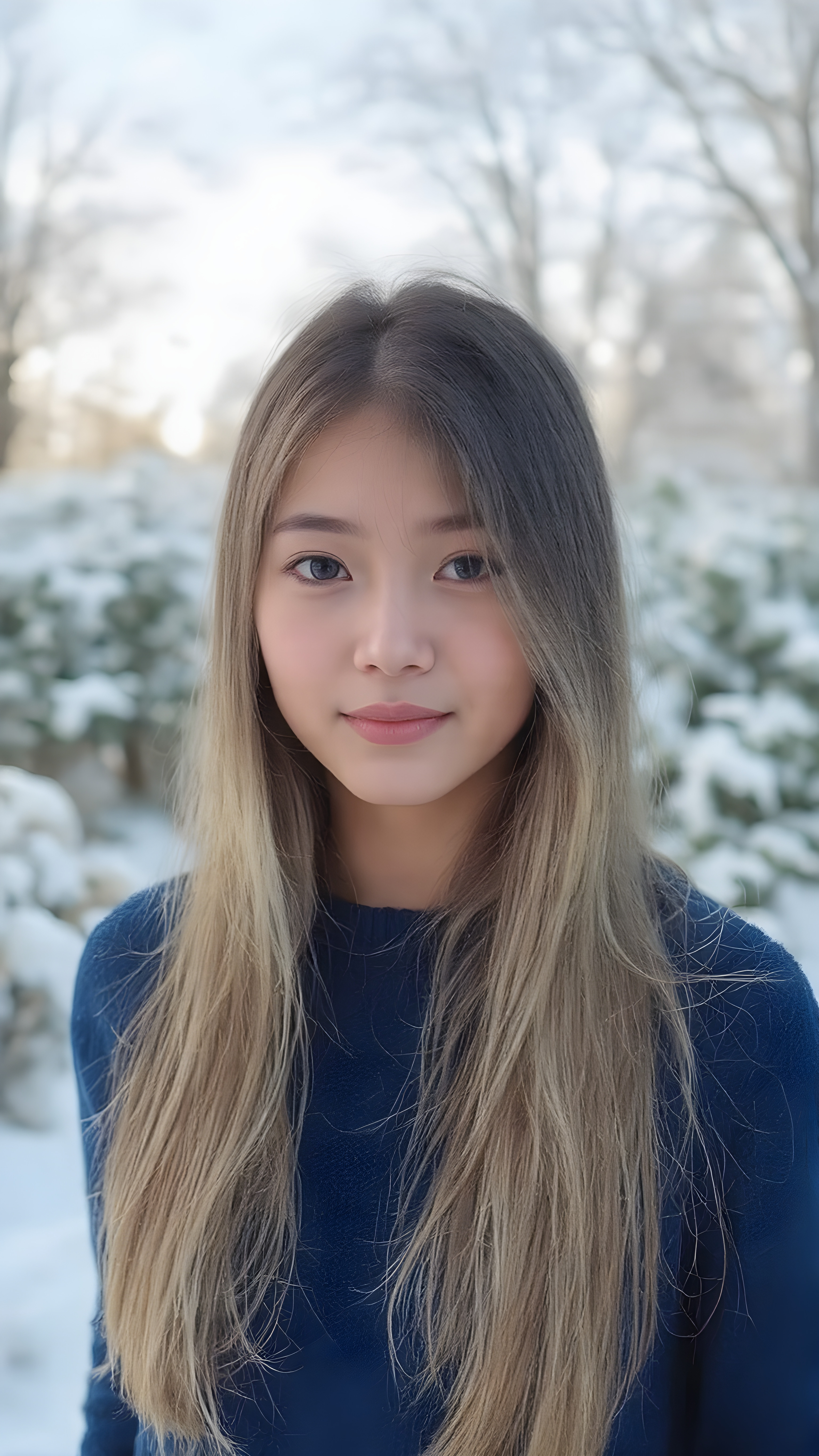 a beautiful innocent looking breathtaking Asian teen girl, full body view, (full lips, pink cheeks, surrealist natural makeup), long glossy blonde soft straight jet long hair, in royal blue sweater made of fine wool, (full body view), in the background of the beautiful clear day in the snowy winter in a garden.