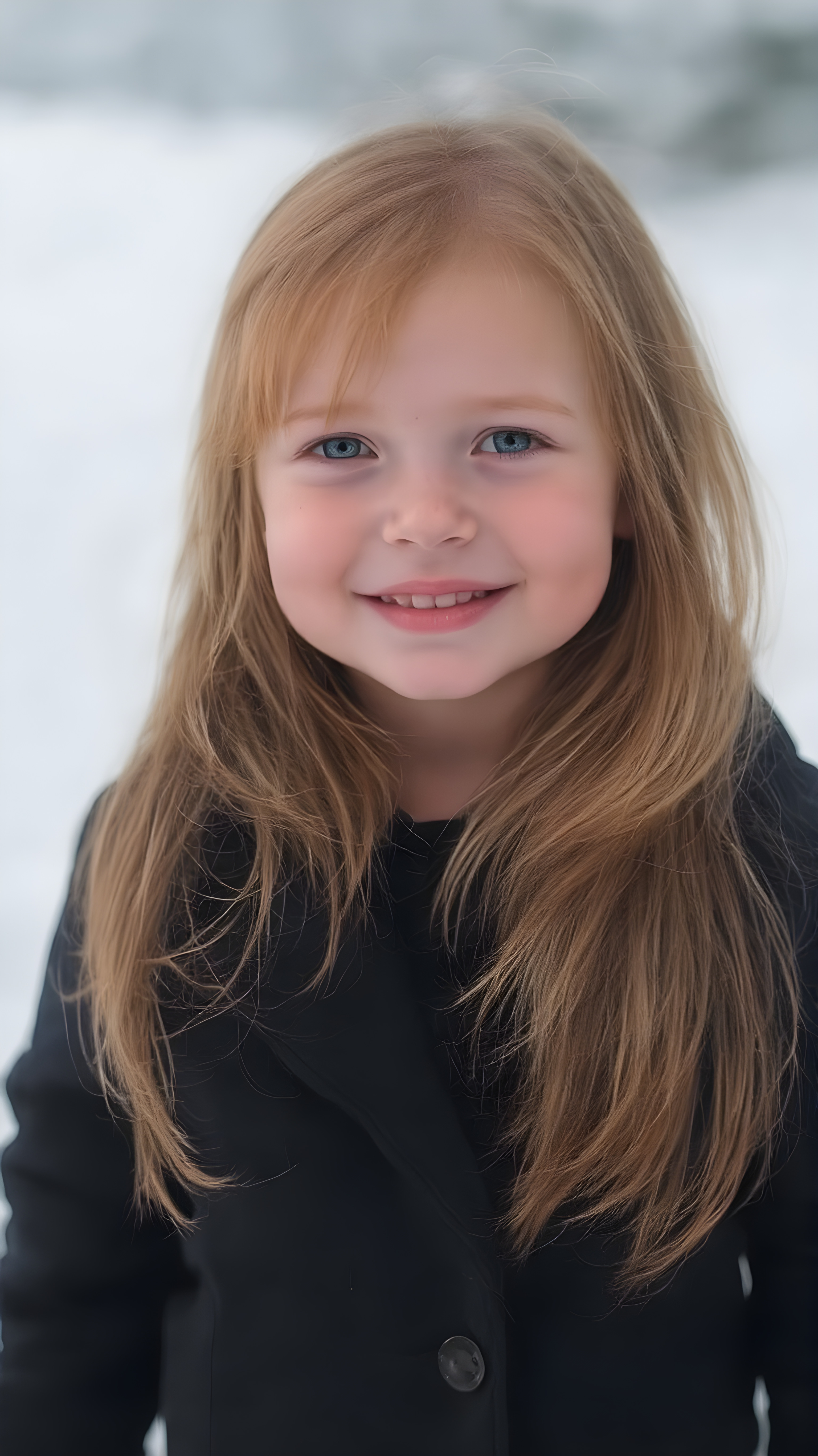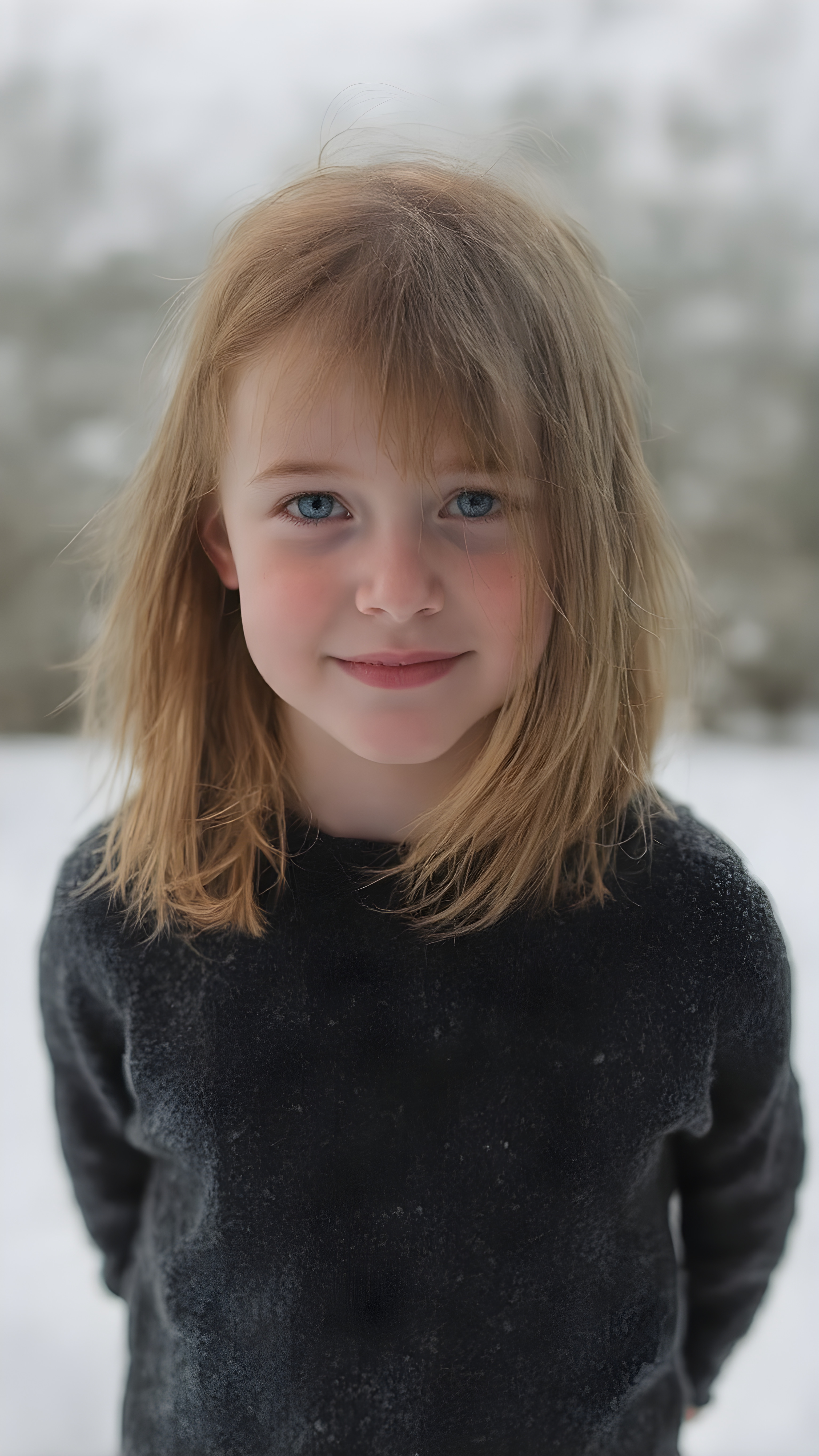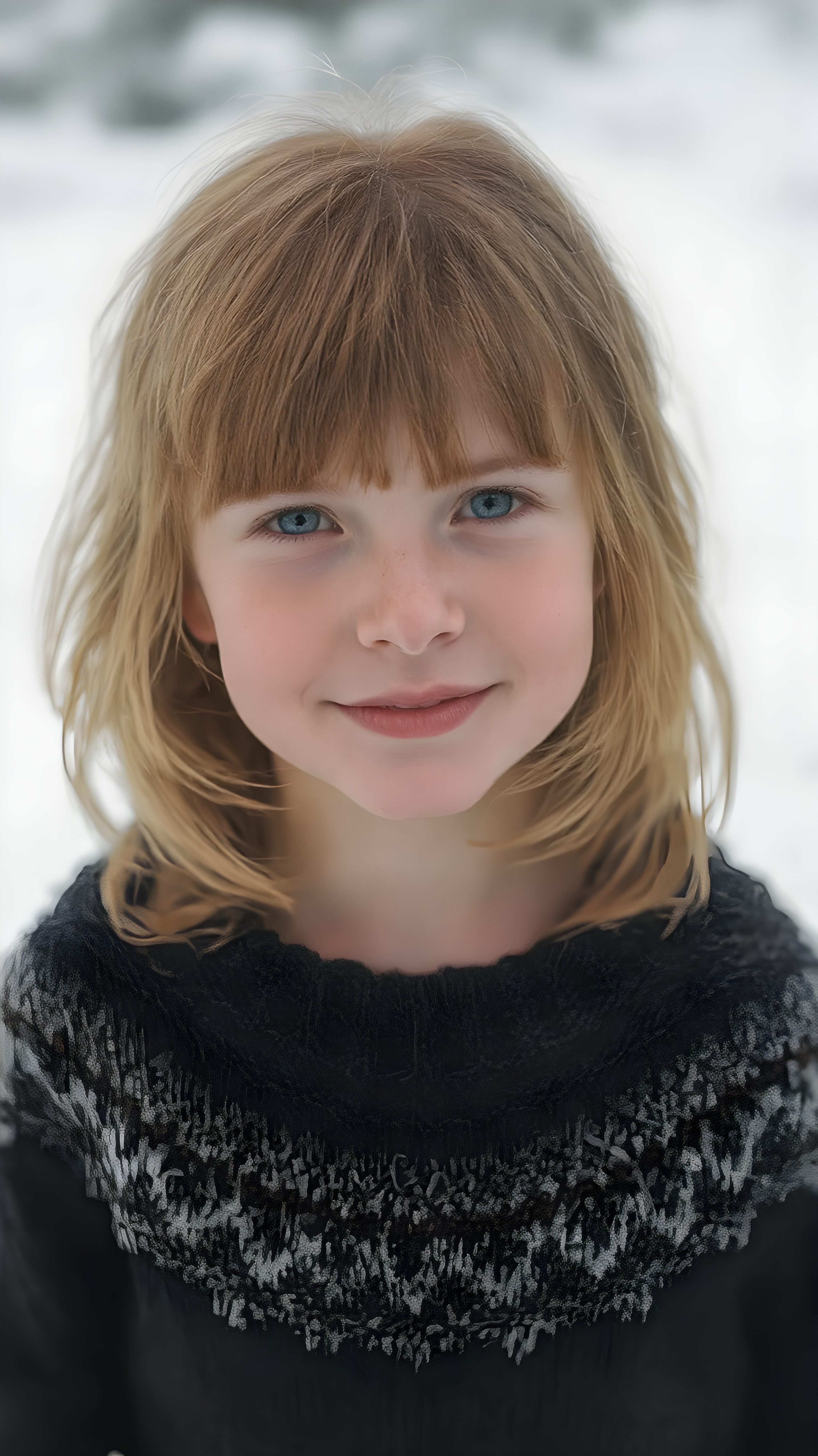 a cute little red-haired girl with freckles. Shoulder-length, straight hair. She is wearing a thick black sweater made of fine wool and is standing in a white, snowy landscape. She is very happy and smiling. She has a chubby face. Perfect upper body shot. Beautiful. Enchanting.