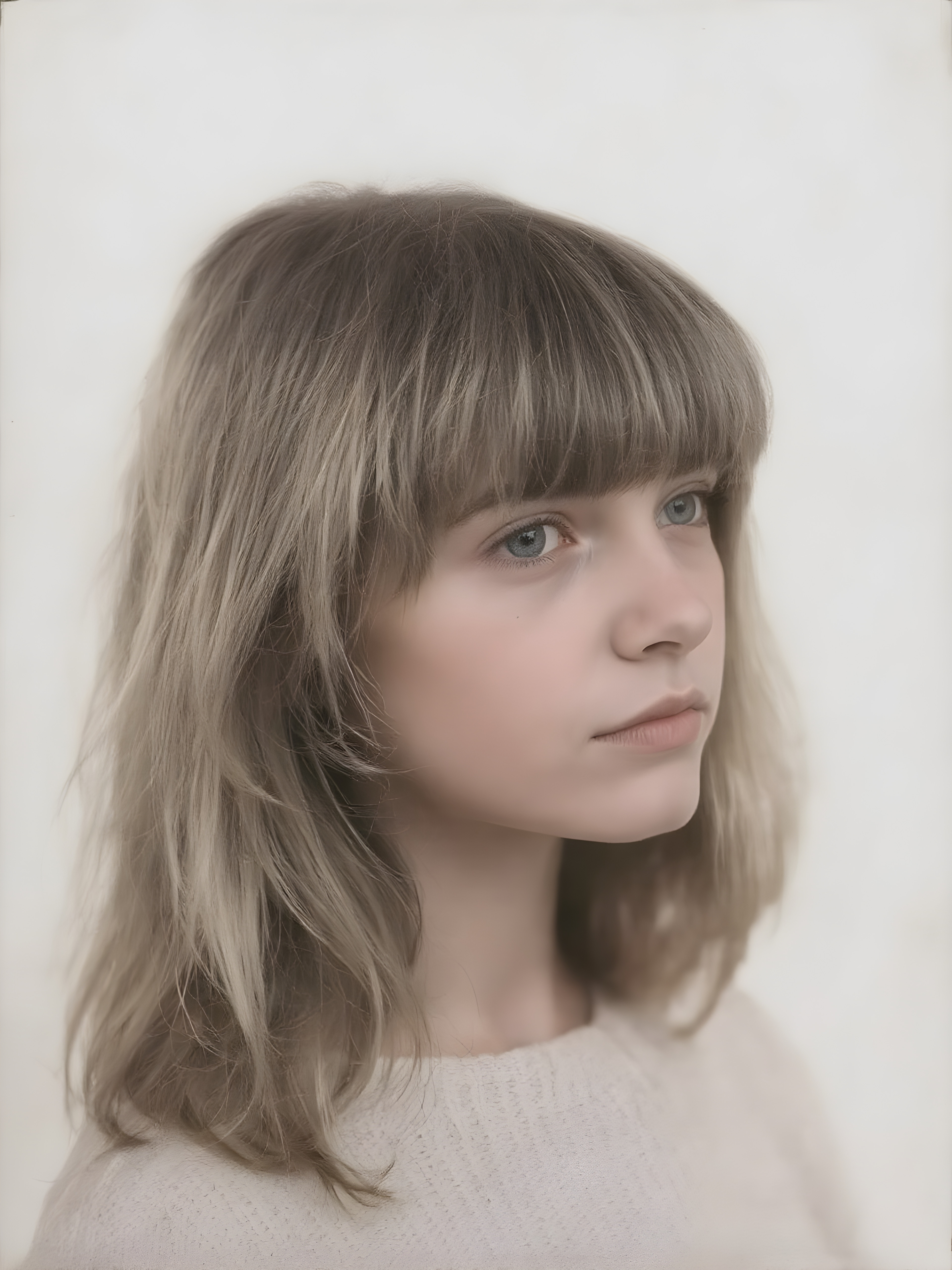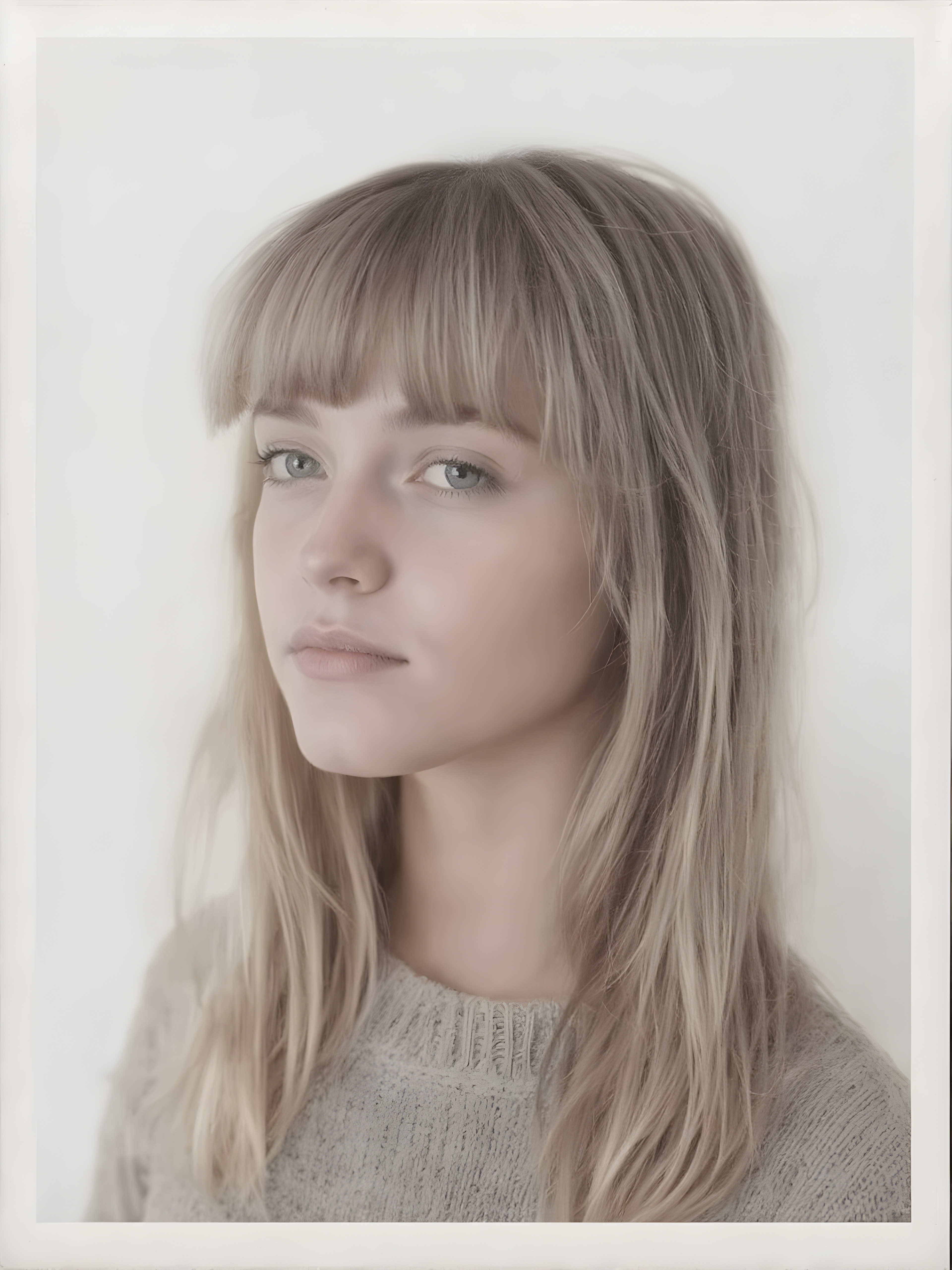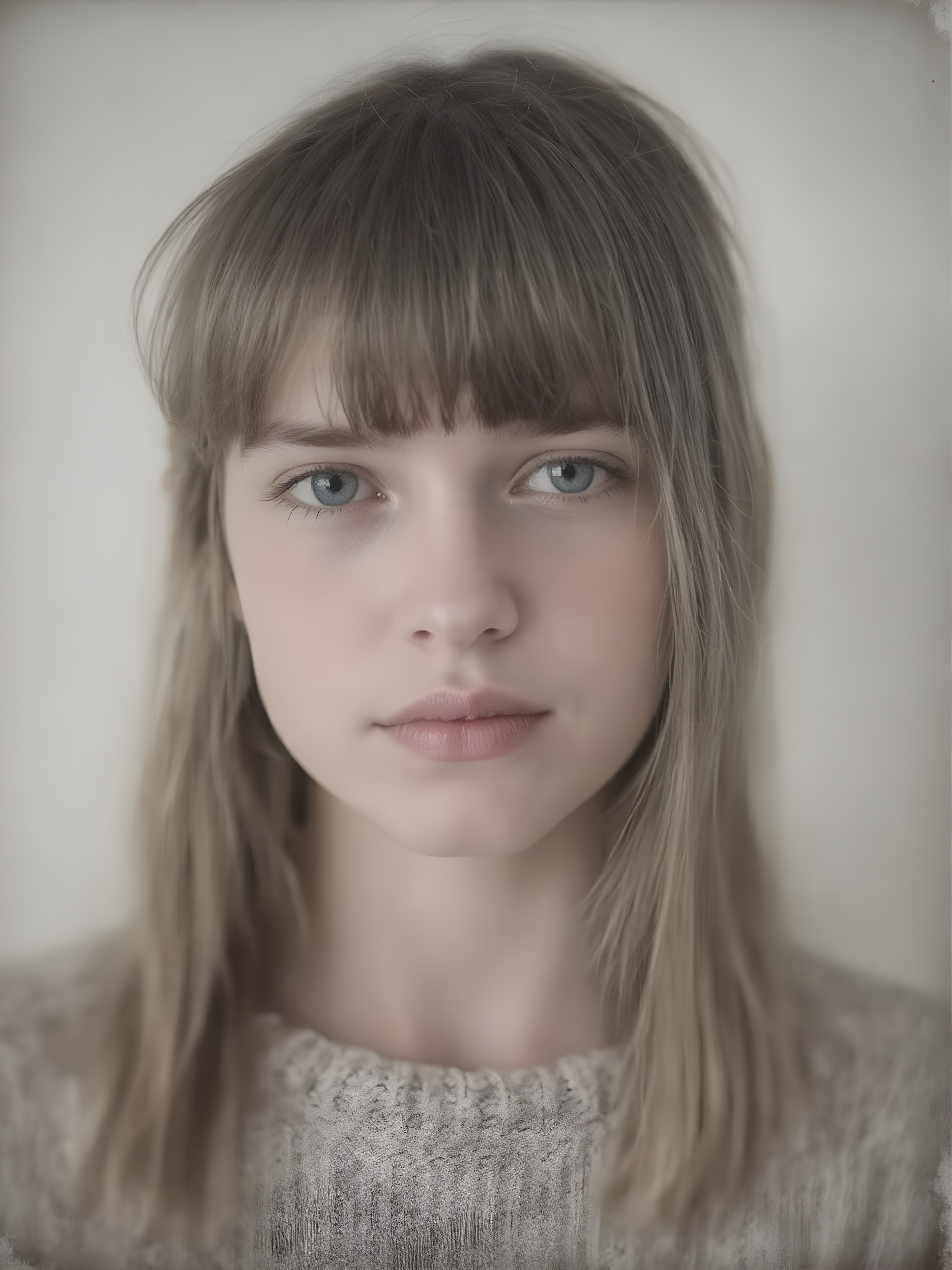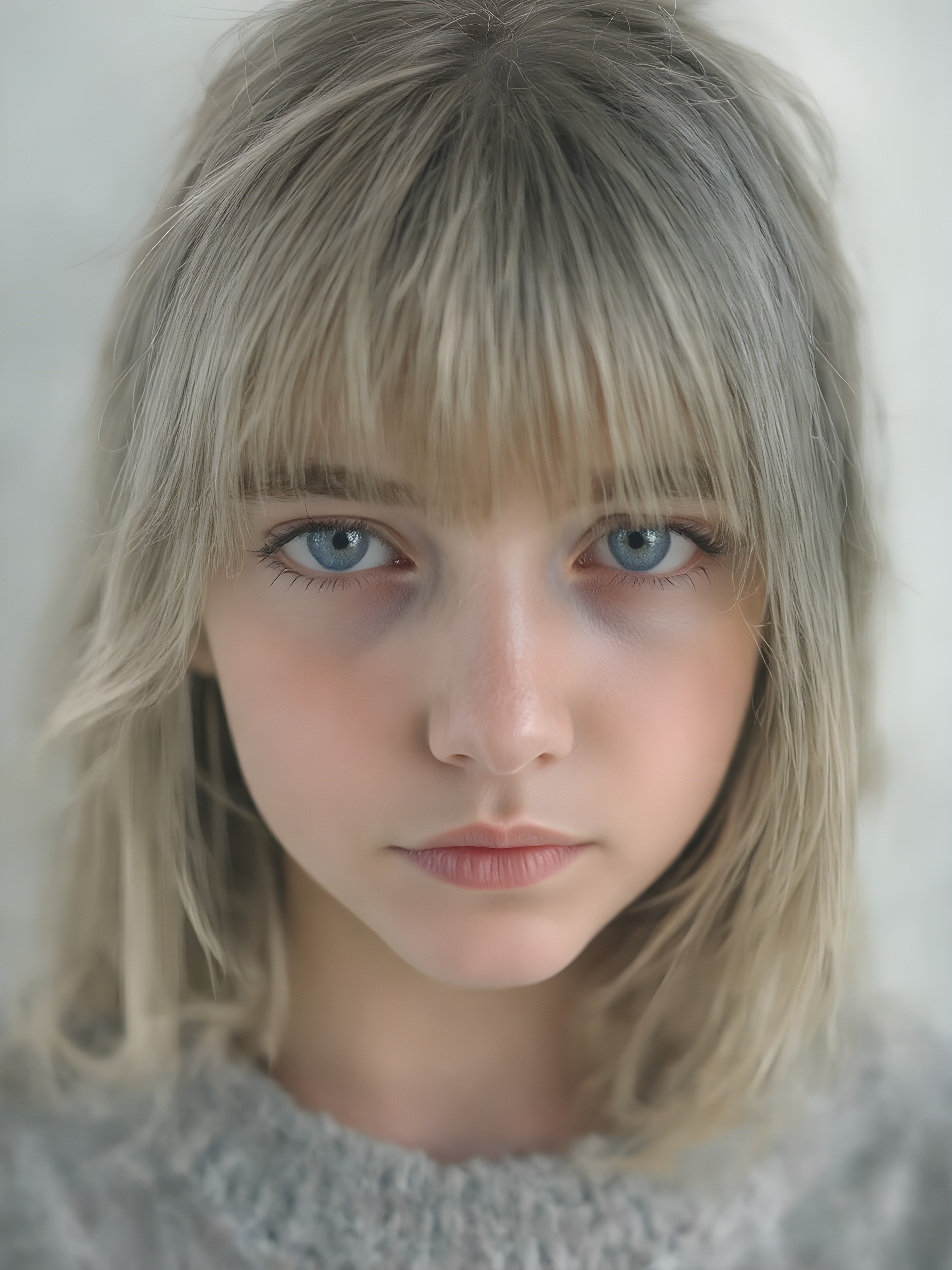 a ((highly detailed, realistic)) (((photo))), capturing a (((young teen girl))), with a delicate yet pale complexion, jet white thick straight hair with bangs, wearing a (((grey wool sweater))), ((stunning)), ((gorgeous)), ((light background)), ((perfect light and shadows)), ((crisp details)), ((rich colors)), (((photo realistic))), ((digital photography))
