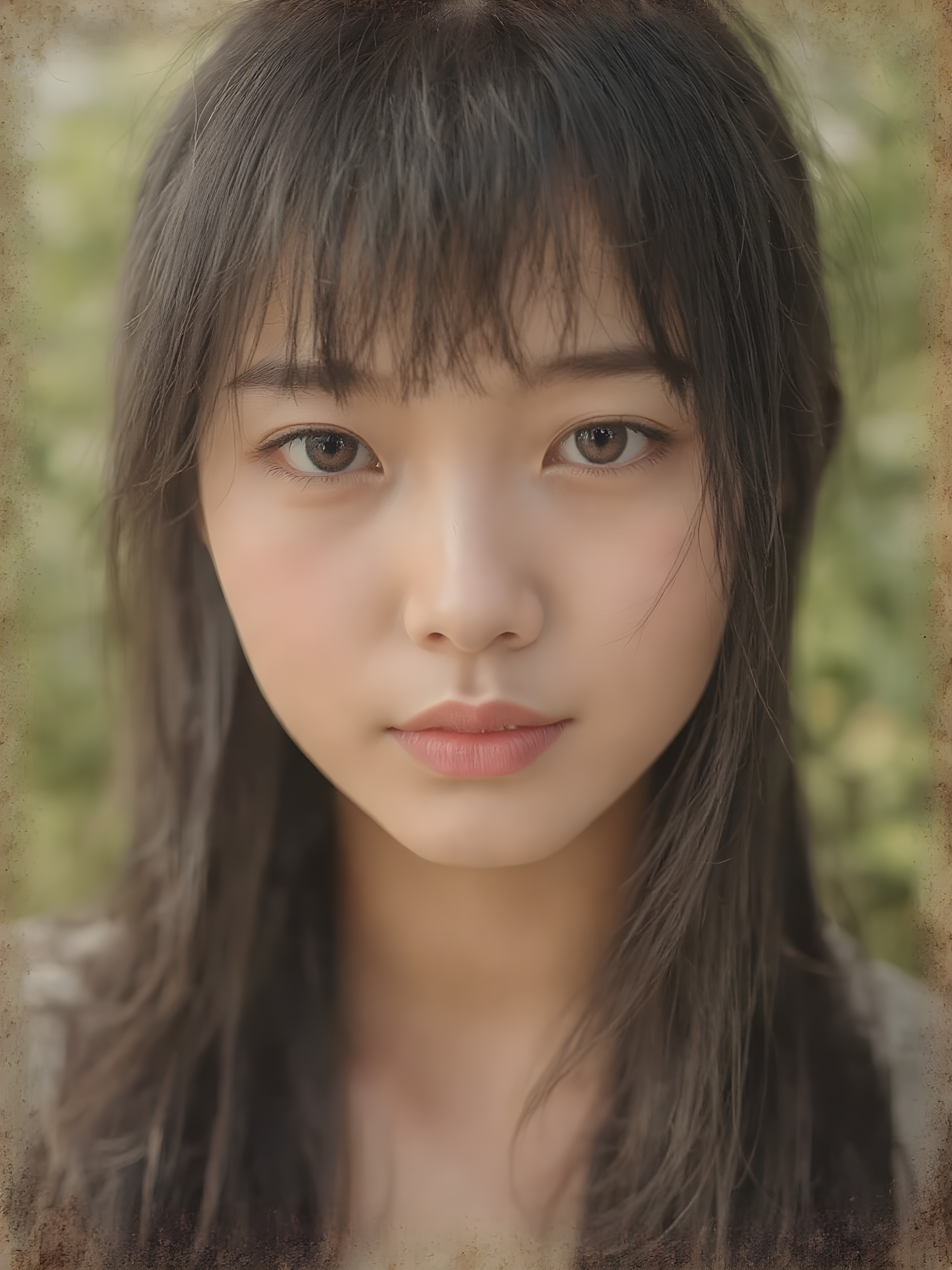 a (((realistic old close up Polaroid photo))), representing a (((beautiful young Asian girl, long soft obsidian black hair, bangs cut))), round face, with an (((ultra realistic, intricate details))) that defy the laws of physics, with a (((dynamic advanced lighting system))) that brings out the extreme details, composited against a (((natural, sunny green backdrop))), emulating a hyper-realistic, advanced photography, exotic style