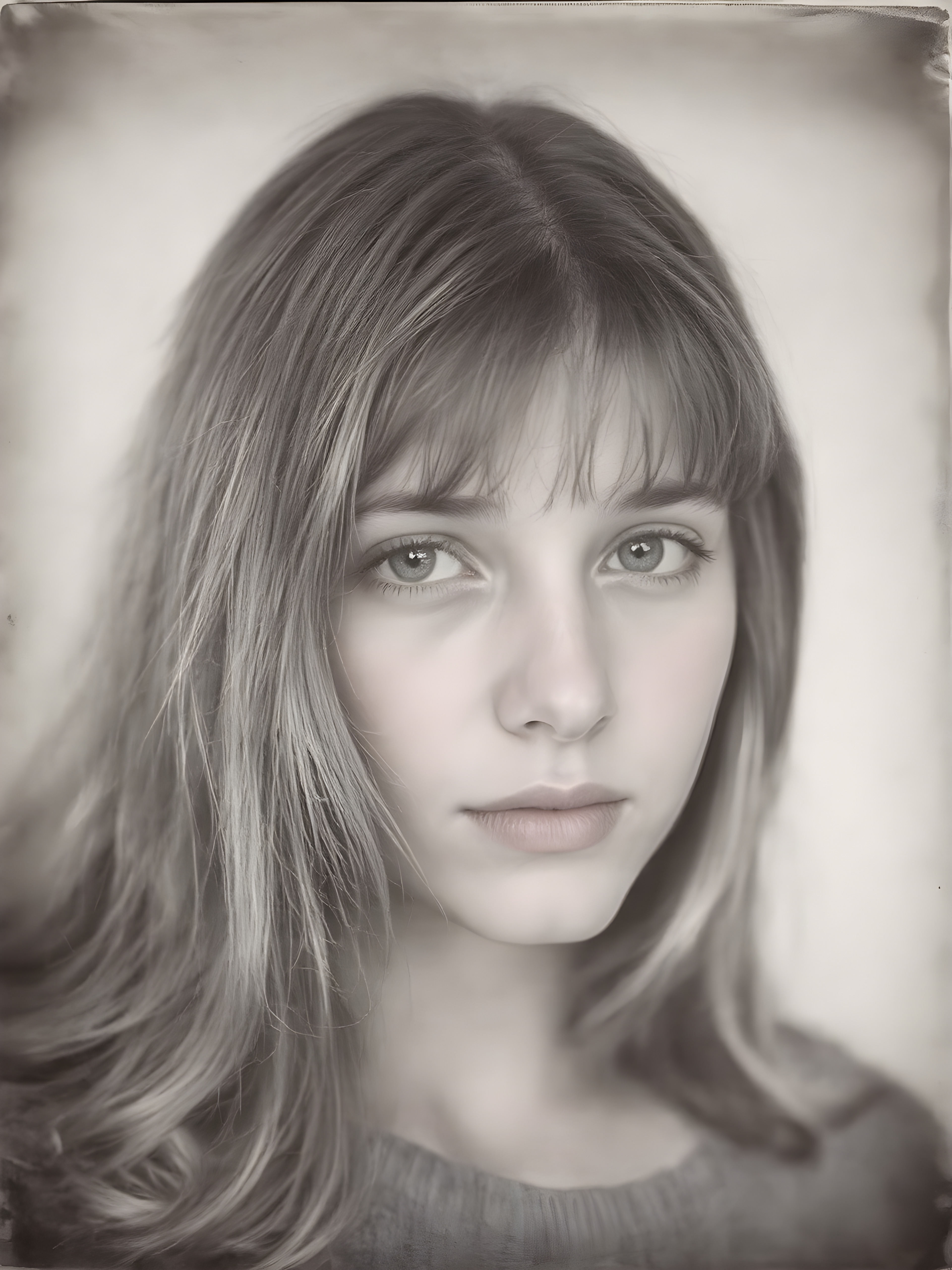 an old ((black and white close-up polaroid photo)), a breathtakingly realistic (((portrait))), capturing the essence of a youthful teen girl with a flawlessly proportioned upper body, long, straight soft hair, bangs cut, aged 15, wears a thin wool sweater, posed confidently before the viewer, ((a white canvas as a background)), ((side view))