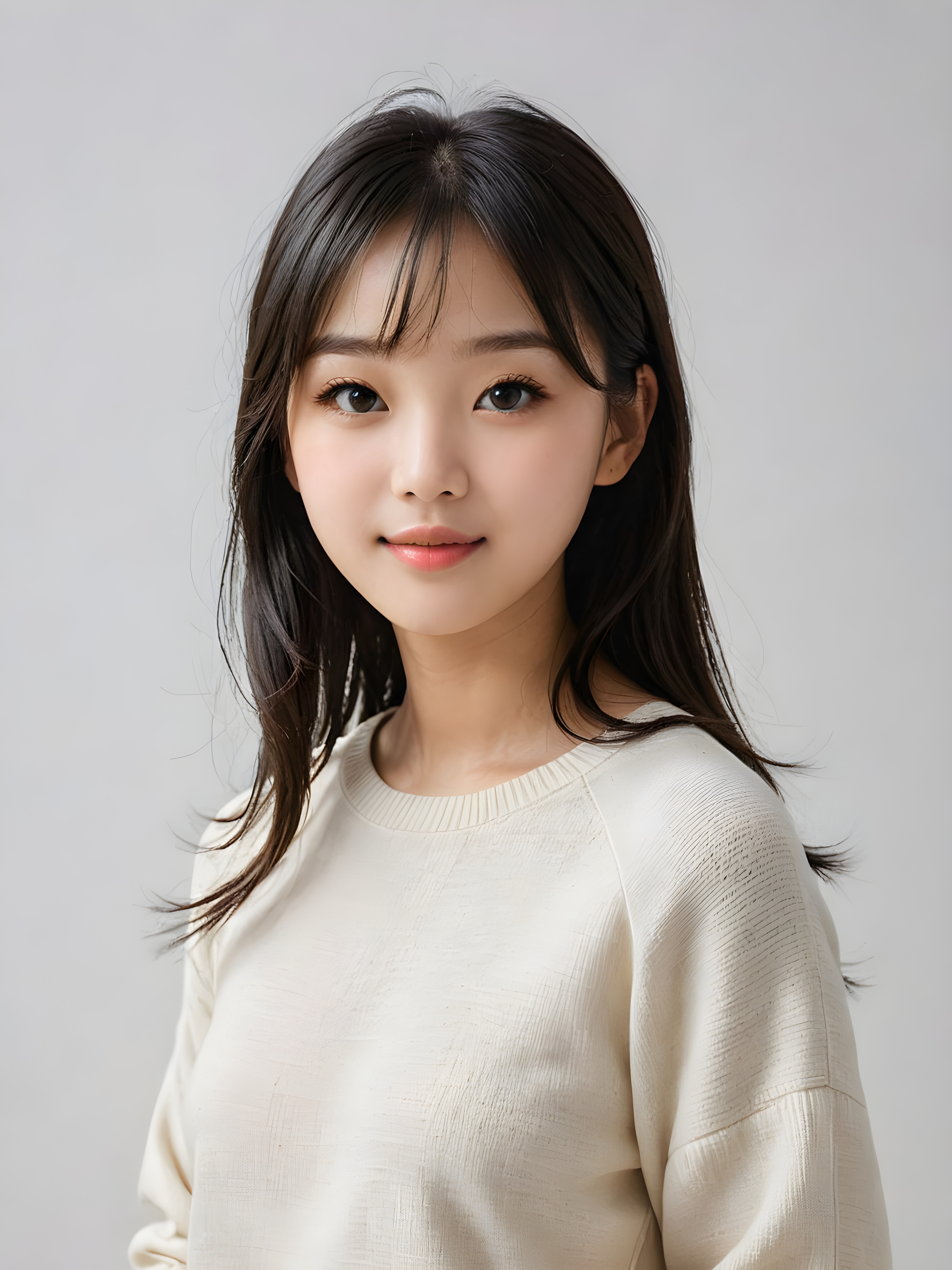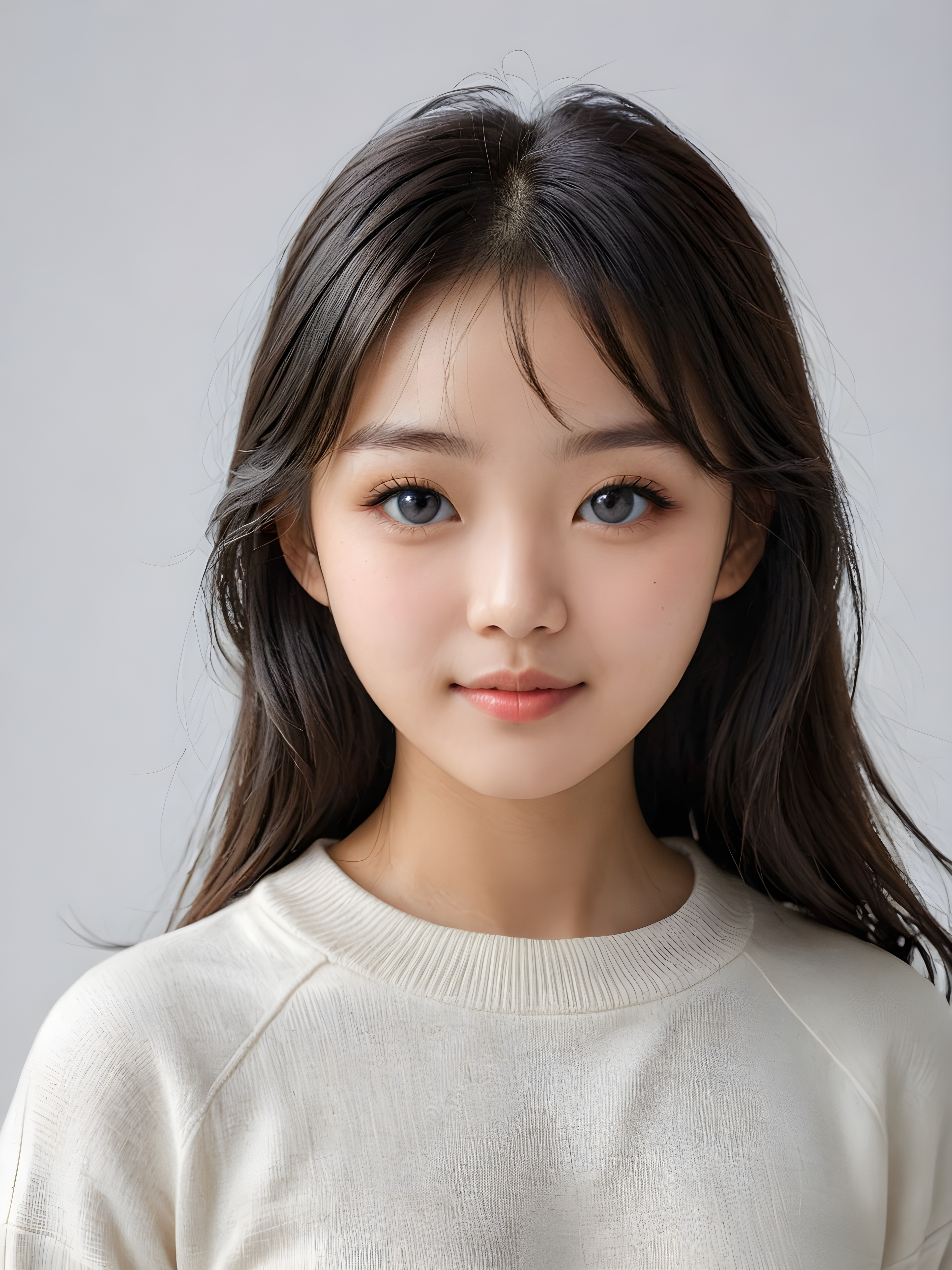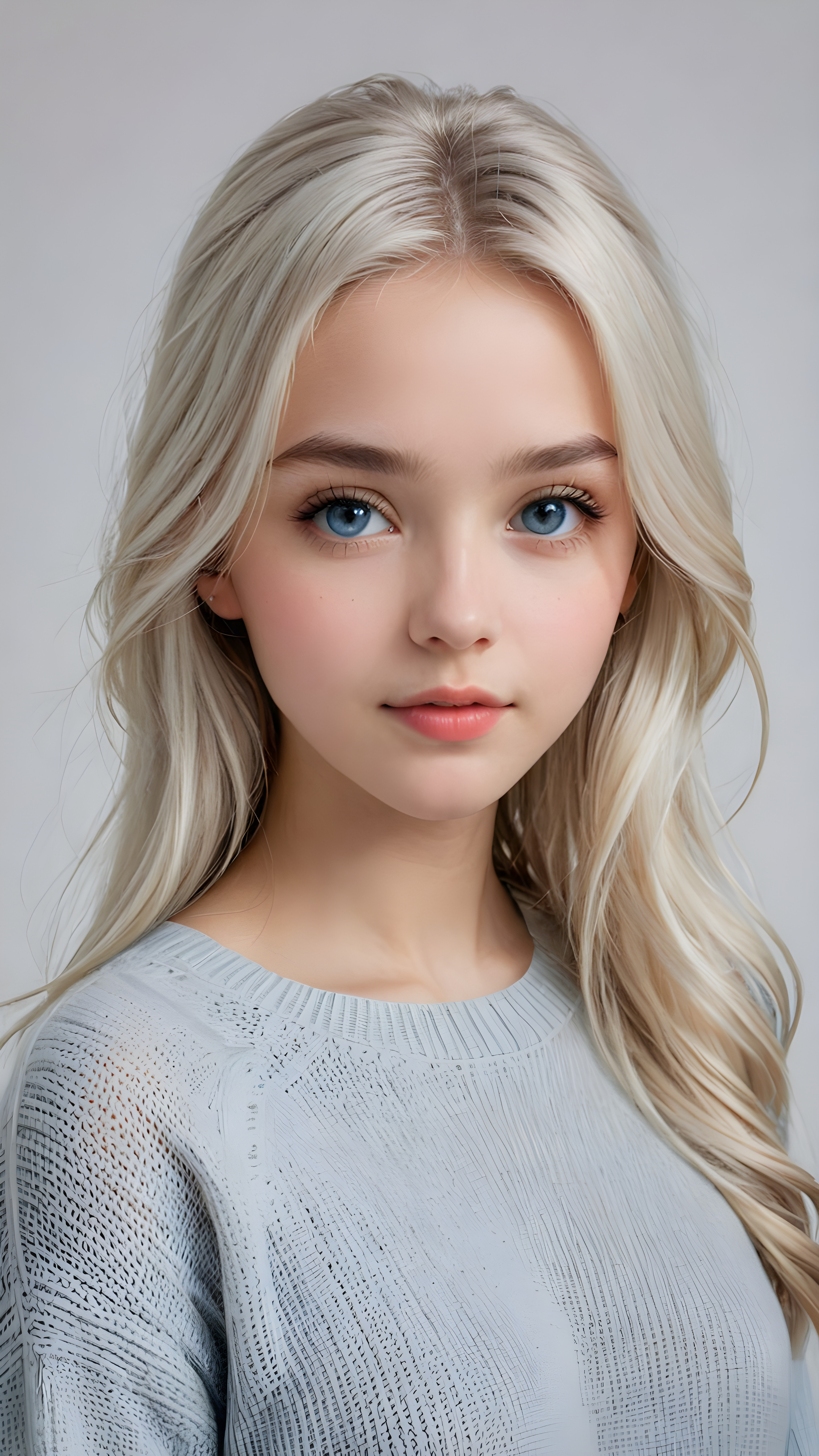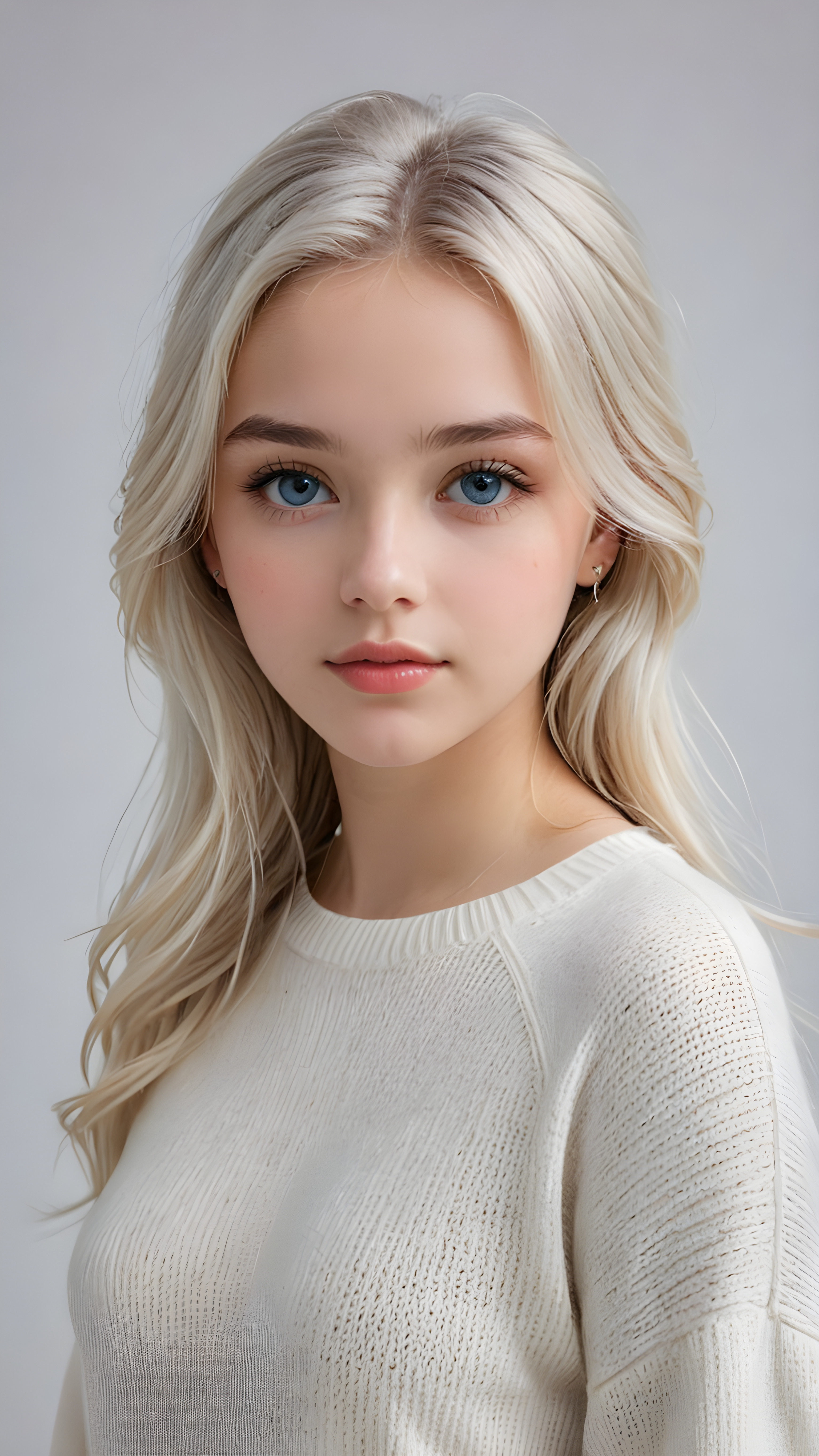 a breathtakingly realistic (((portrait))), capturing the essence of a youthful teen girl, with a flawlessly proportioned upper body, perfect curved fit body, long, straight, soft and sleek white hair, flawless, beautiful smooth skin, round angelic face with full kissable lips, wears a thin and super sleek wool sweater, light blue eyes, posed confidently before the viewer, ((a white canvas as a background))