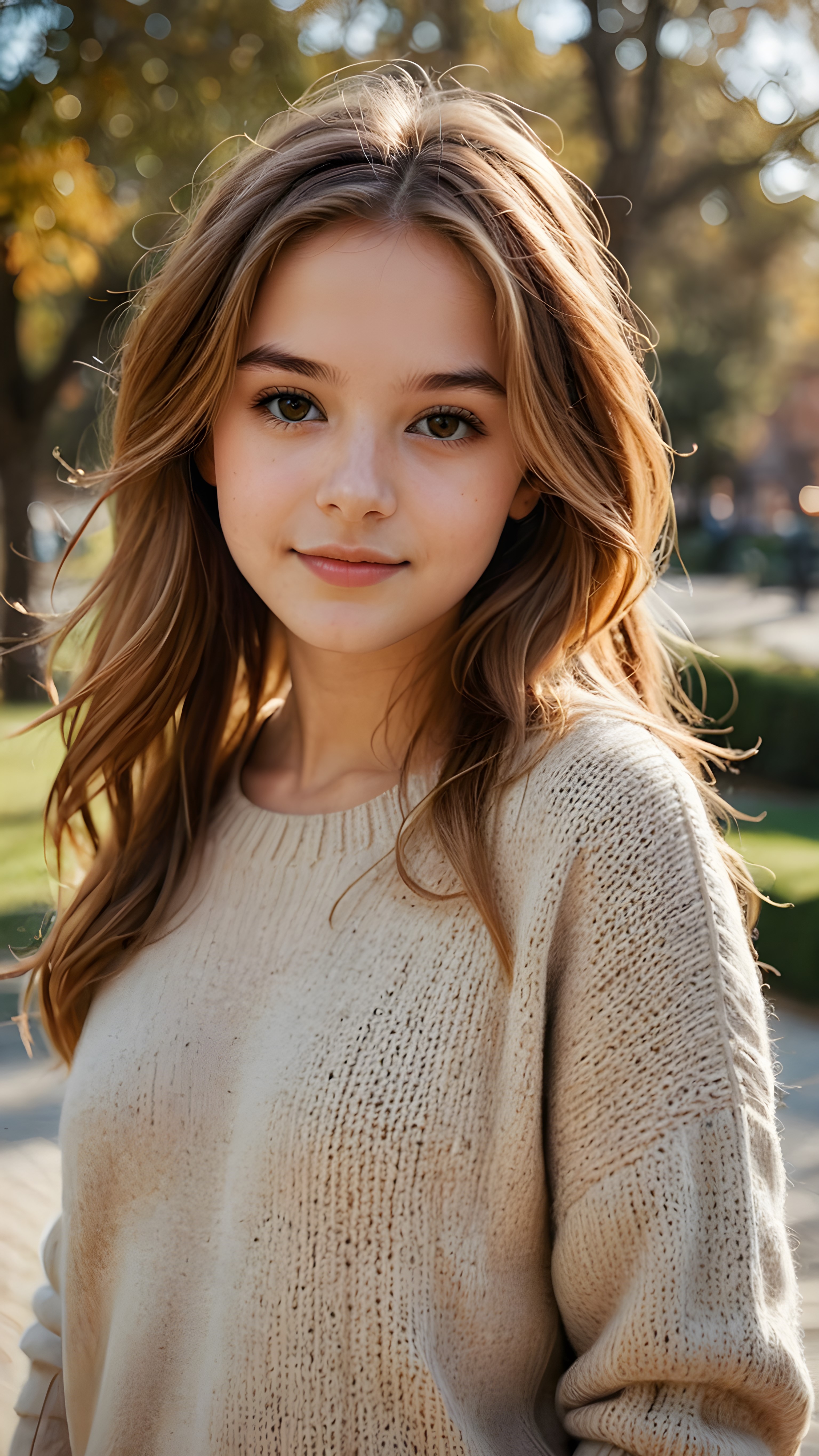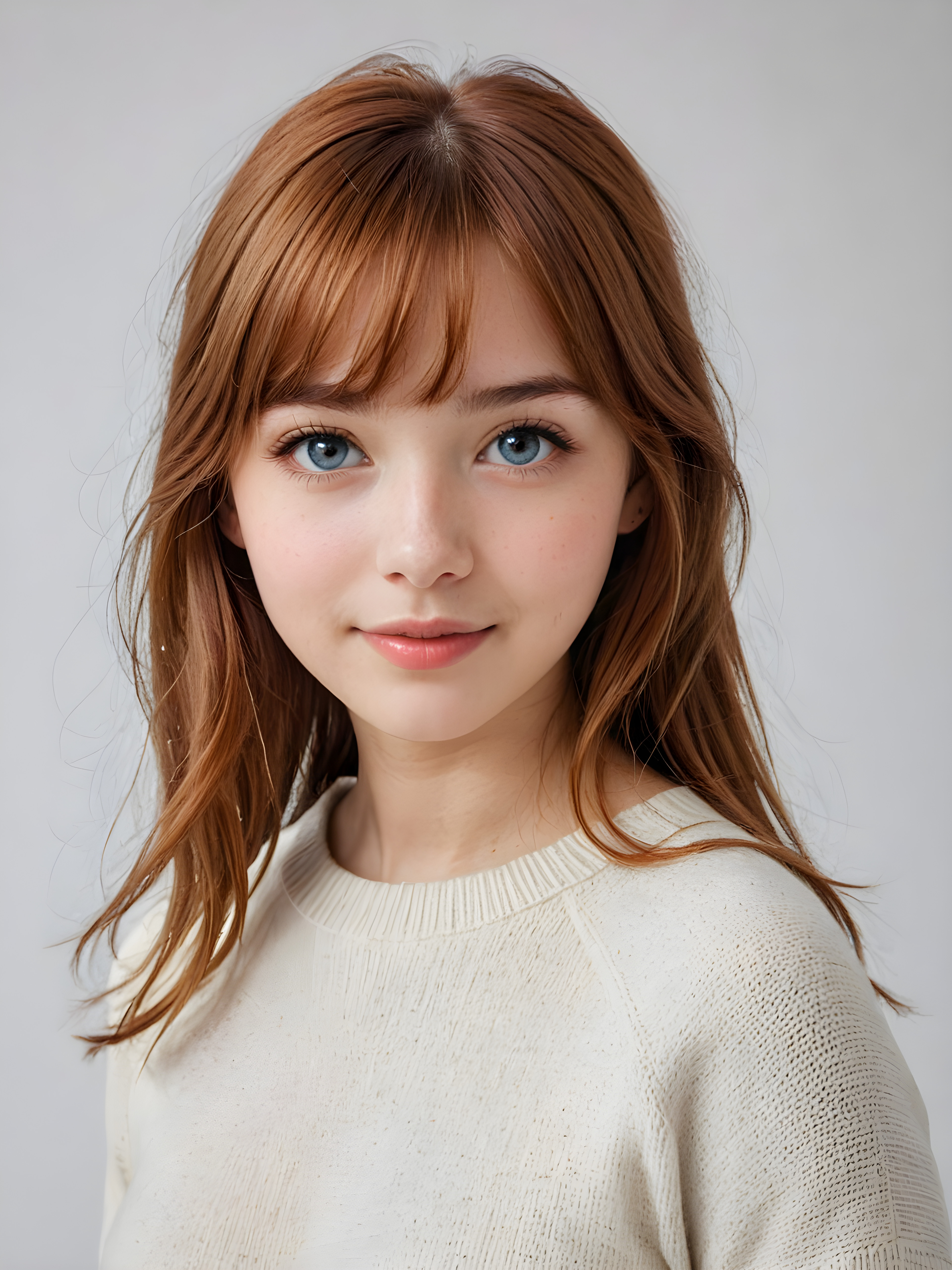 super realistic and detailed portrait: a (((red-haired woman/teen-girl, AGE years old with perfect, fit curved body))), her shoulder-length soft hair framing her smile, full kissable soft lips, stands confidently in a (((natural forest))), ((round, angelic face)), ((she is wearing a soft, white sweater)) ((perfect shadows and light)) ((view from above))
