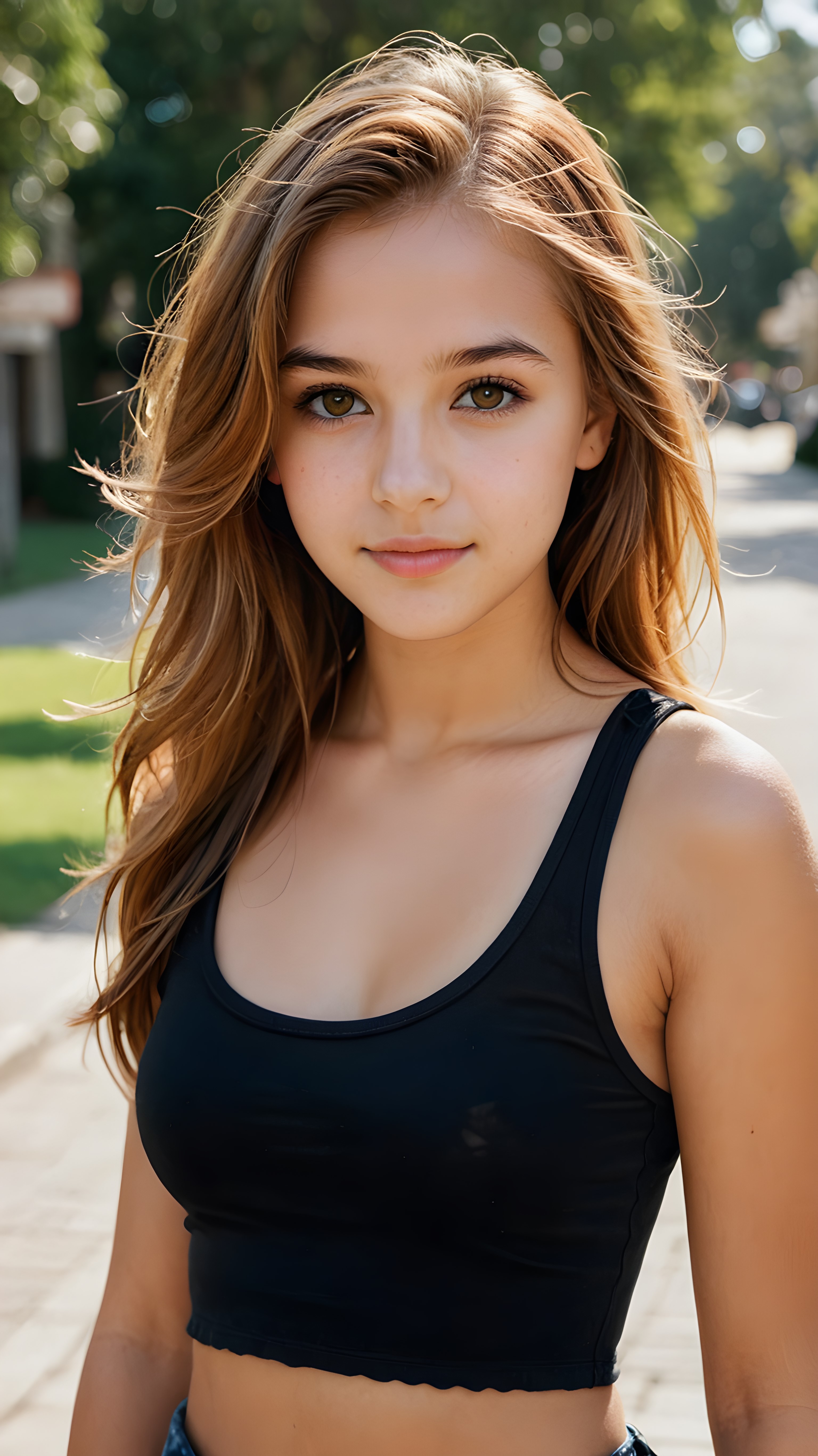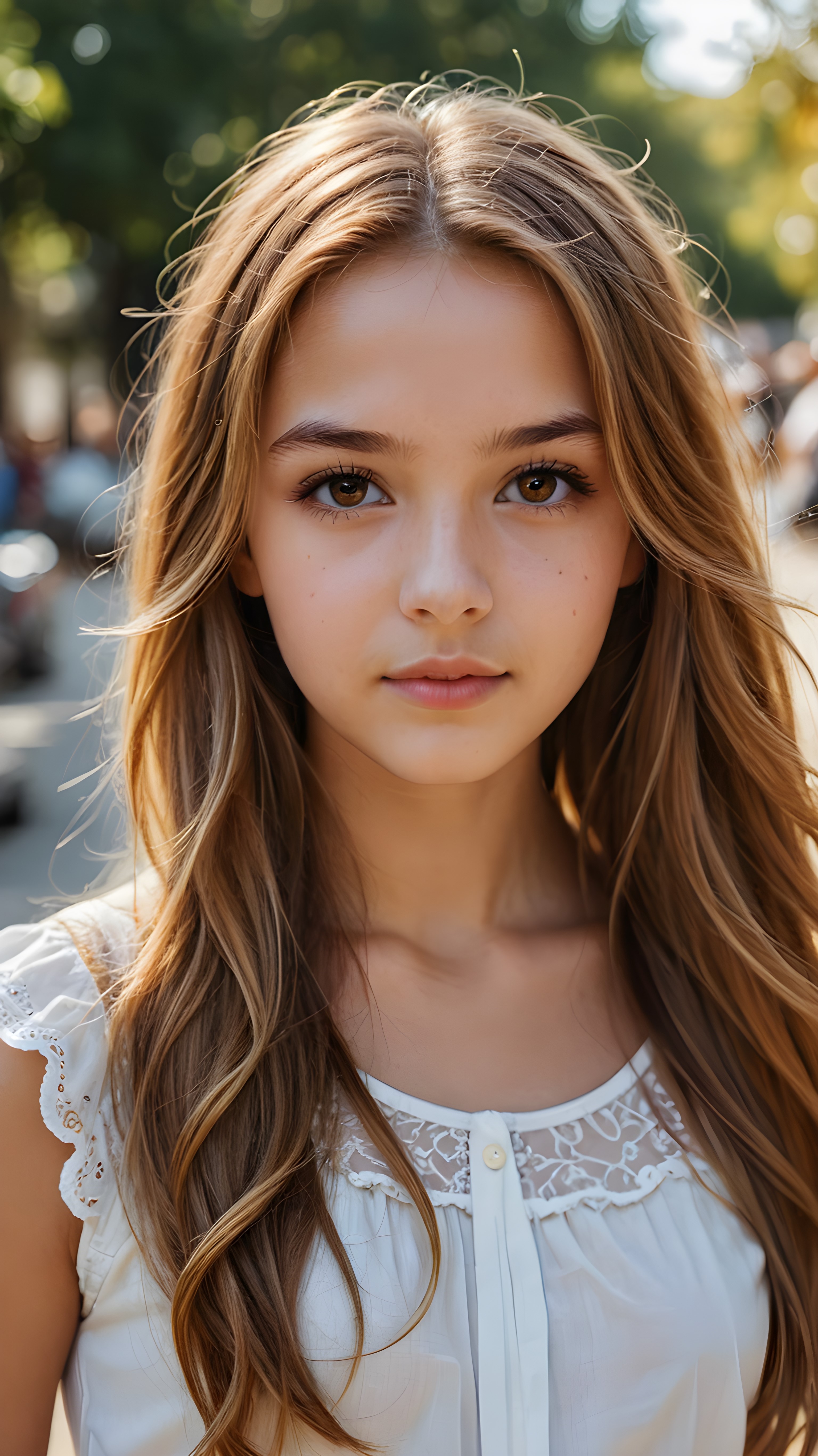 a (((detailed and realistic portrait))) featuring a (((beautifully teenage girl))) with long, flowing (caramel-toned) hair, an angelic face framed by (brown eyes), who looks directly into the viewer’s camera, her form exquisitely proportioned and clad in a (attribut)