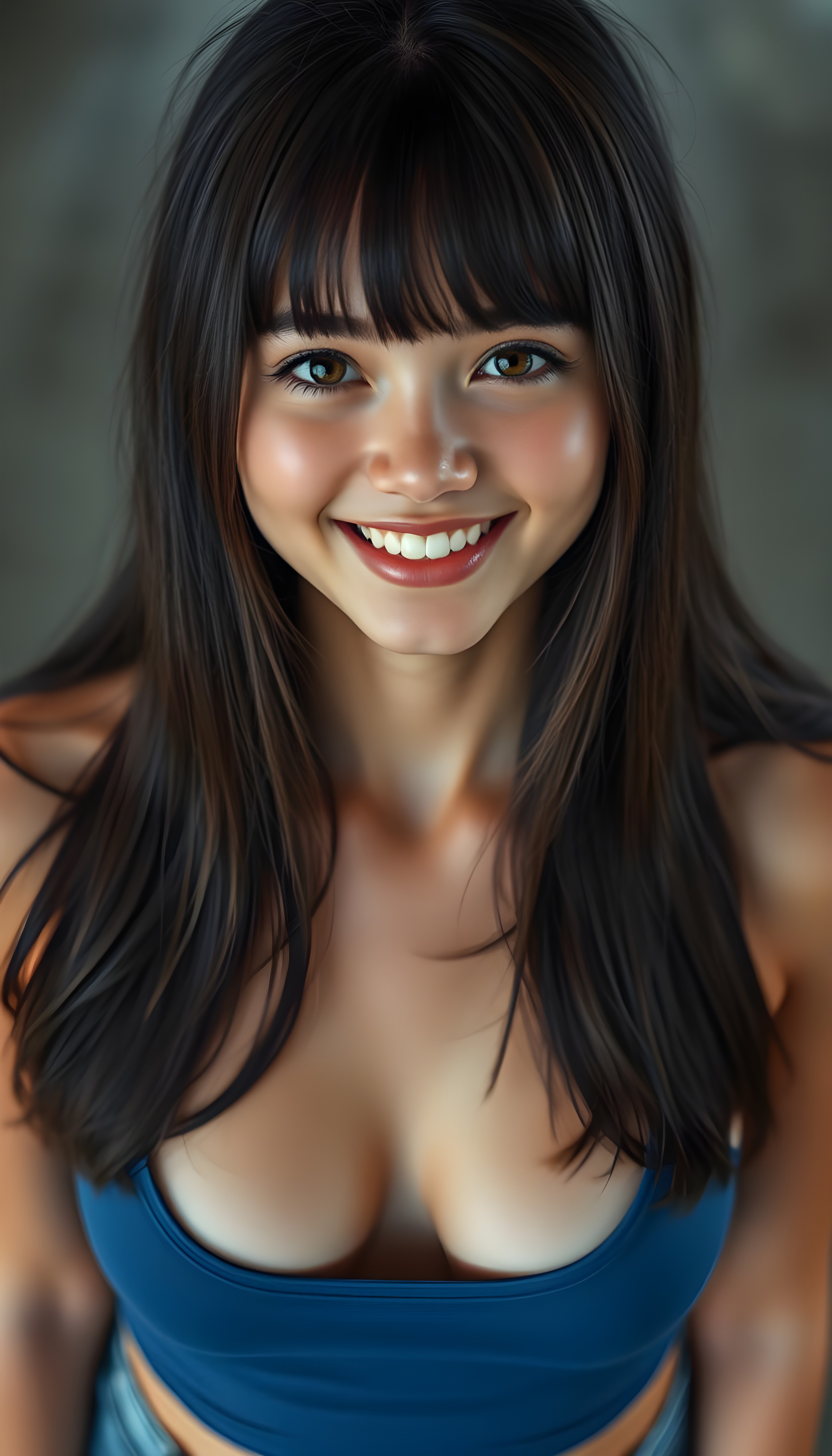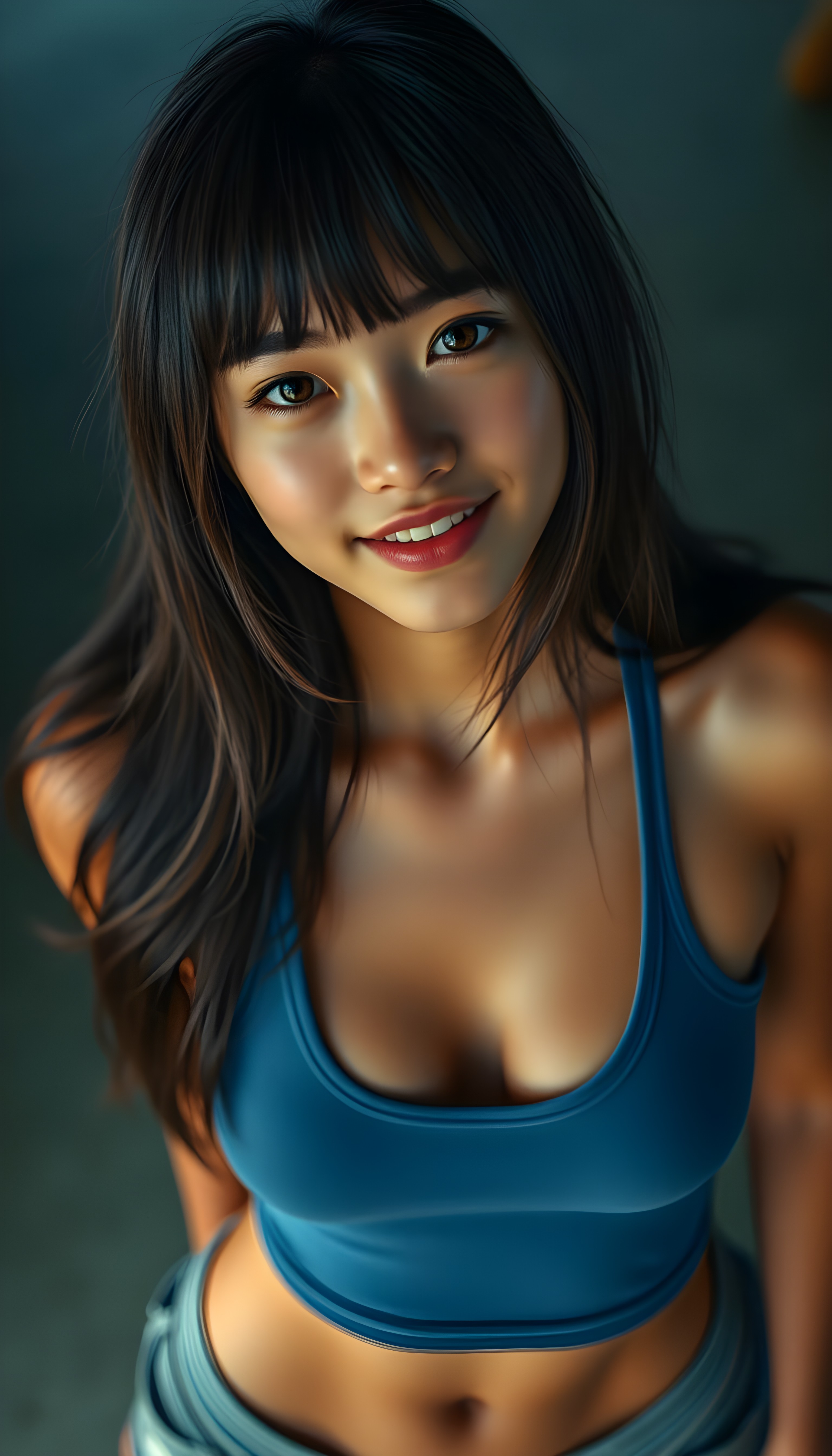 a joyfully cute (((young tanned teen girl))), with long, soft straight black hair and brown highlights, the hair falls gently over her upper body and is the same length on both sides, bangs cut frame her round face, exquisitely detailed amber eyes, dressed in a sleek, form-fitting blue (((cropped tank top, deep neck))), she has a perfect curved fit body, full lips, her expression radiating pure elation towards the viewer, detailed, realistic, 4k, view from above.