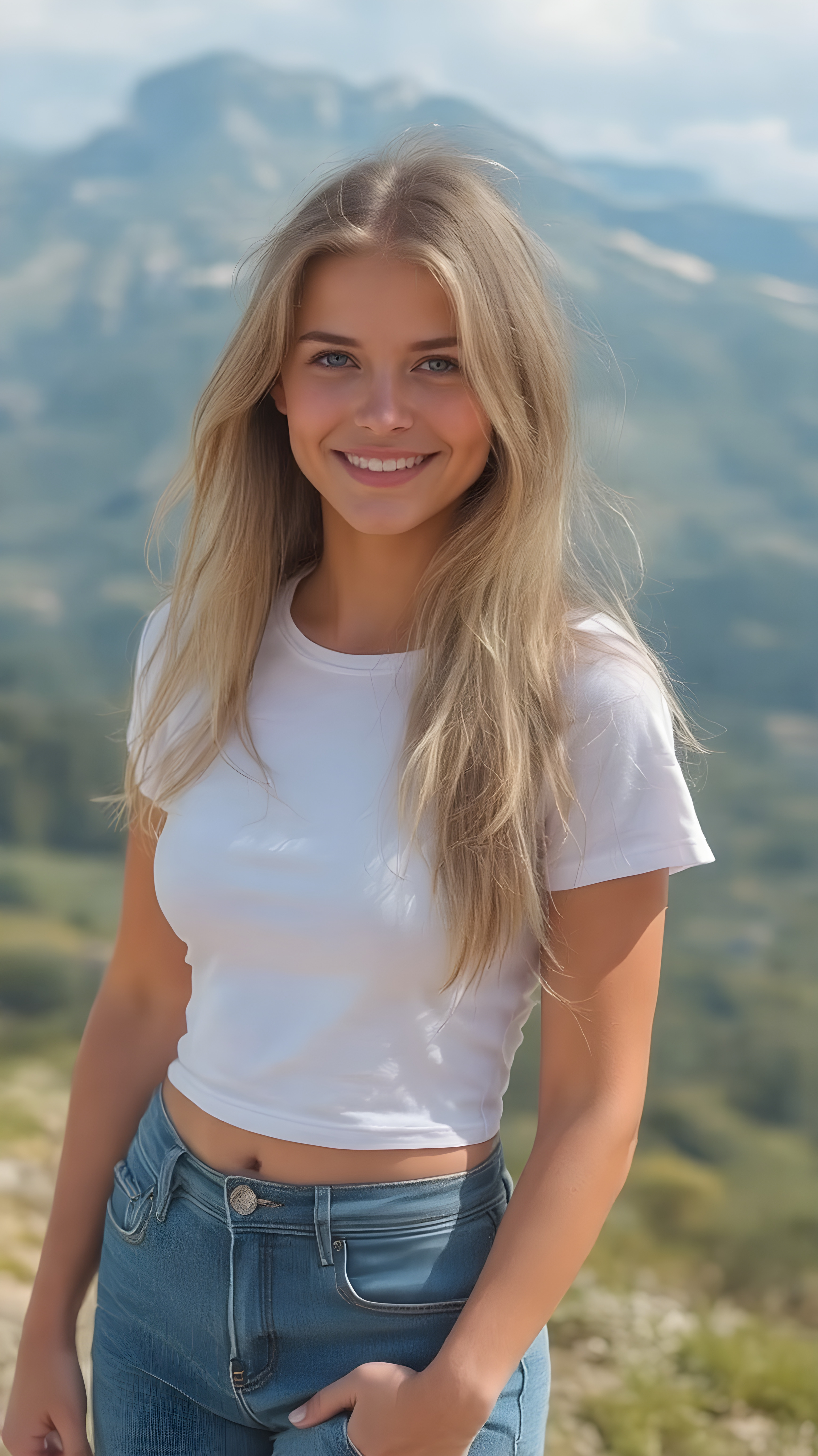 A (((highly detailed and hyperrealistic full length body shot))), at (((the peak of the summer season))), with the (((cutest young adult tomboy girl)) in a ((super short tight white t-shirt and blue jeans)), her (((skin is brown and kissed by the sun’s rays, creating a lovely tan line))), her (((blond hair is long, straight and silky, framing her face beautifully))), and (((her (((happy smile is the most beautiful sight on earth))), giving a natural and youthful glow to her face. She is (((out in the mountains, in a serene outdoor setting))) where her (((smile shines brightly against the backdrop of nature))). This advanced prompt captures her in a (((very tasteful and accurate depiction of her full body))), emphasizing her (((youthful vitality and natural beauty))).
