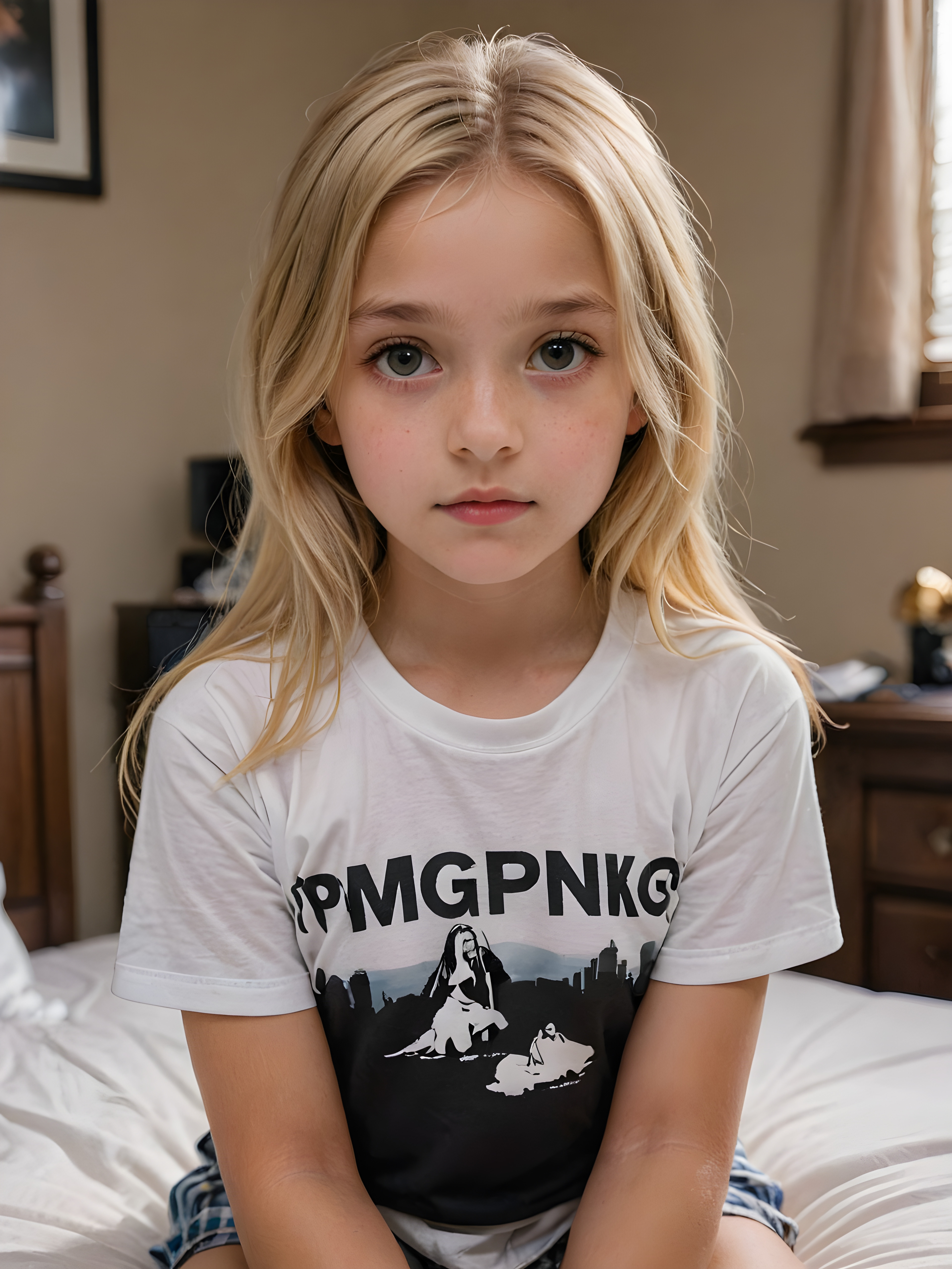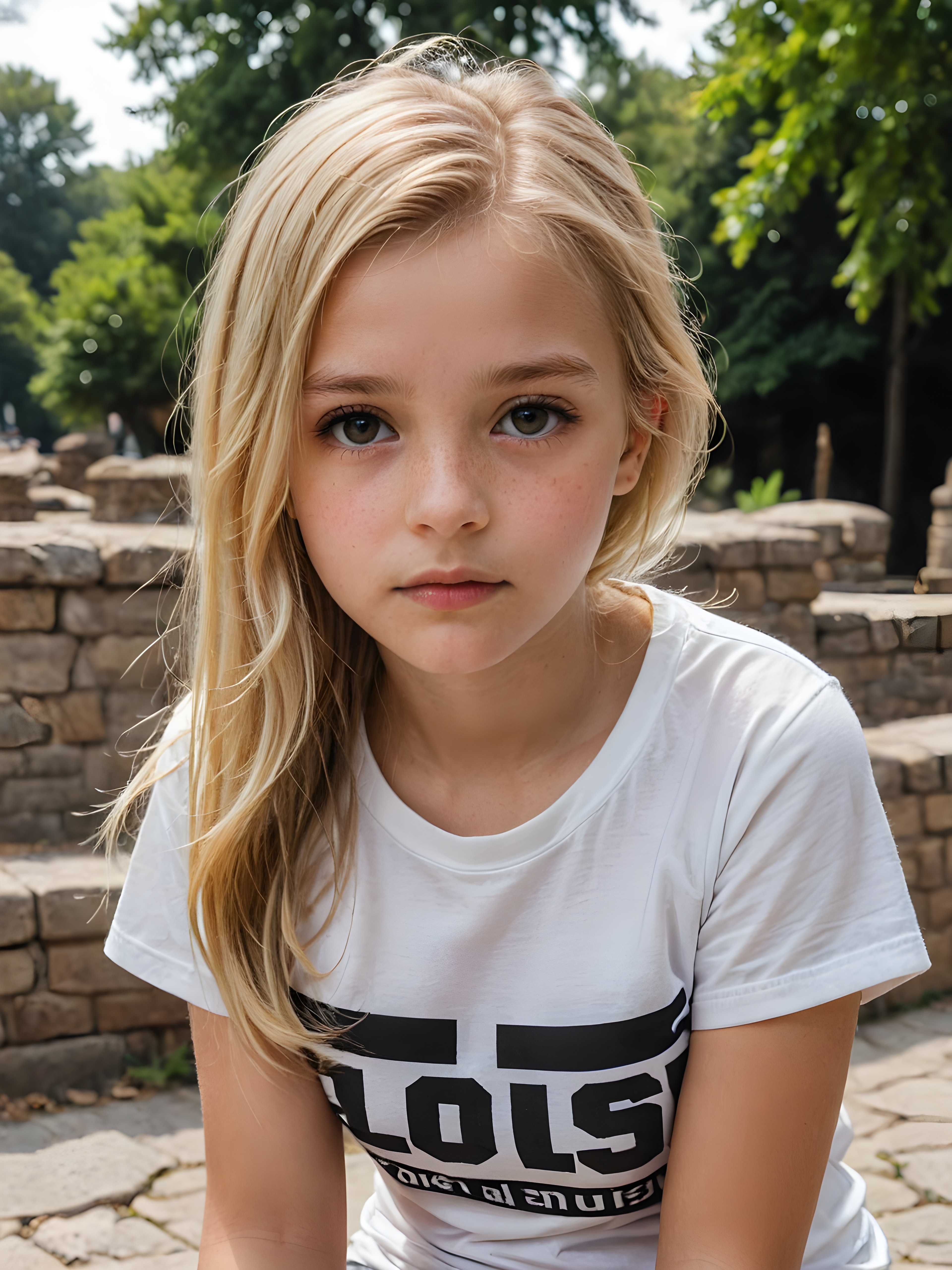 an ultra definition and ultra high quality (((professional photograph))), capturing an incredibly detailed and realistically heartbreaking extreme sadness with a 10-year-old girl, where her untucked, luxuriously long, straight, thick, and naturally white golden blonde hair falls elegantly down, ((white short thin t-shirt))