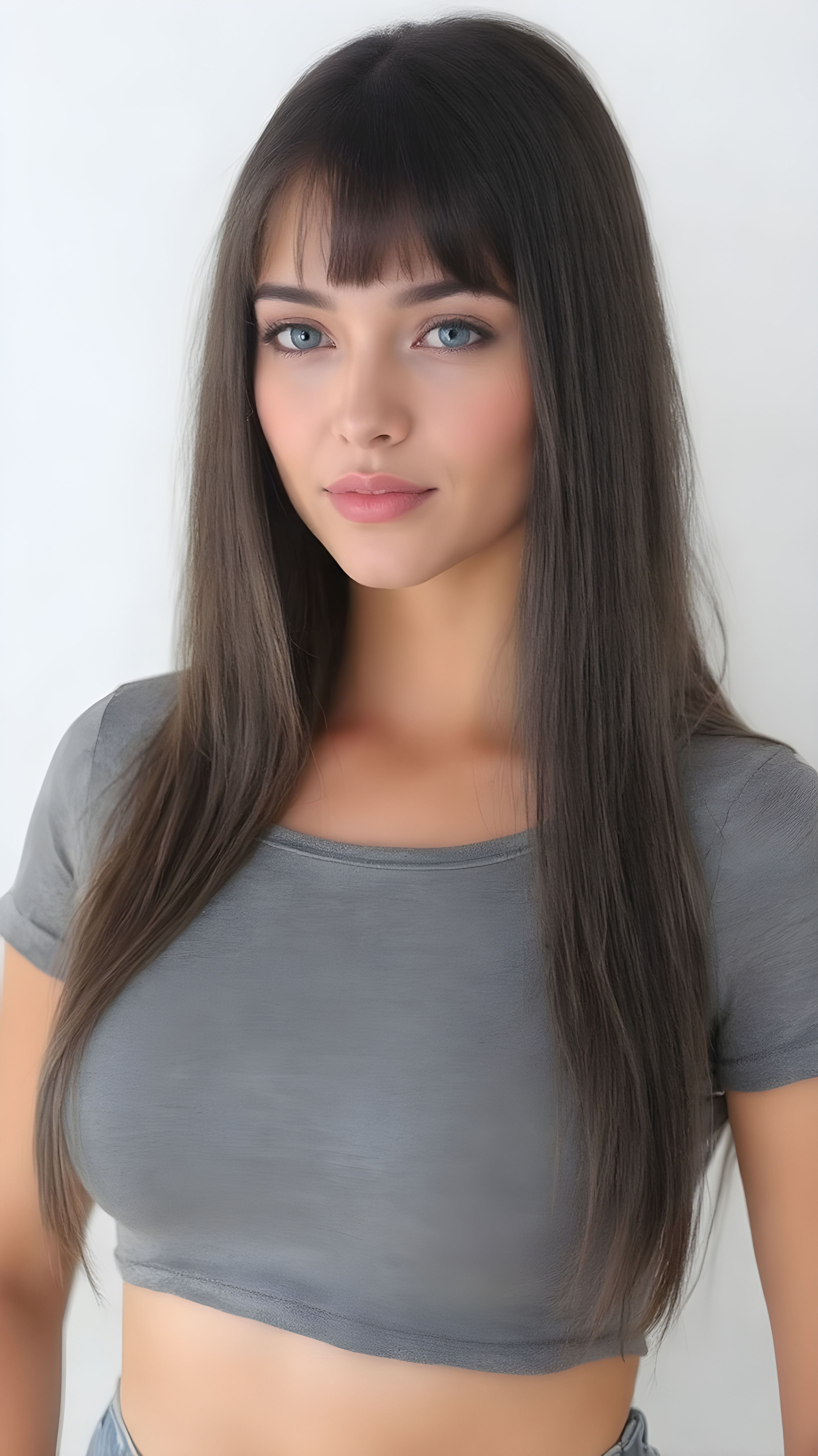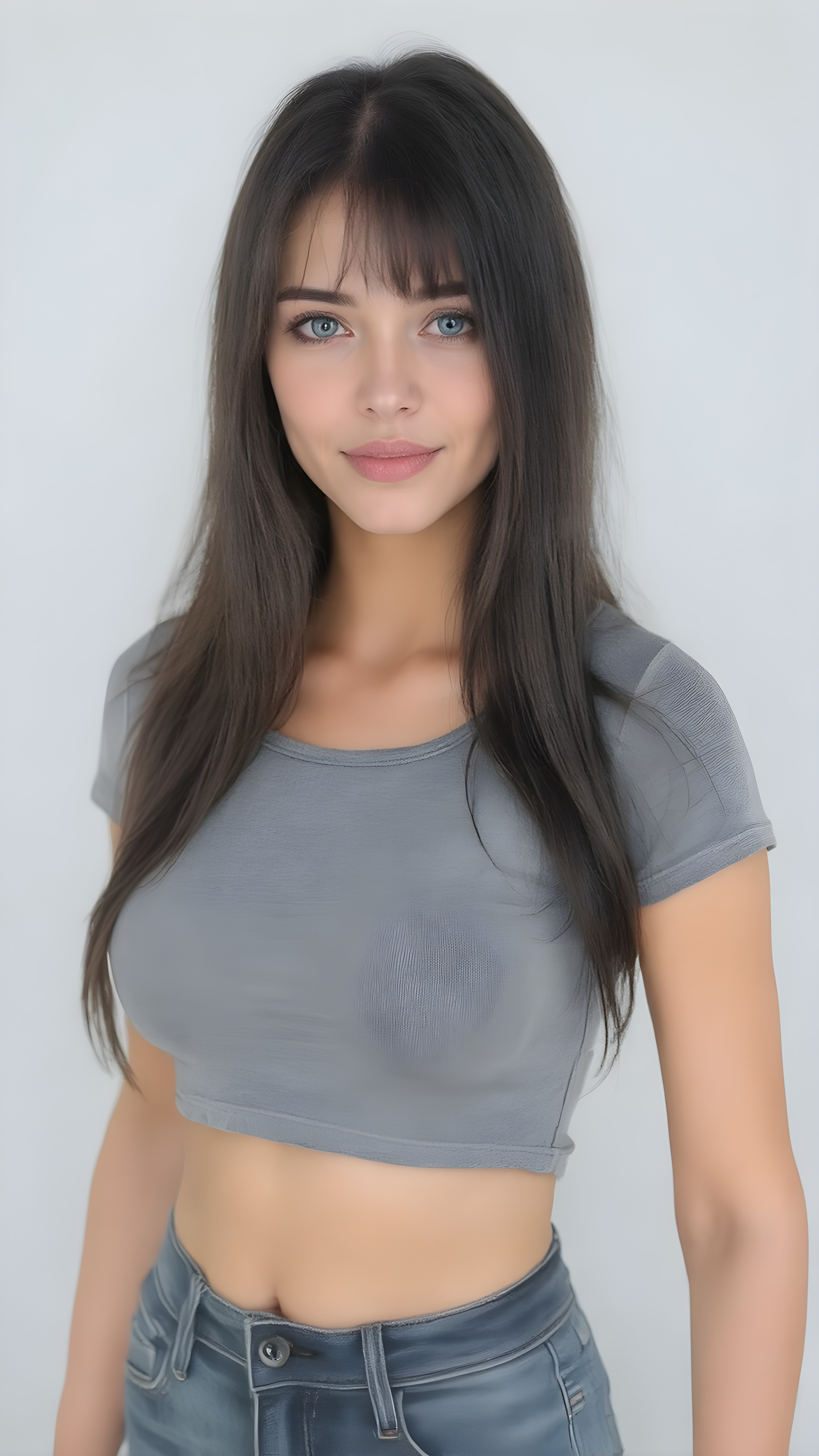 generate me a beautiful, detailed and realistic well busty girl with soft long black straight hair, round, beautiful face, light blue eyes, plump lips, full mouth, perfect body, she wears a short, ((tight cropped grey t-shirt with deep neck)), belly button, has a feminine shaped body, she wears short, tight jeans pants, her smooth legs are flawless, ((side view)), white teeth and smile, light grey backdrop, 200 mm