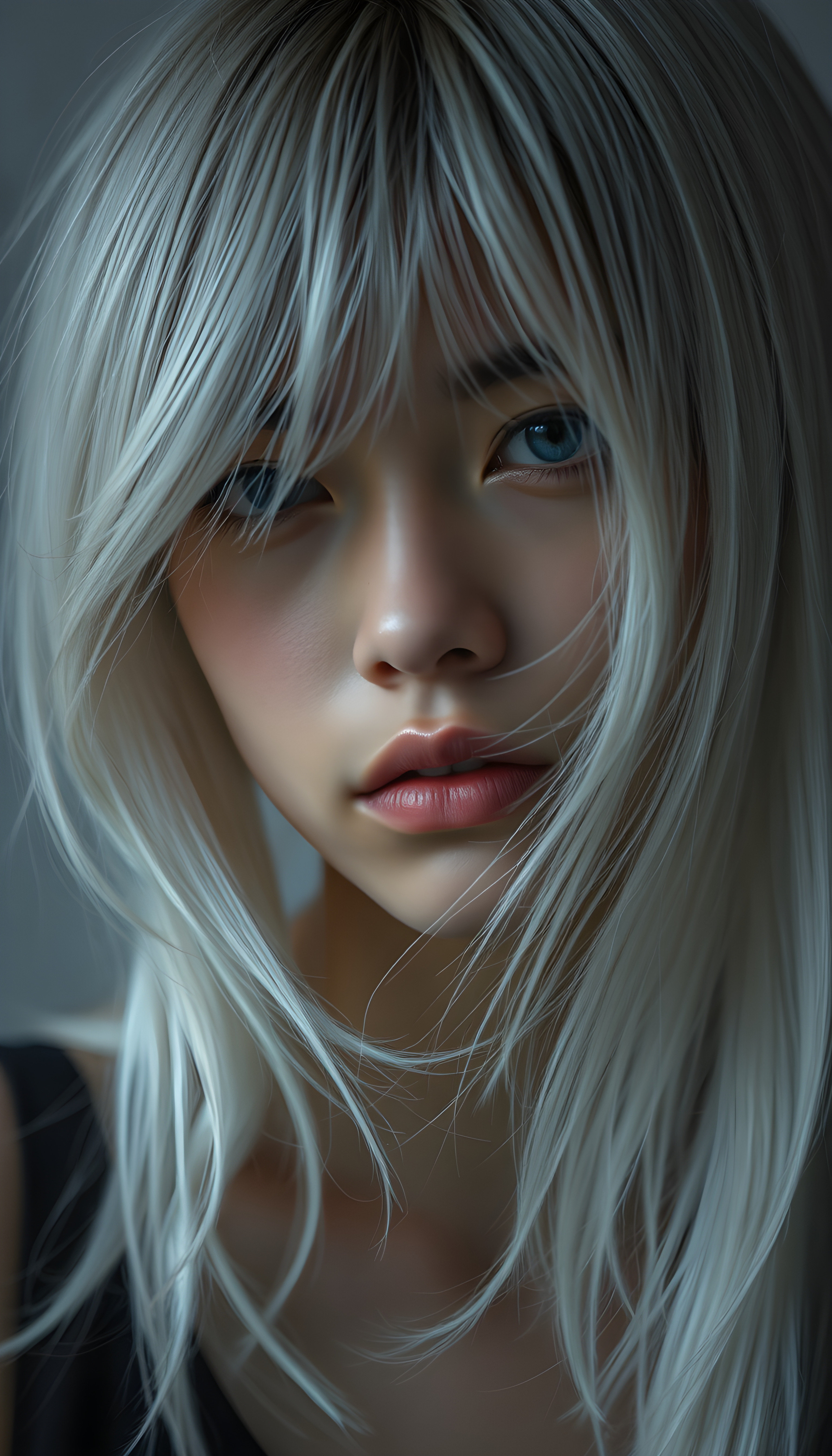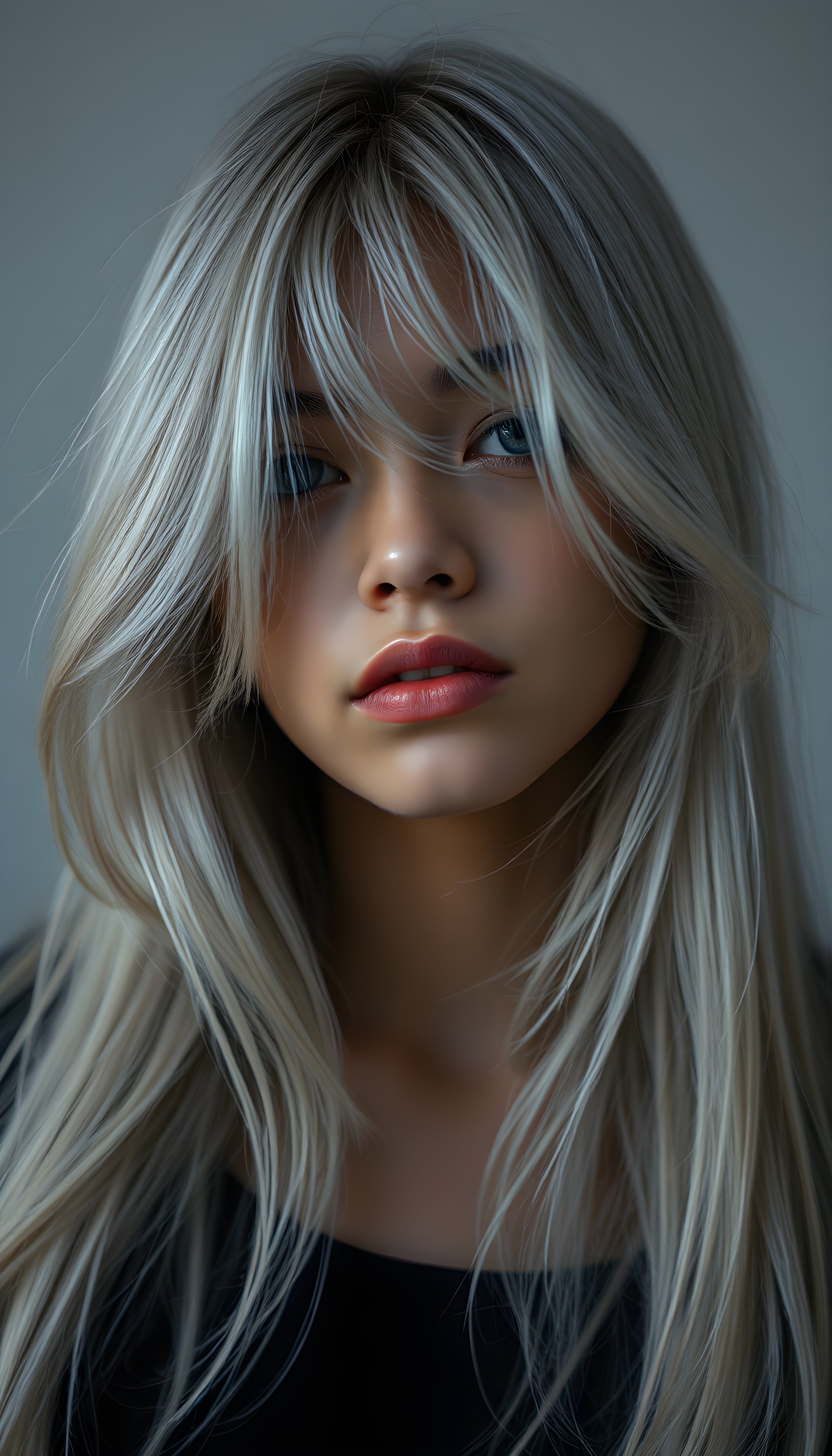 a beautifully drawn (brown-skinned teen emo girl) with flowing, softly waving (straight white hair) framing her face in side bangs and highlighted by a contrasting light blue complexion, expressing a poignant feeling of melancholy and emotional detachment, set against a softly grey (backdrop)