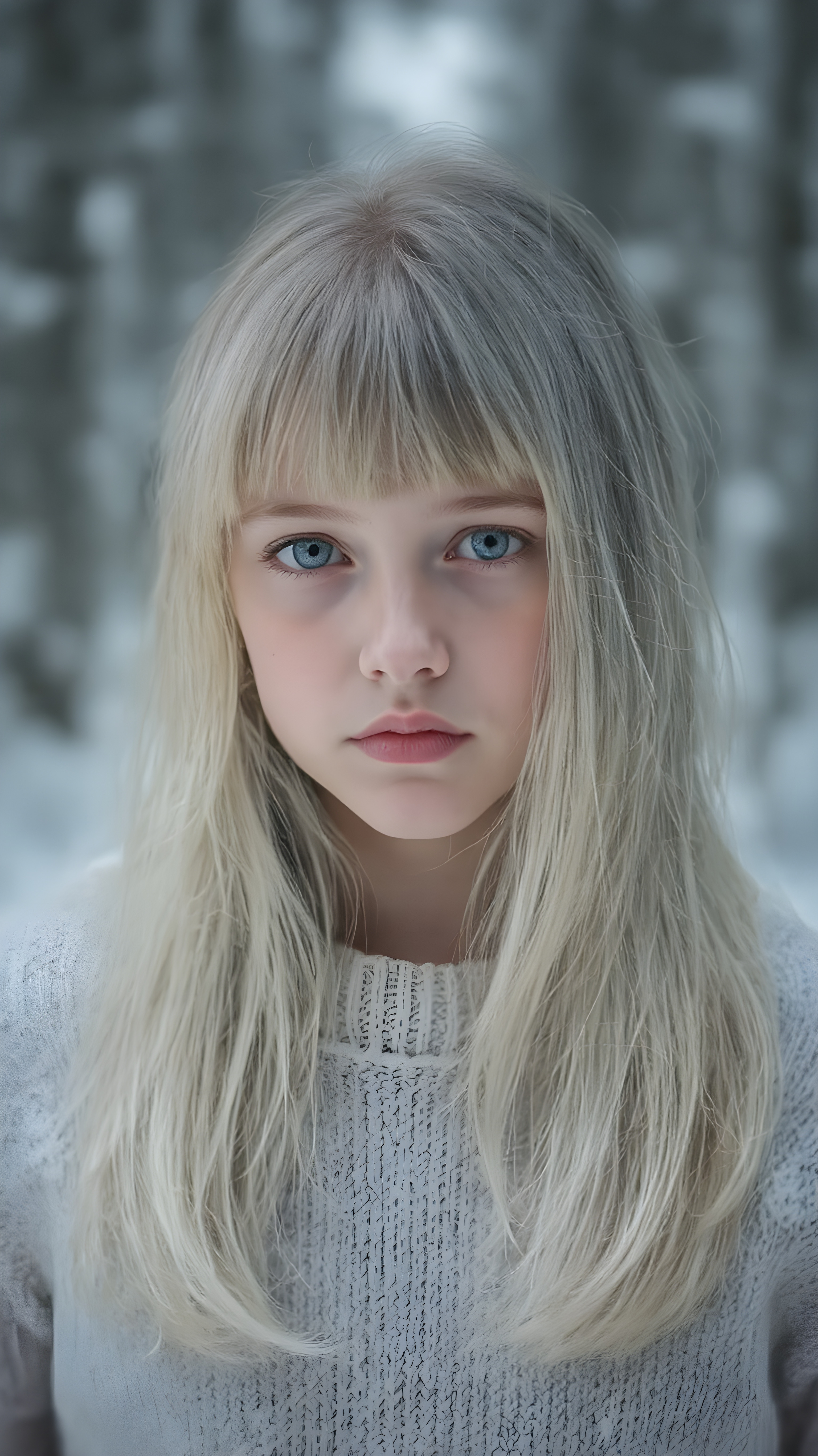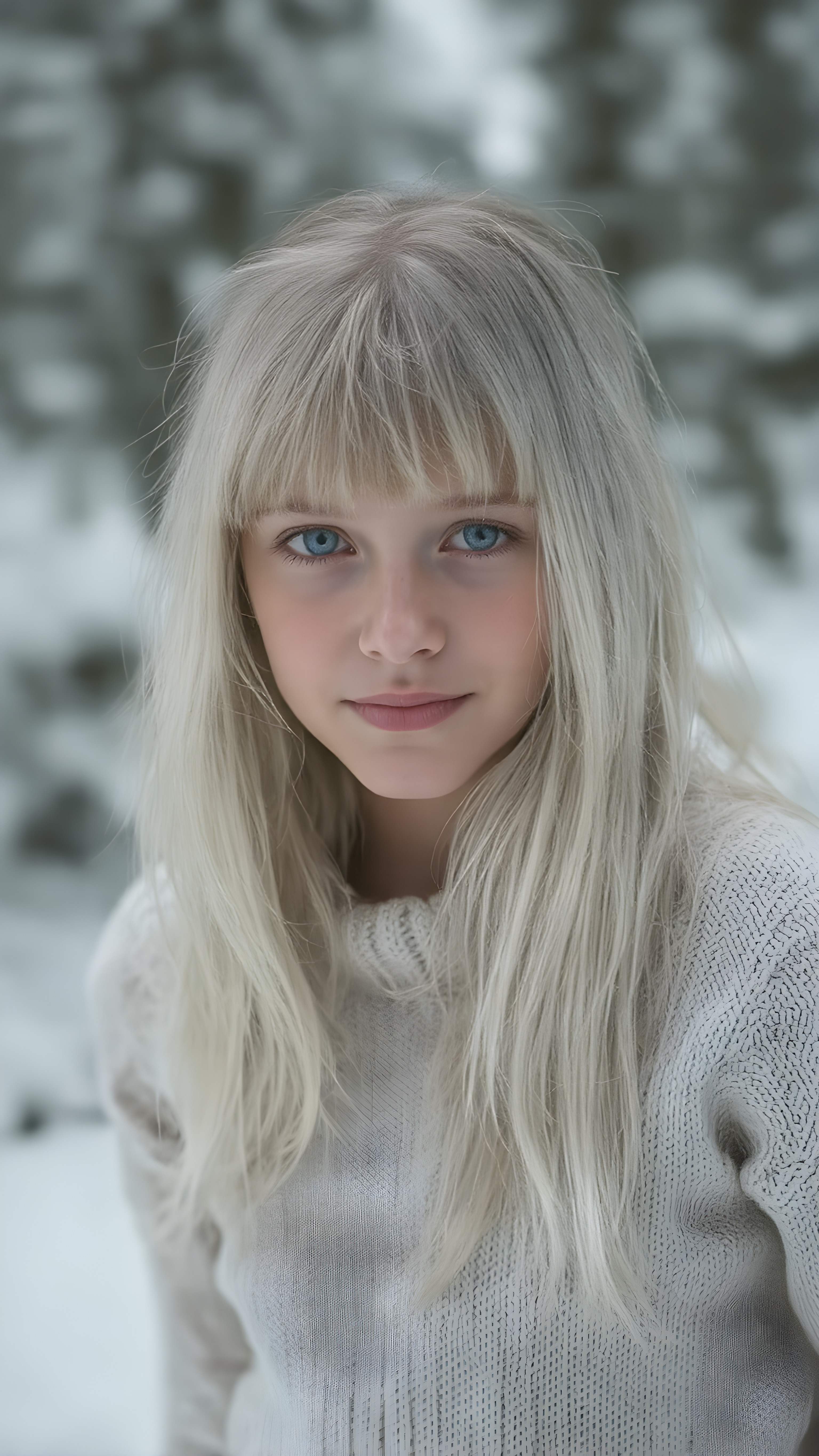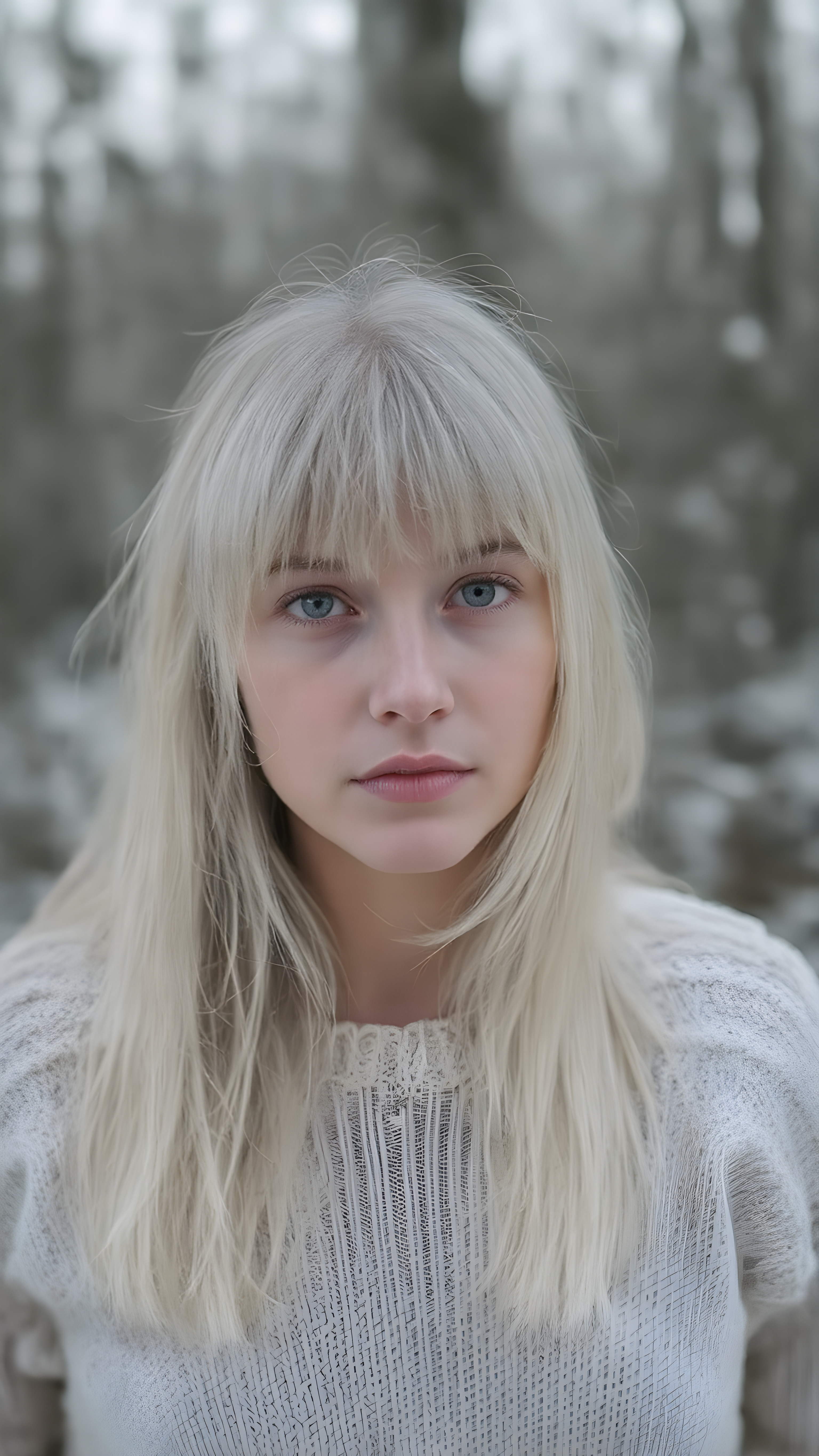portrait from a silver skinned young girl with white soft long straight hair, bangs cut, white dressed in a fine wool sweater, in snow, forest