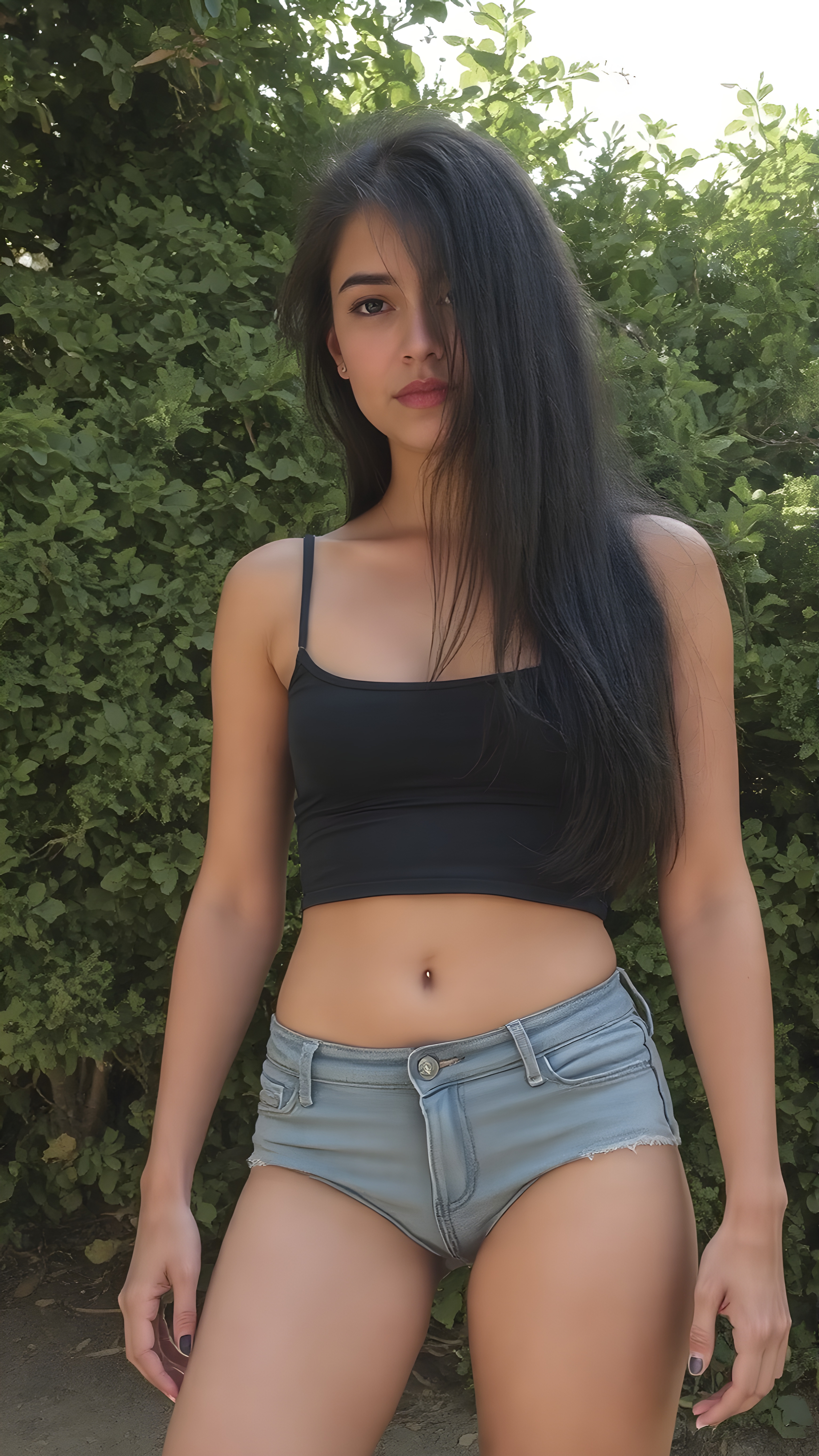 A (((full body view from above of a (((cute young tanned well-busty teen girl))) with long, flowing (((black hair))), framed by her (((skinny yet perfectly proportioned figure))), showcasing her (perfectly toned thighs and (beautifully shaped full hips and bum) in a (tight tank top and (trencher shorts – a cropped top and tight denim shorts)) (((standing confidently))) against (sunny, green backdrop)