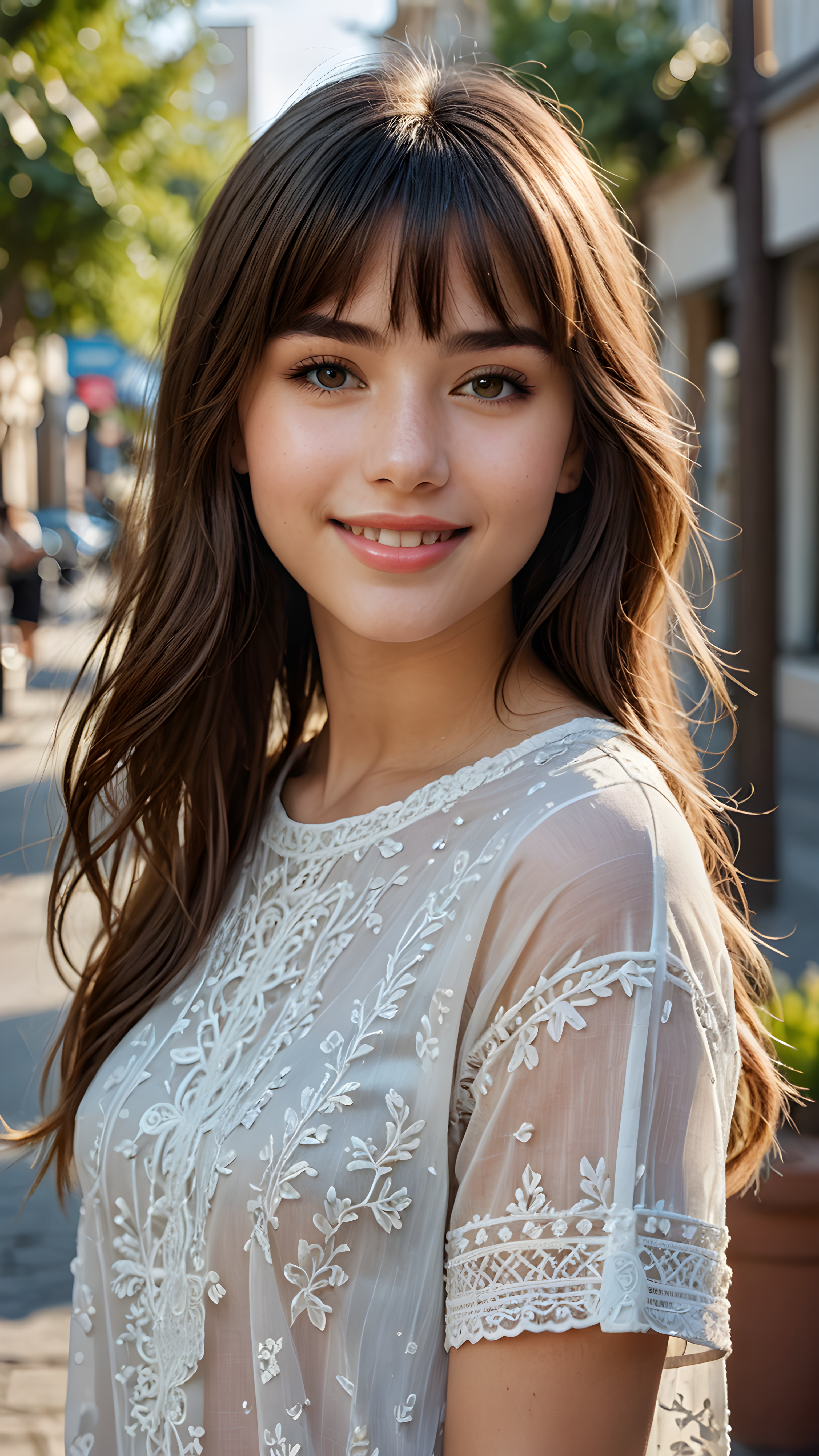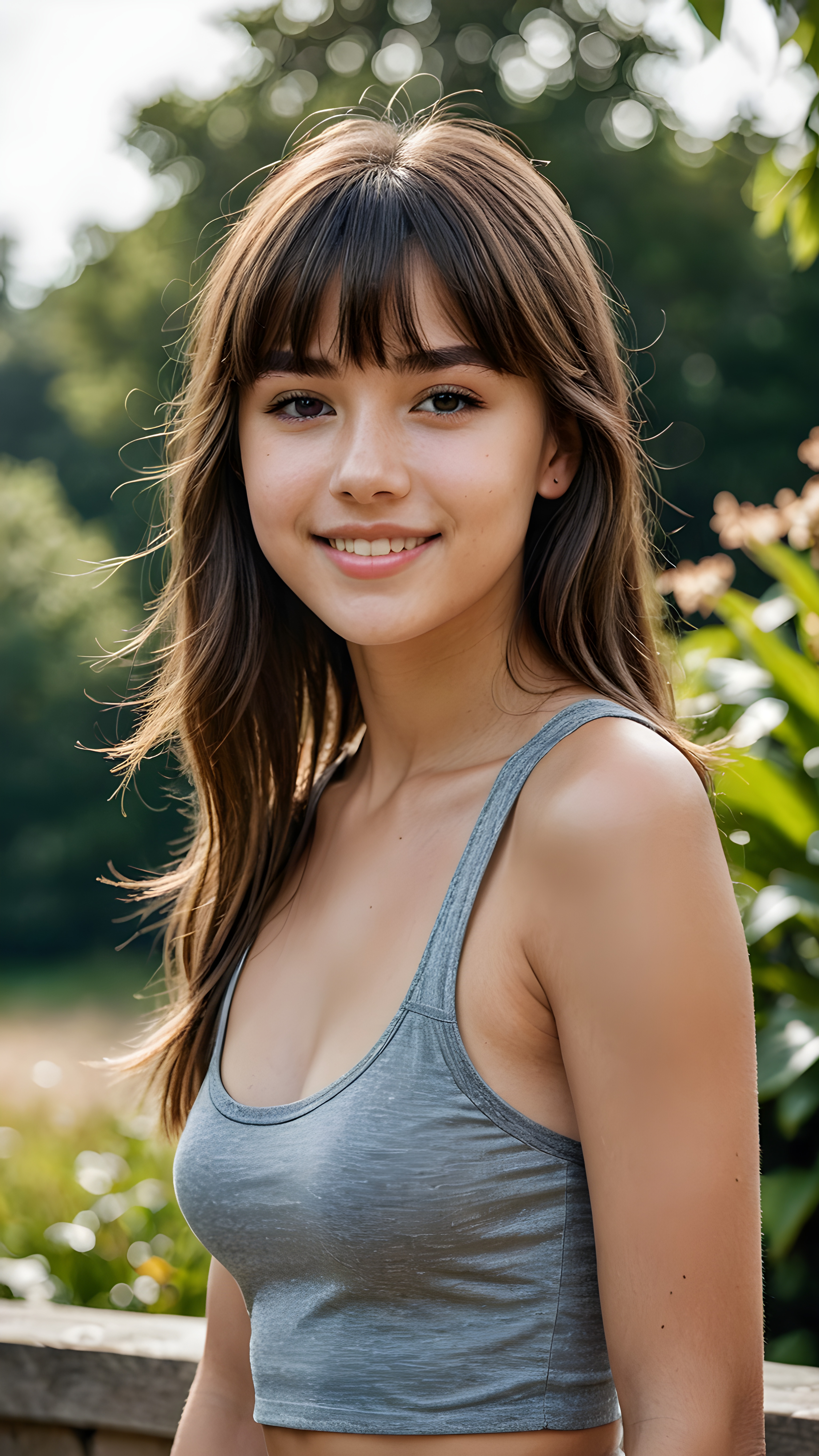 a high quality (((detailed full body photograph))), featuring a (((super realistic face))) with intricate details and perfect proportions, a very young teen girl, long soft straight hair in bangs cut, full lips, smile, cute gorgeous, she wears a short, sport cropped plain grey tank top that support her perfect curved body